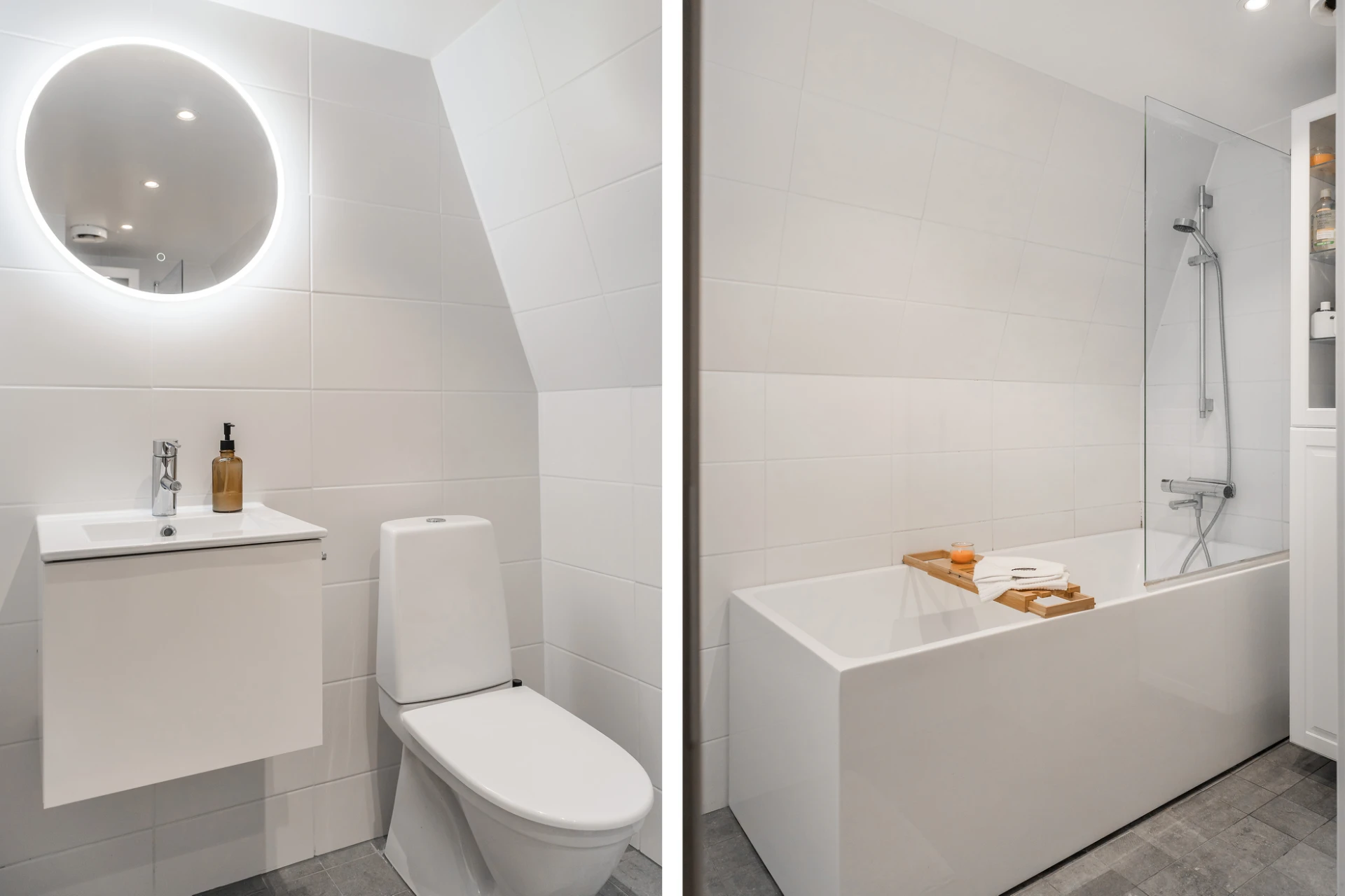 Grå klinker och vitt kakel. Utrustat med badkar med duschvägg, wc, handfat med vit kommod, rund spegel med belysning och högskåp. Elburen golvvärme och infällda spotlights i tak.