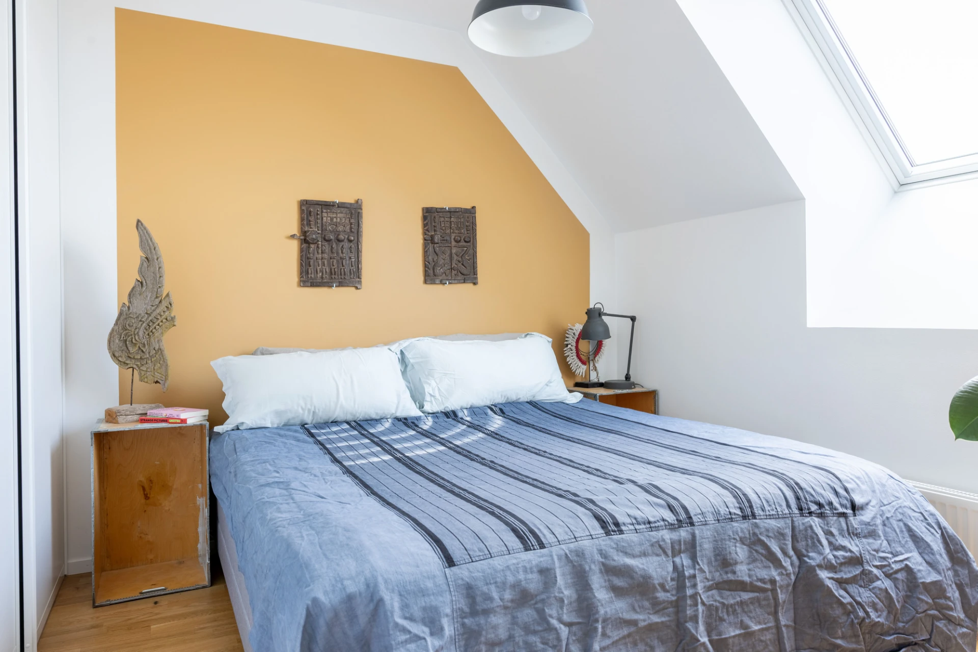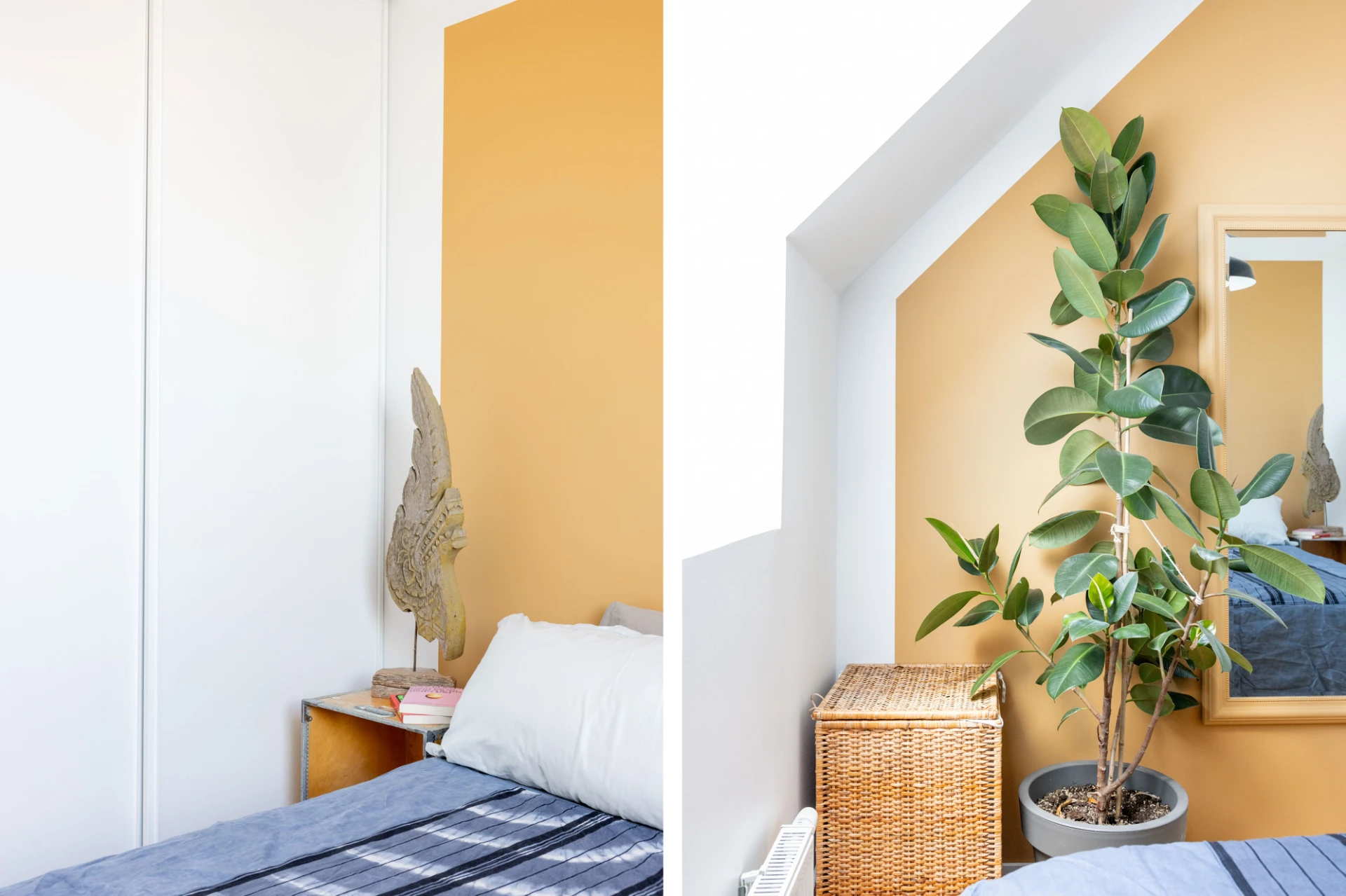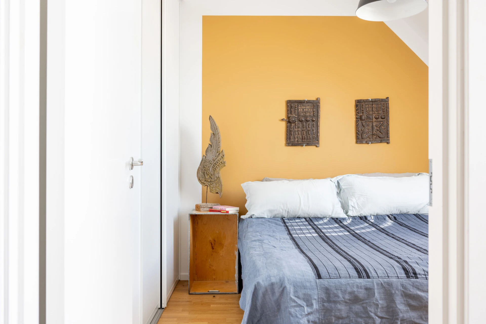 Vita väggar med en gul fondvägg och parkettgolv. Förvaring i skjutdörrs-garderober.