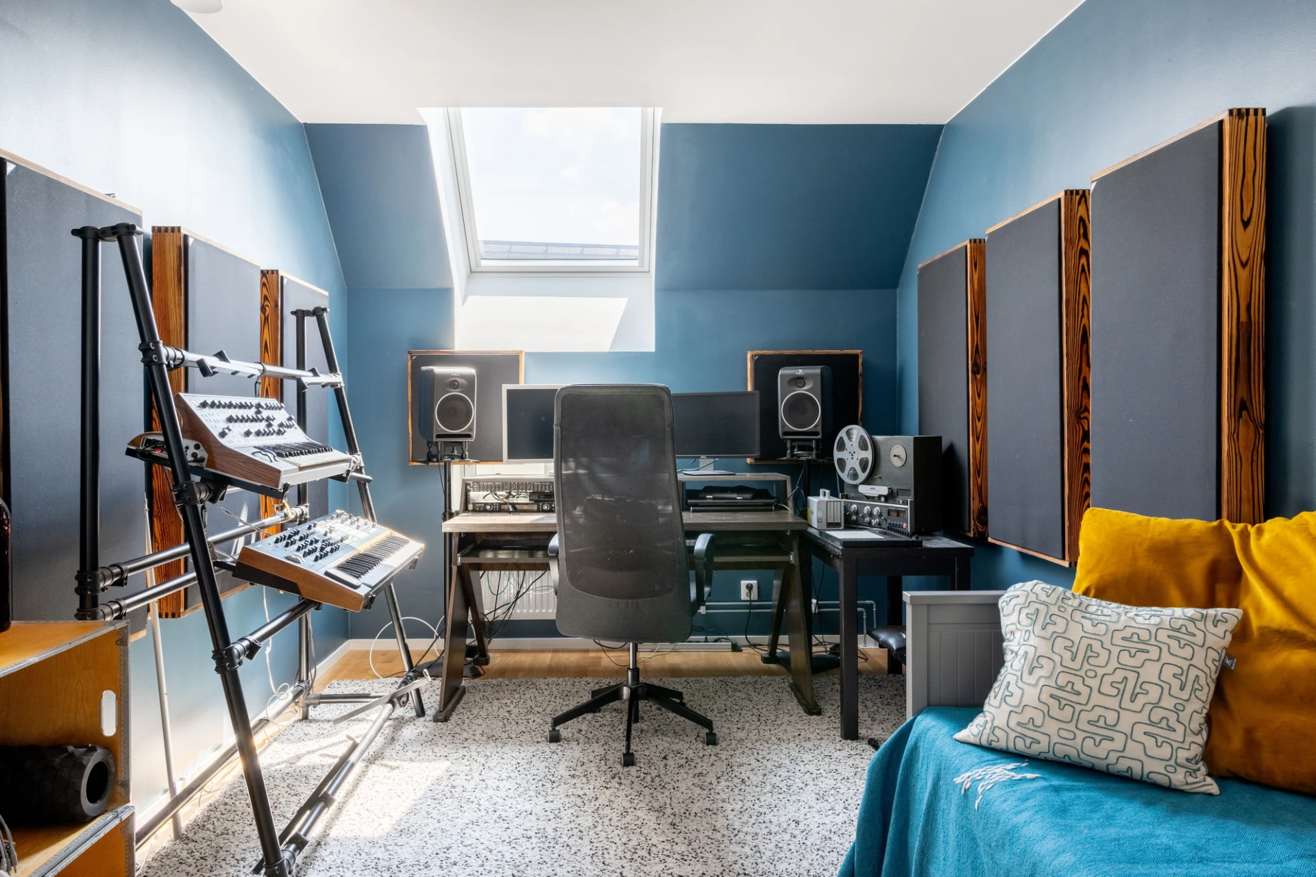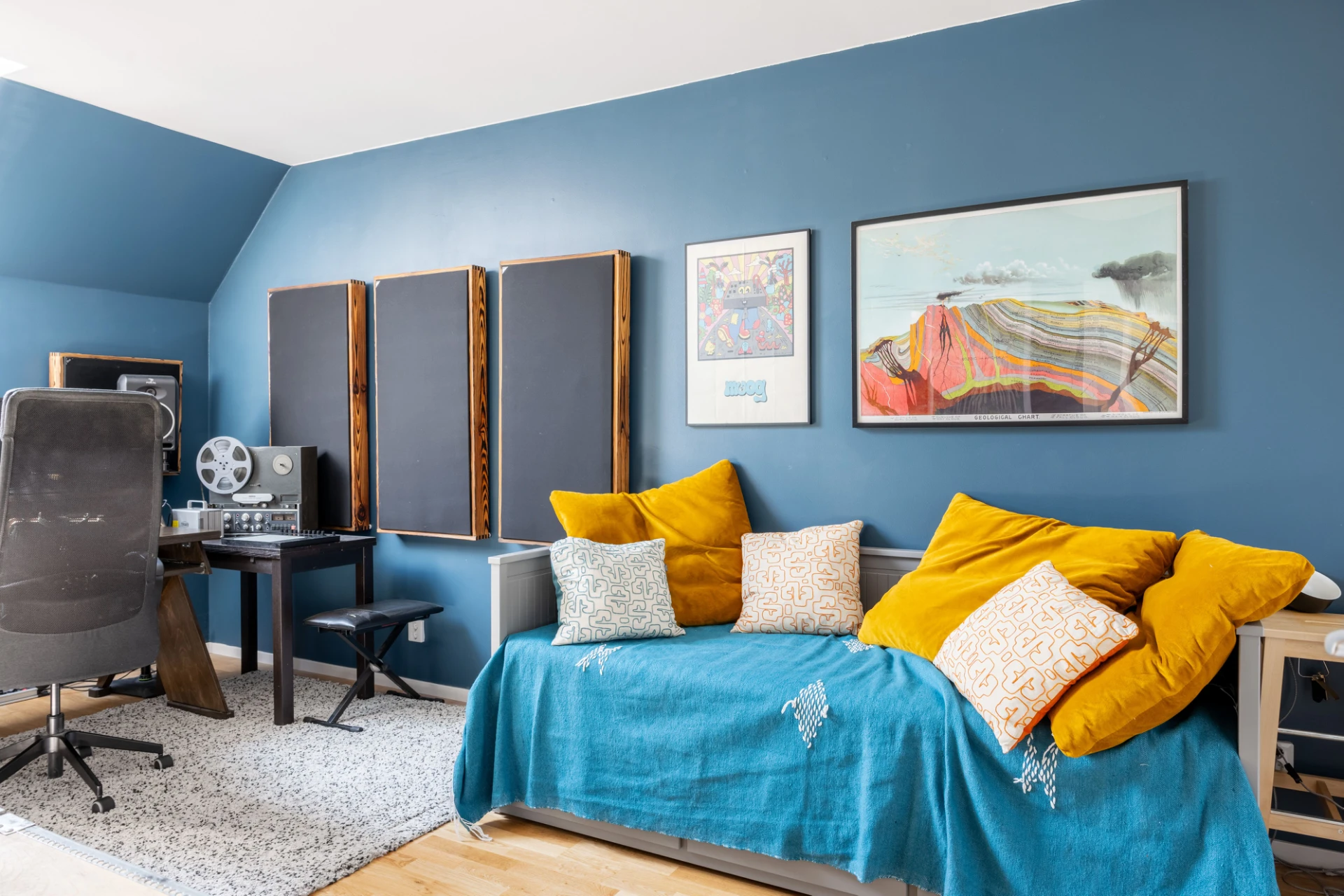 Blå väggar med parkettgolv. Förvaring i skjutdörrs-garderober.