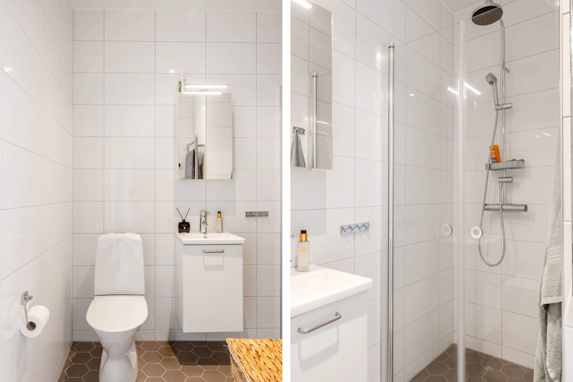 Vita kaklade väggar och grå klinker i hexagonmönster. Utrustningen består av wc, dusch och handfat med kommod.