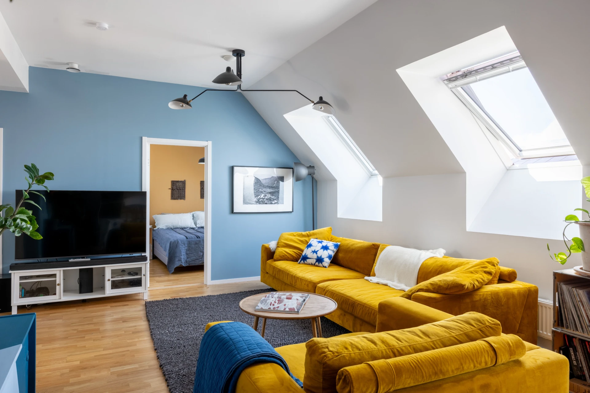 Väl tilltaget vardagsrum med vita väggar och en blå fondvägg samt parkettgolv.