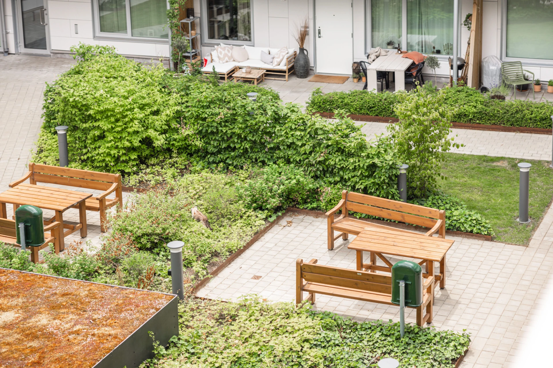 I föreningen finns en gemensam möblerad takterrass belägen på våning 5 samt en innergård utrustad med bänkar och växter.