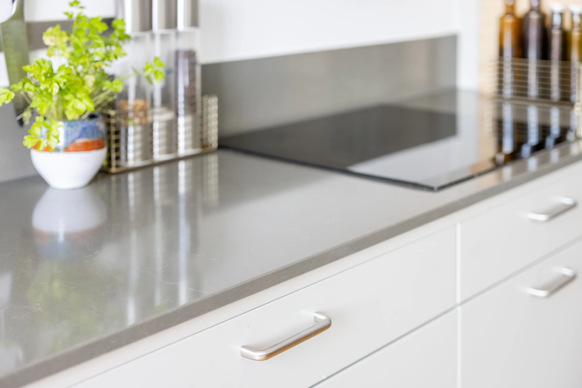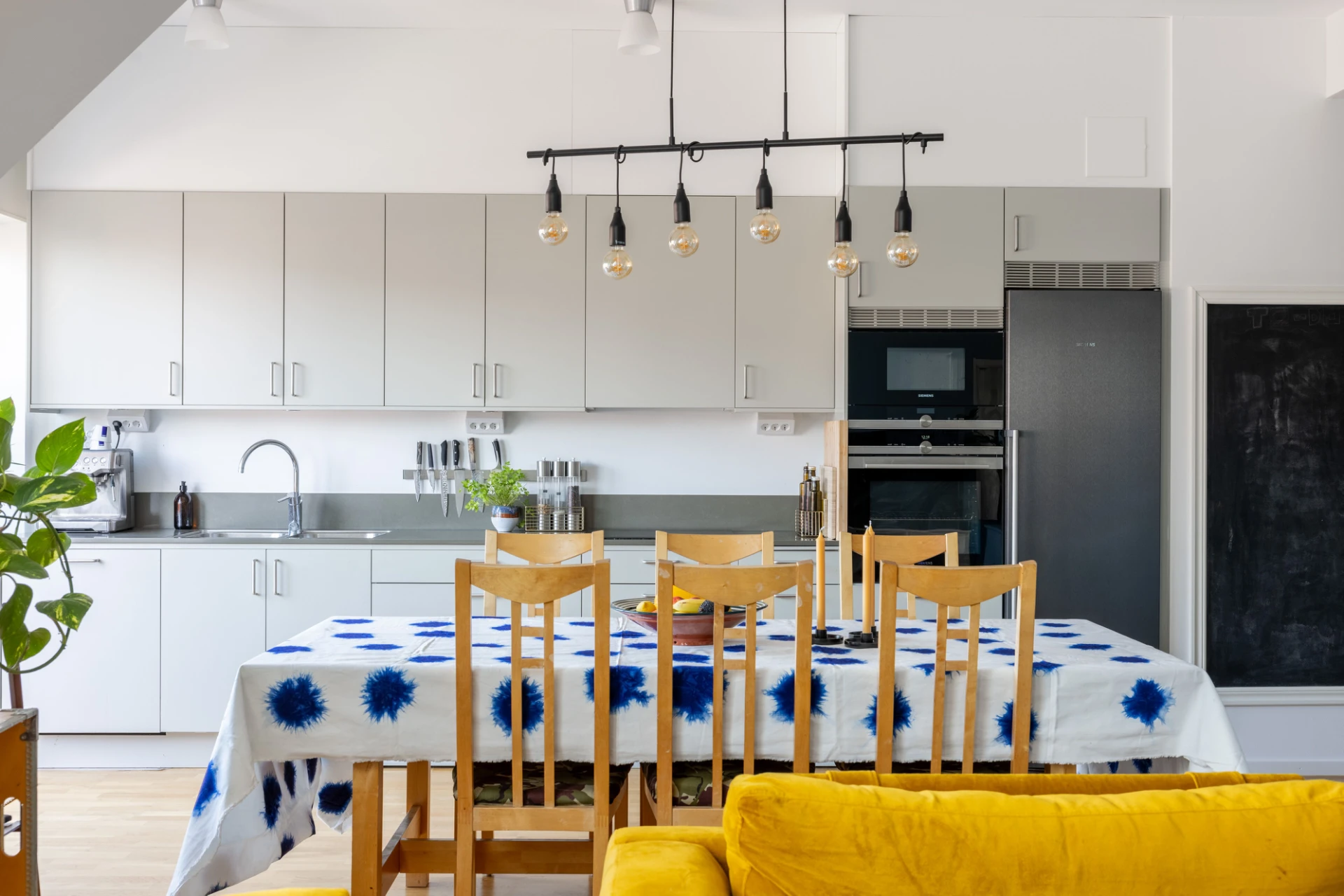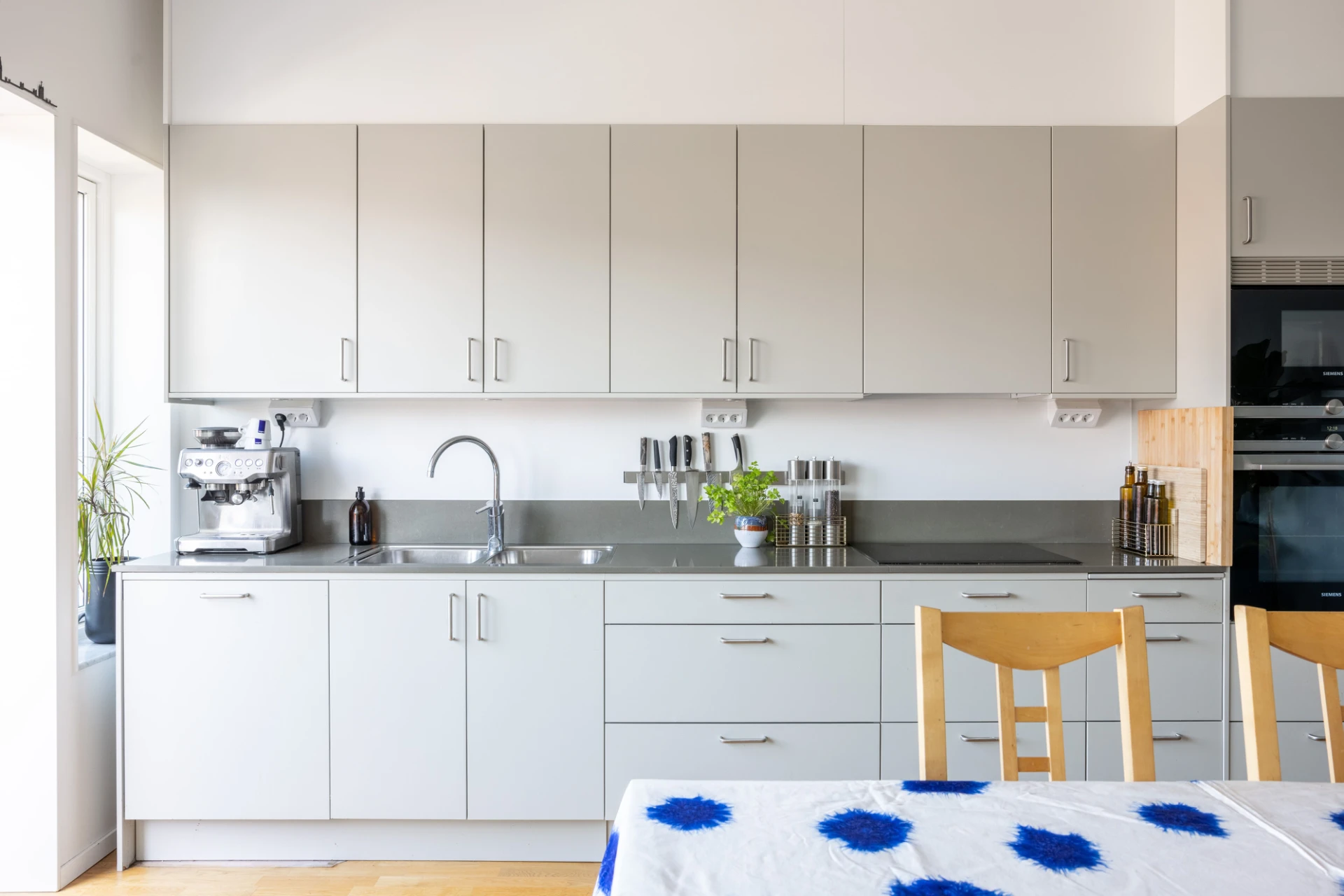 Grå köksinredning med stenbänkskiva. Utrustningen består av spis, ugn, diskmaskin, micro, kyl och frys. Plats för större matbord.