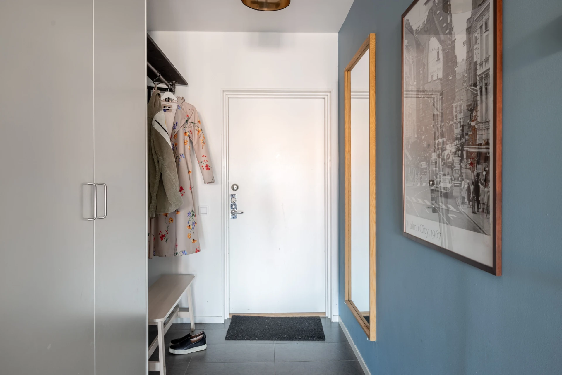 Grå klinker, vita och blå väggar. Plats för avhäning samt förvaring i garderober.