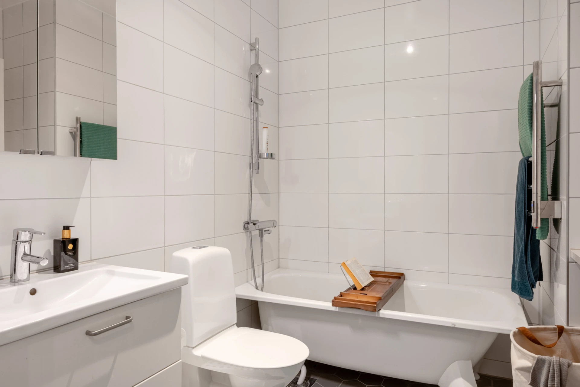 Stort badrum med vitt kakel samt grå klinker. Utrustningen består av badkar, wc, spegelskåp, handdukstork och handfat med kommod. Badrummet är även utrustat med egna tvättmöjligheter i form av tvättmaskin, torktumlare, avlastningsbänk och förvaringsskåp ovan.