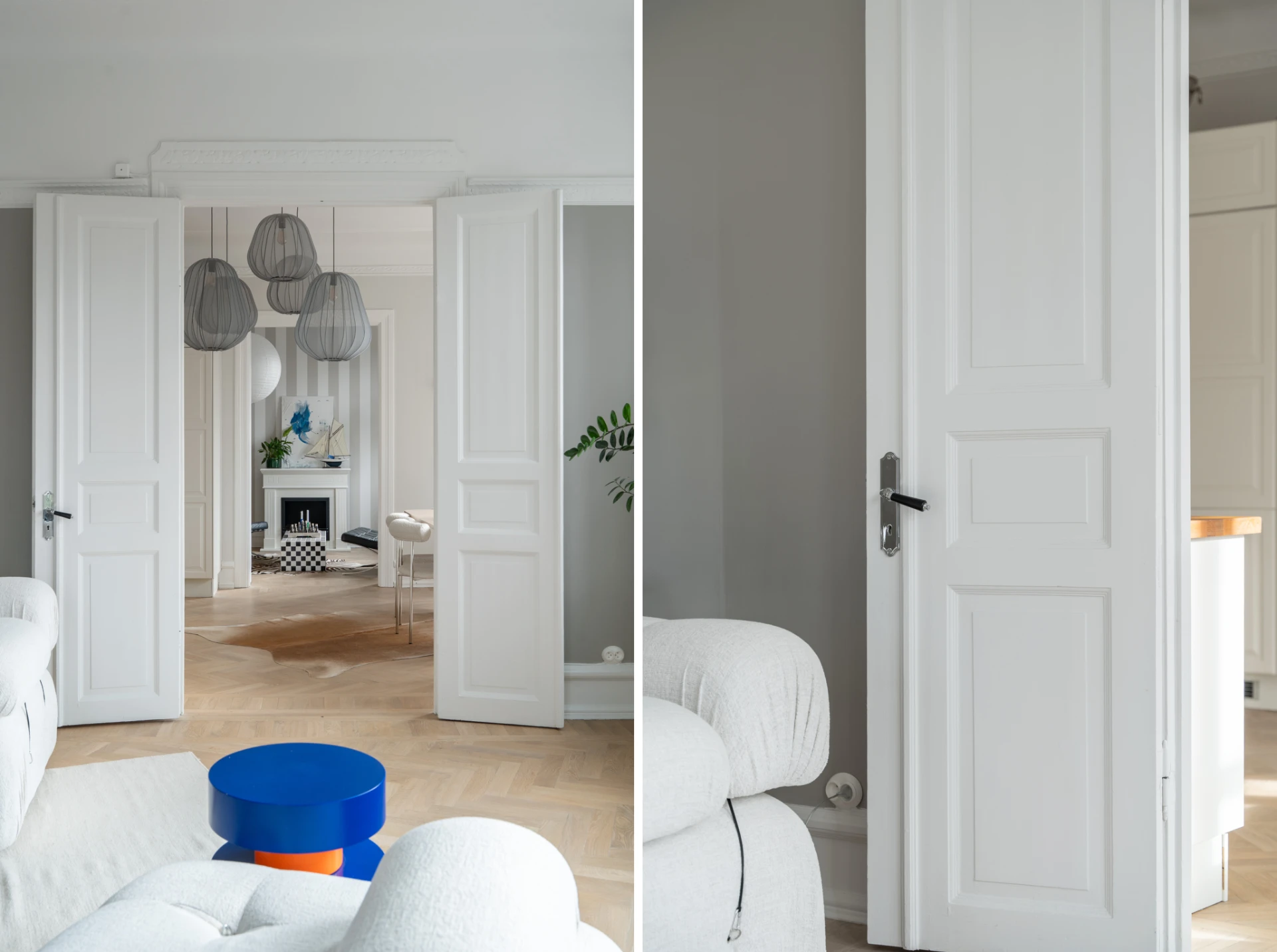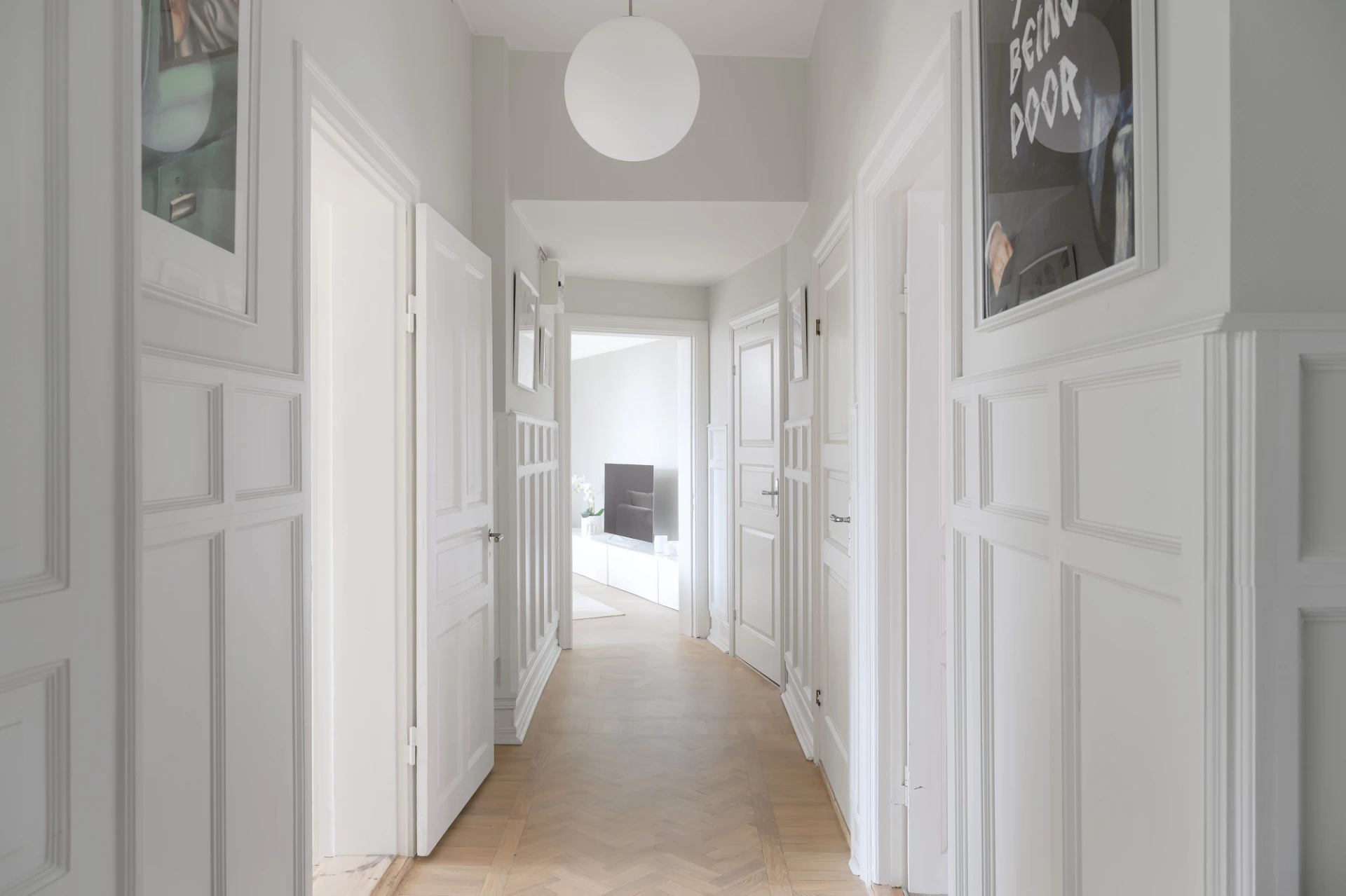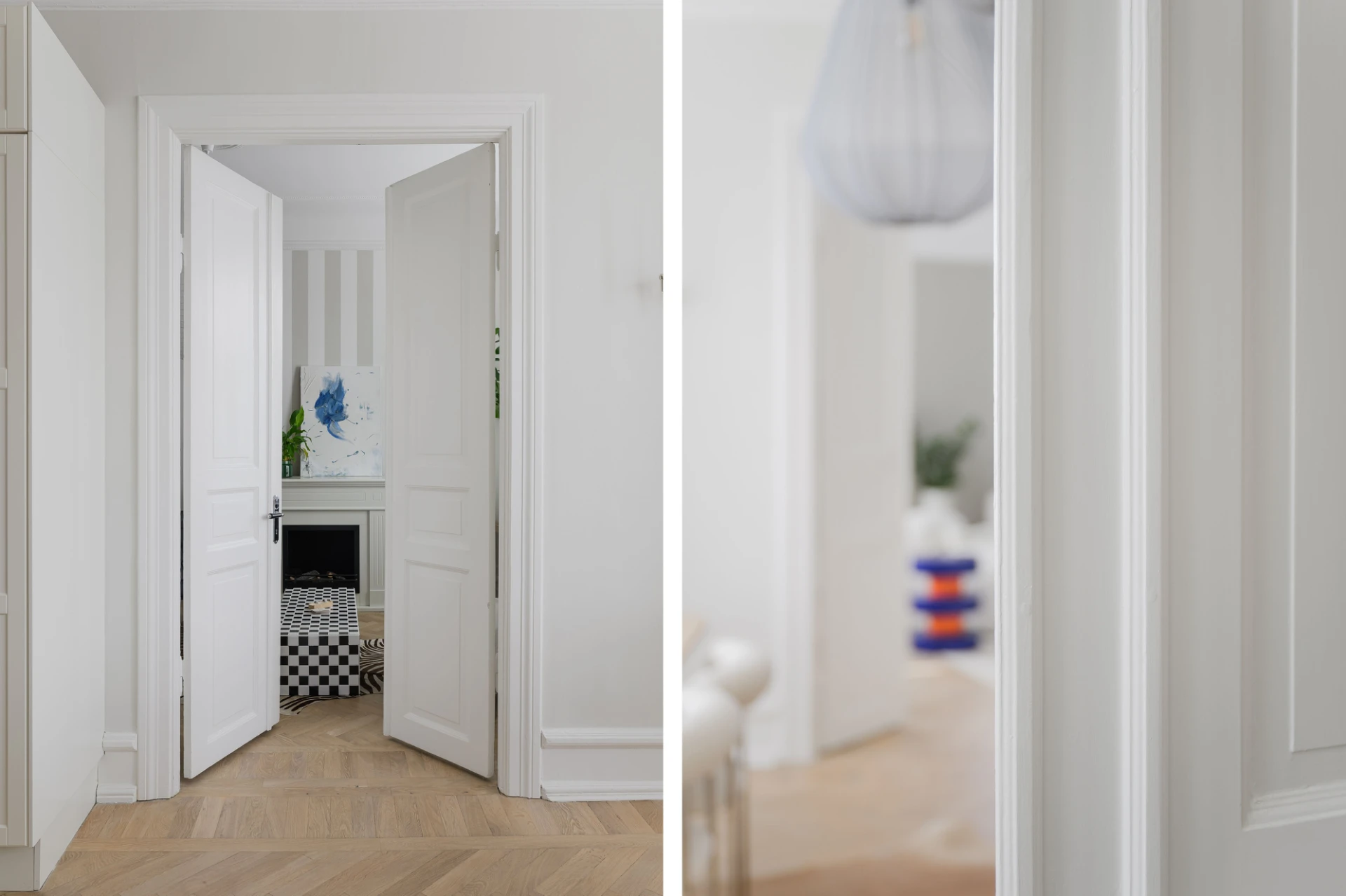 Laminat/brädgolv och ljusa väggar med bröstpanel. Dubbeldörrar mot fransk balkong in mot gården.