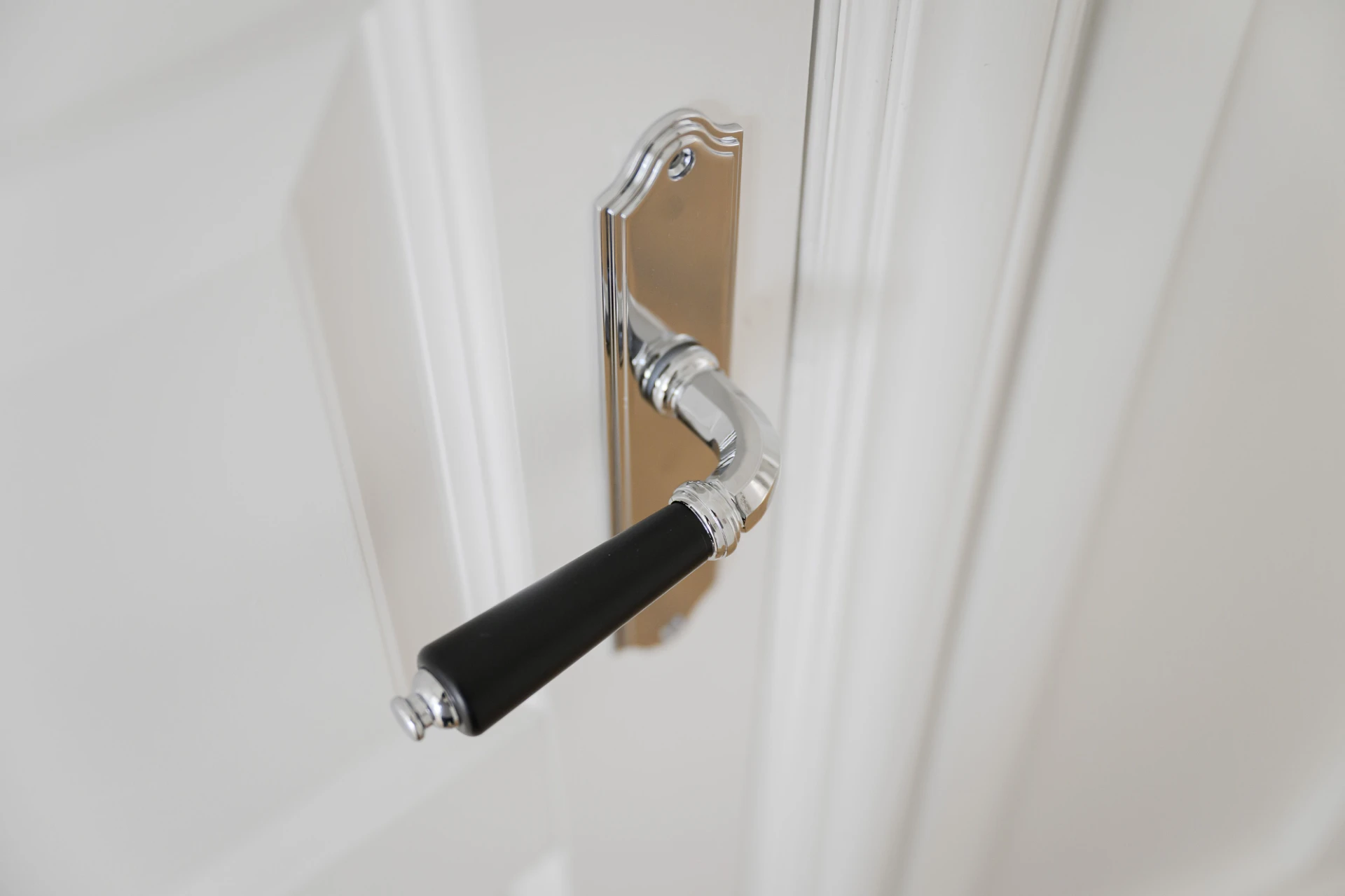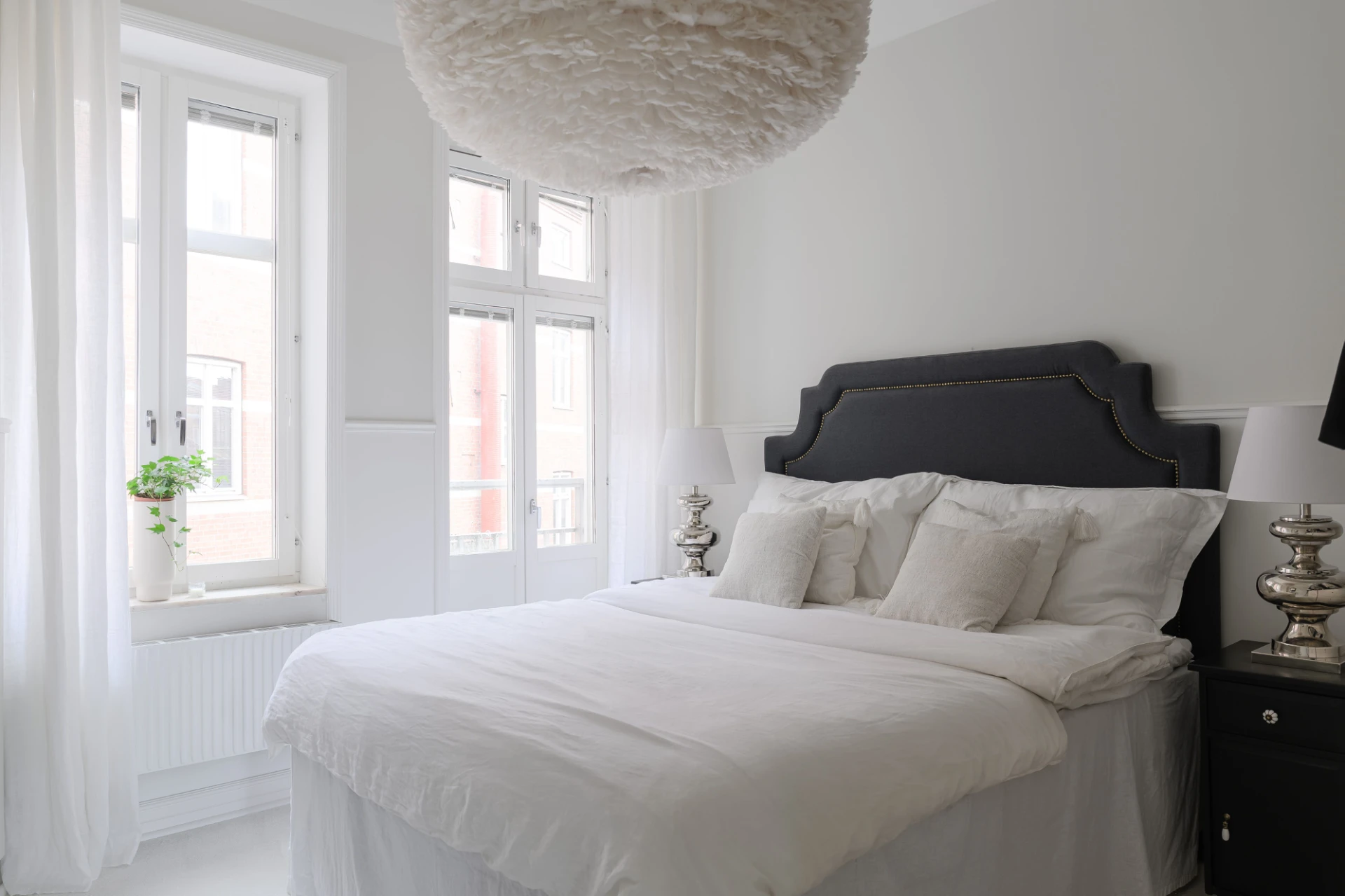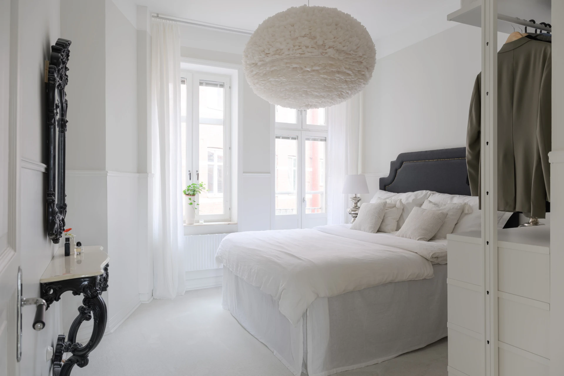 Laminat/brädgolv och ljusa väggar med bröstpanel. Dubbeldörrar mot fransk balkong in mot gården.