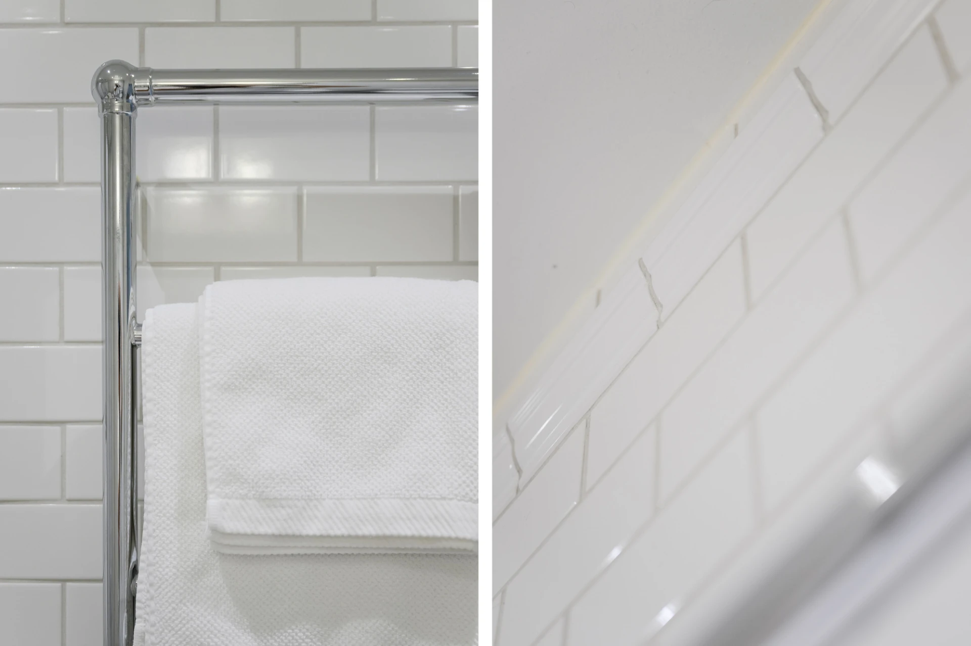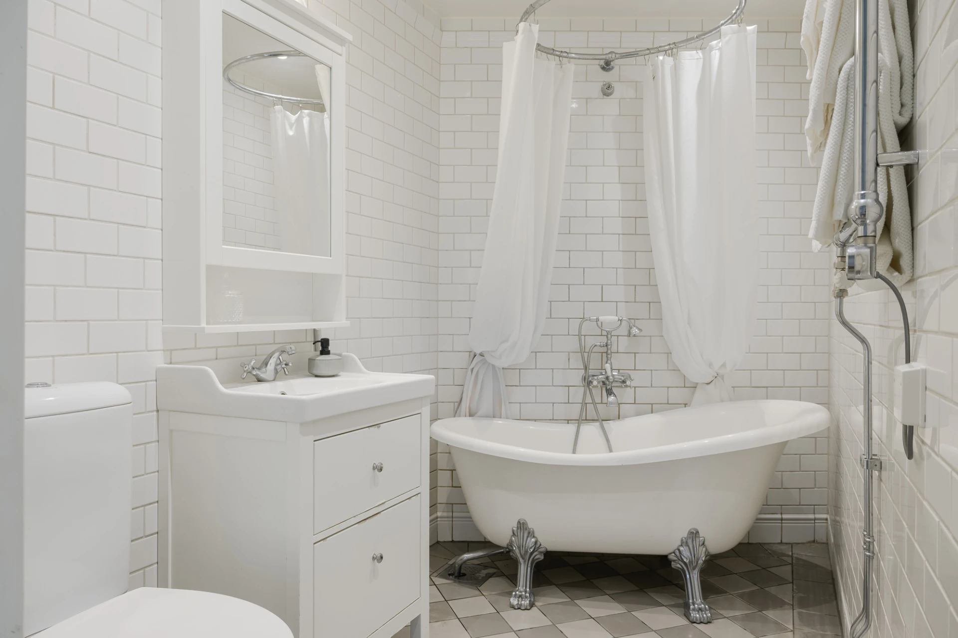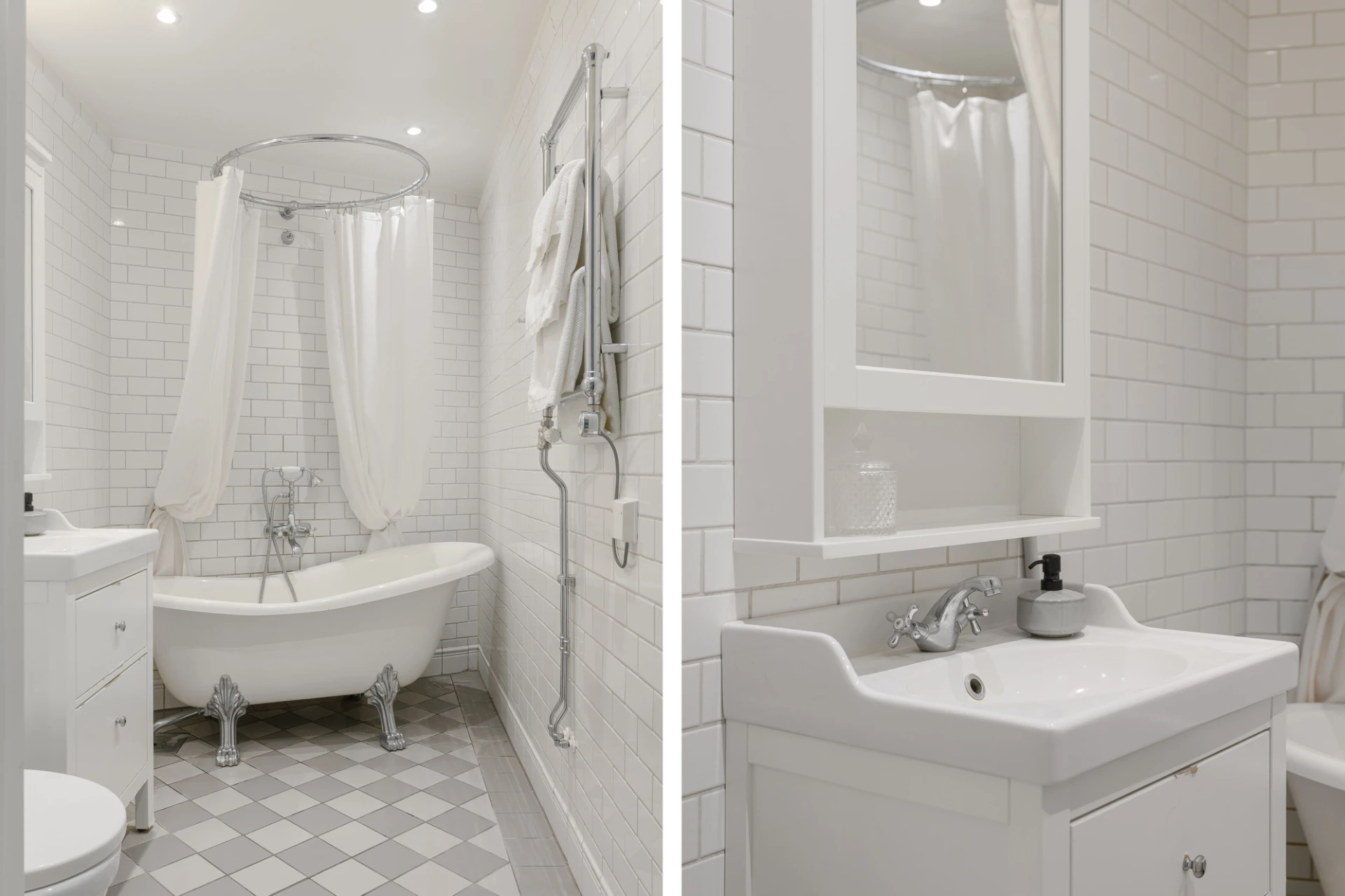 Grå/vitrutig klinker och vitt kakel. Utrustat med badkar på tassar, wc, handfat med vit kommod, spegelskåp och handdukstork. Infällda spotlights i tak.