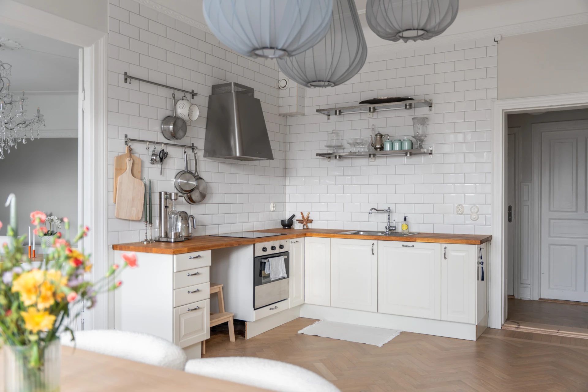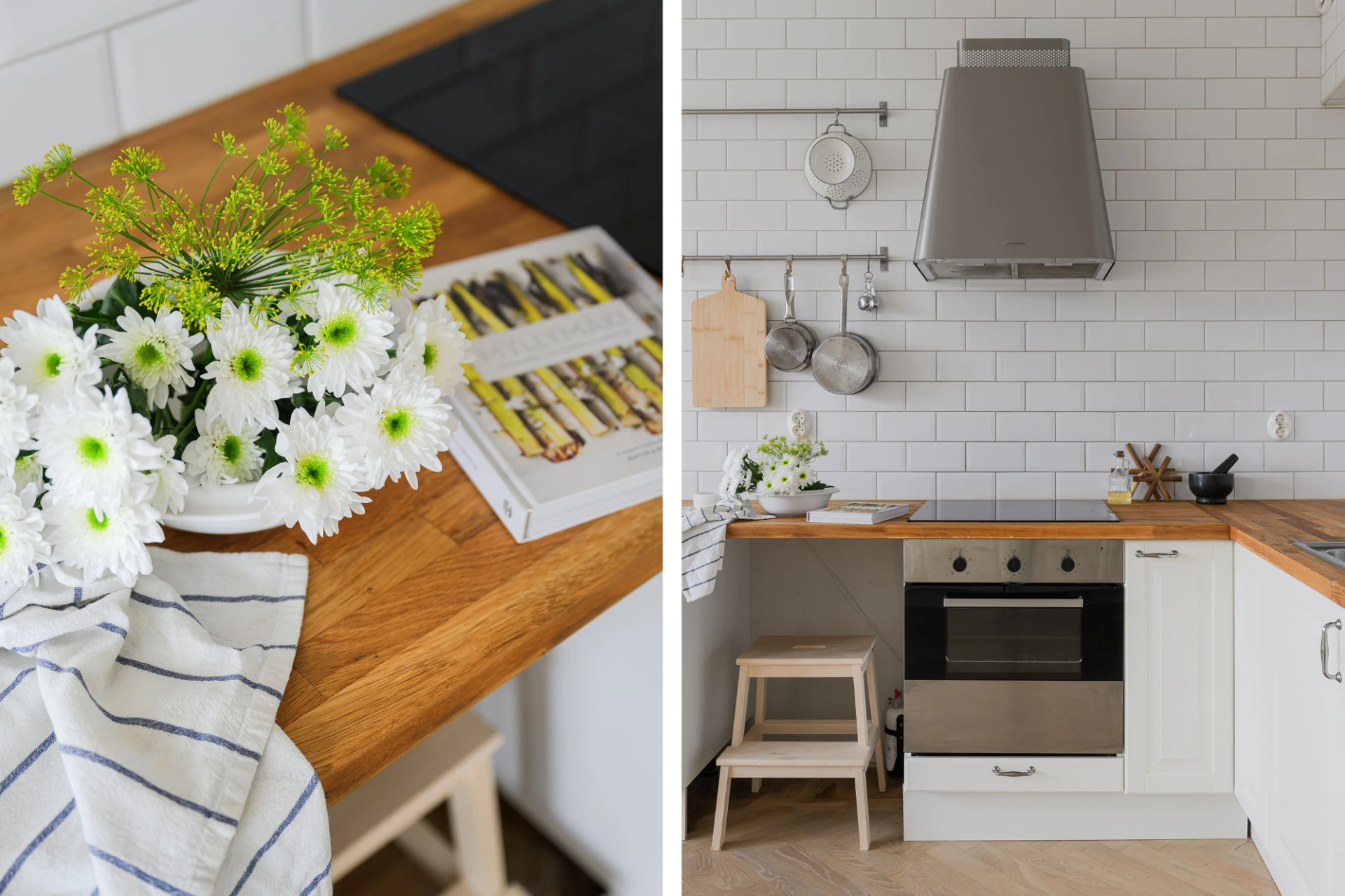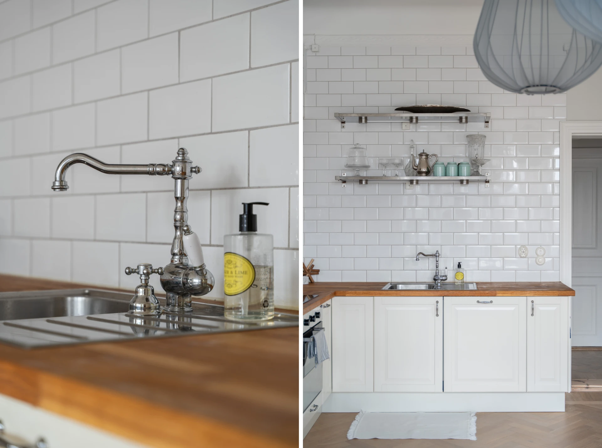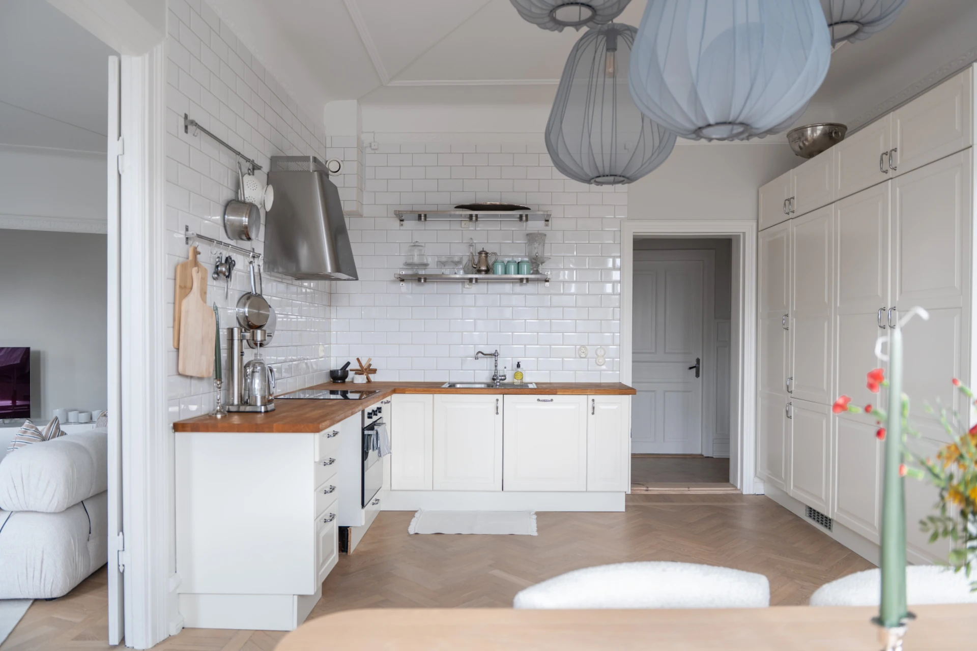 Fiskbensparkett och vita väggar. Vit köksinredning, vitt kakel och bänkskiva i trä. Utrustat med integrerad kyl och frys, induktionshäll, inbyggd ugn, fläkt och integrerad diskmaskin. Matplats i burspråk.