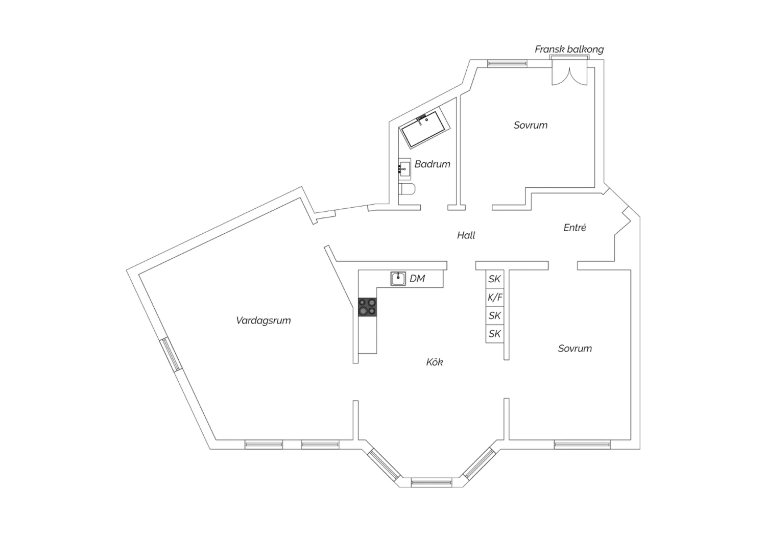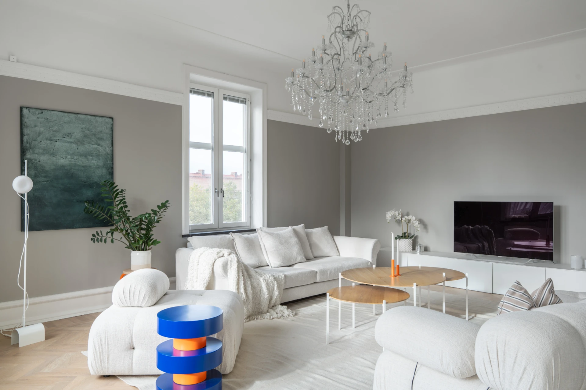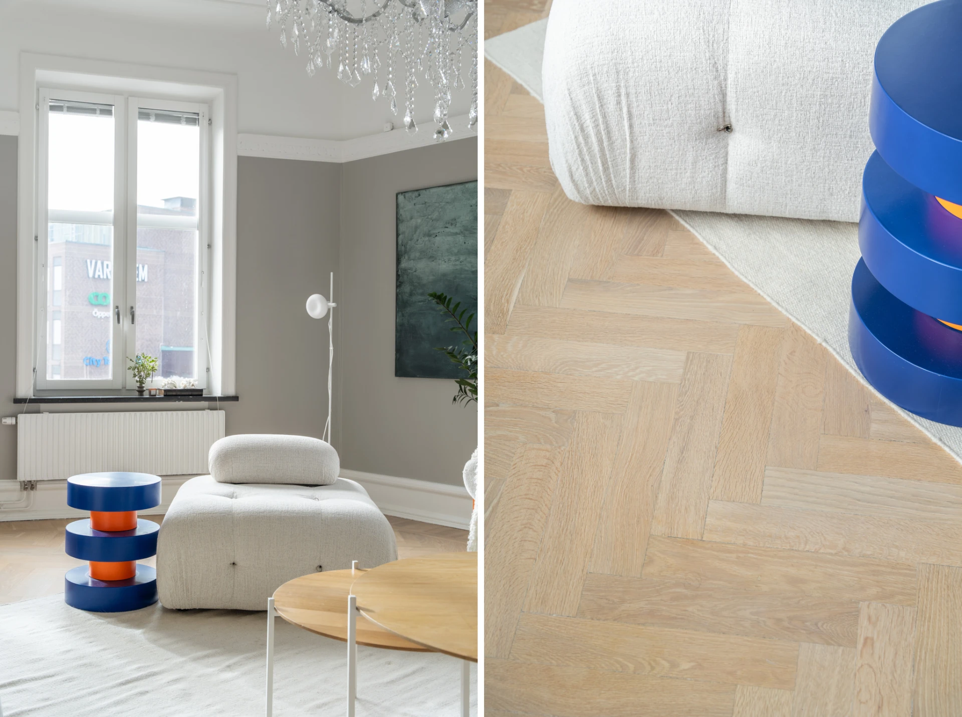 Fiskbensparkett och grå väggar. Fönster i två väderstreck.