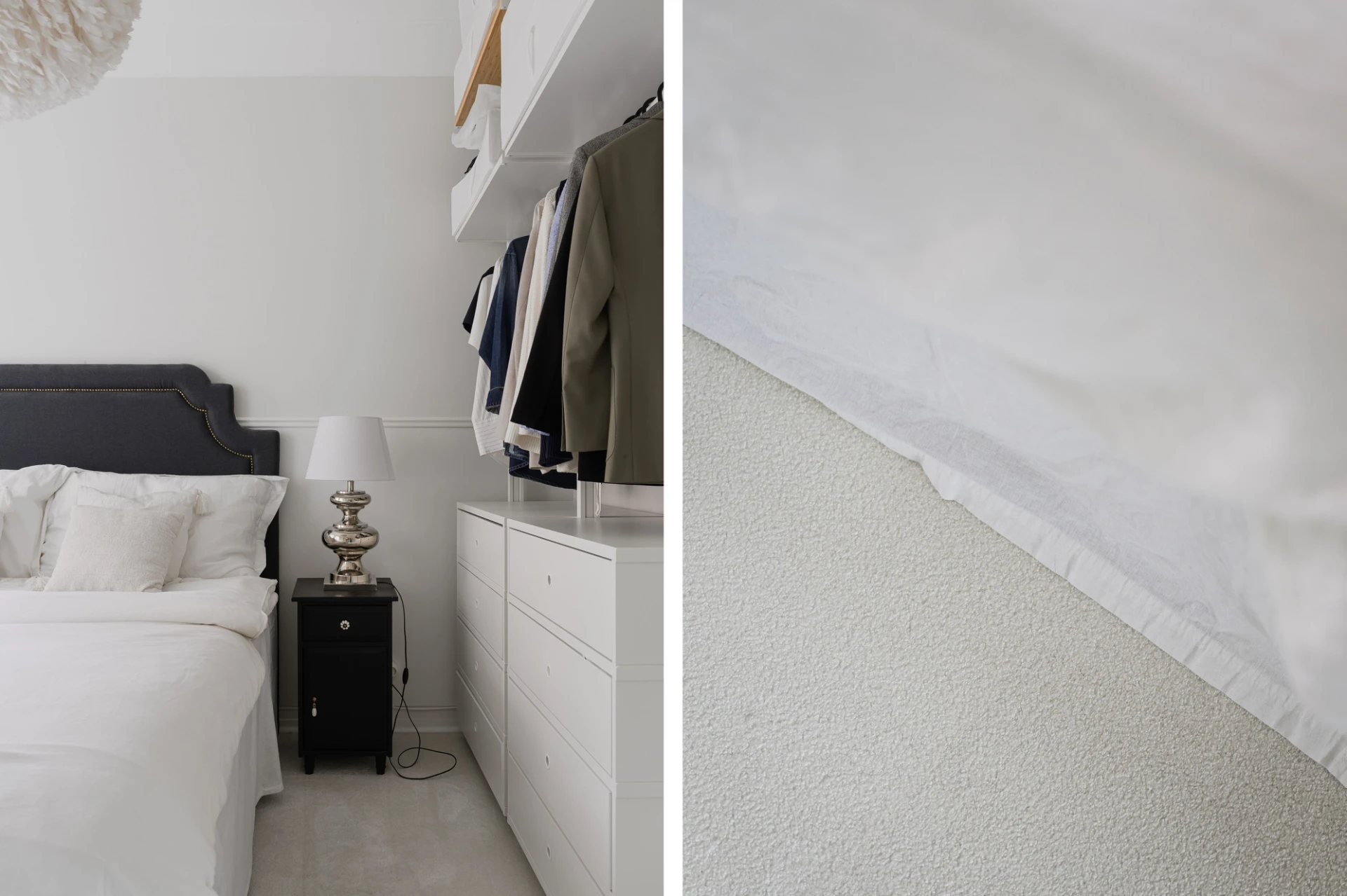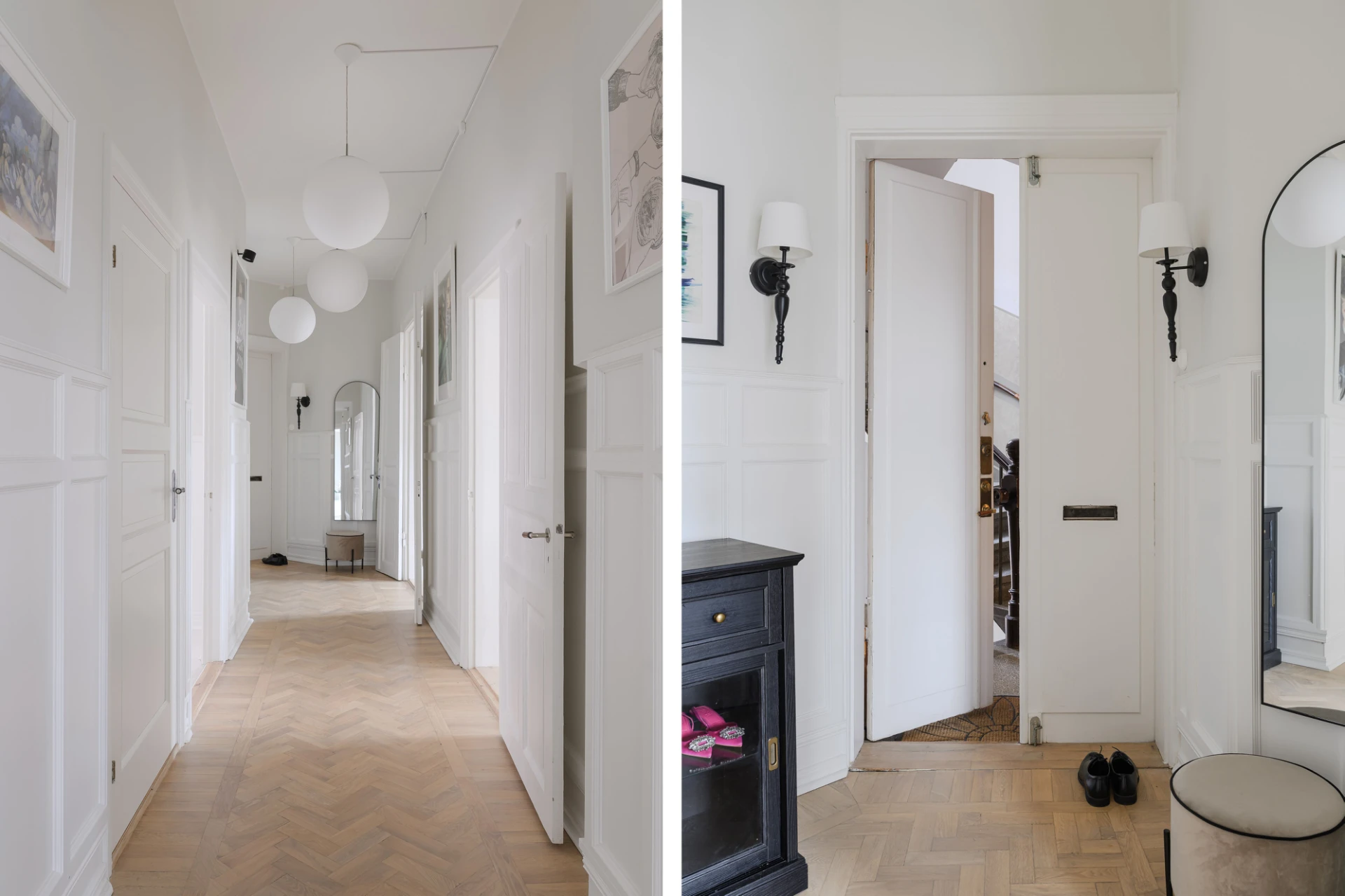 Fiskbensparkett och ljusa väggar med bröstpanel. Förvaring i en klädkammare.