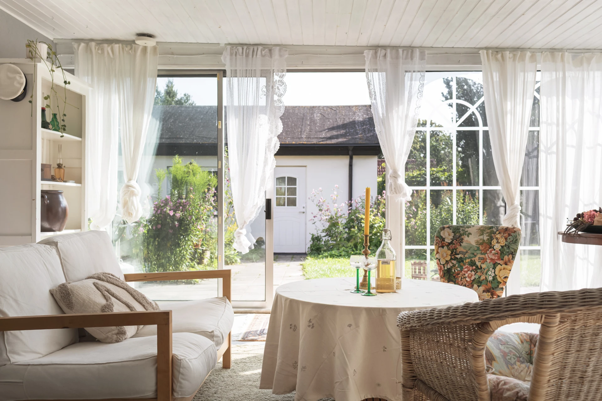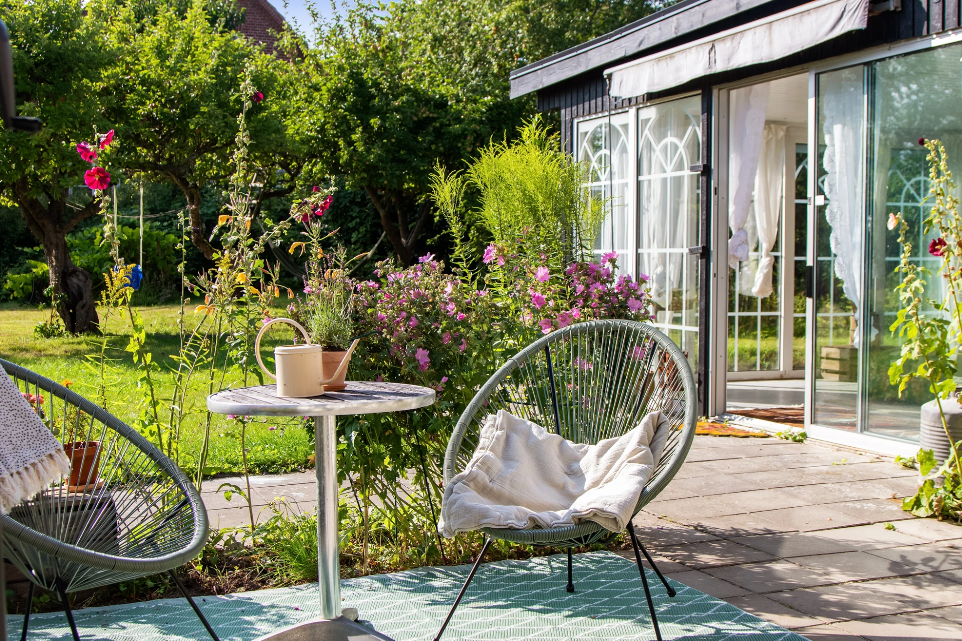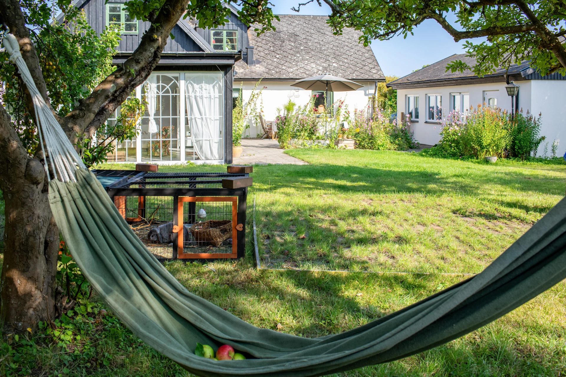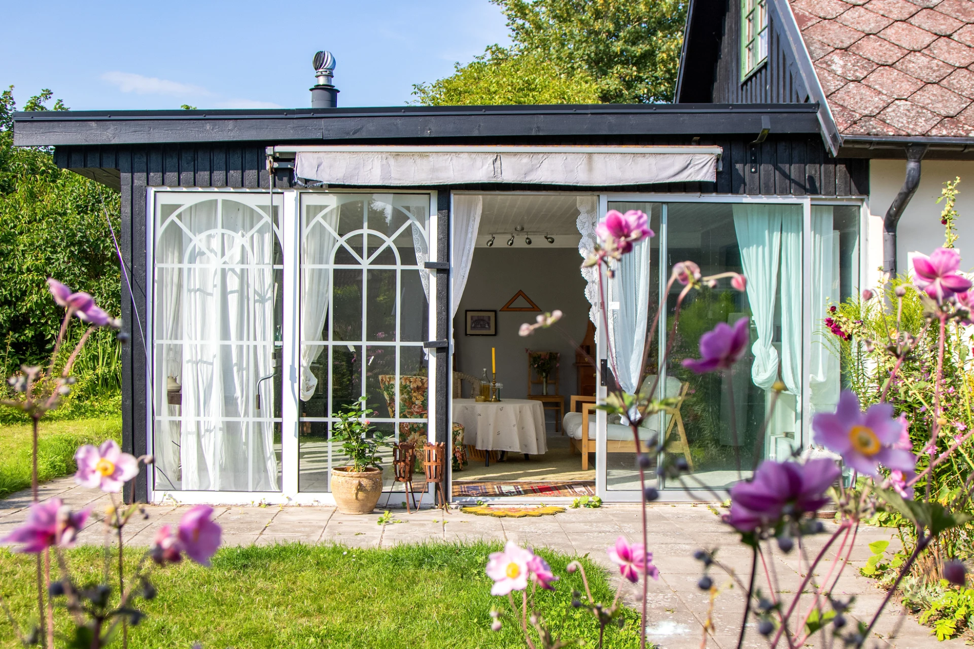 Det stora uterummet ger en fin utsikt över den blomstrande trädgården som är en sann oas! Här avlöser blommorna varandra från tidig vår till höst, i samklang med fruktträd och bärbuskar. Äpple, plommon, smultron, björnbär och rabarber samsas med köksträdgård, rabatter och ett rikt djurliv med fjärilar, humlor, ekorrar och fågelsång. En plats där man gärna går barfota och njuter av naturens harmoni.