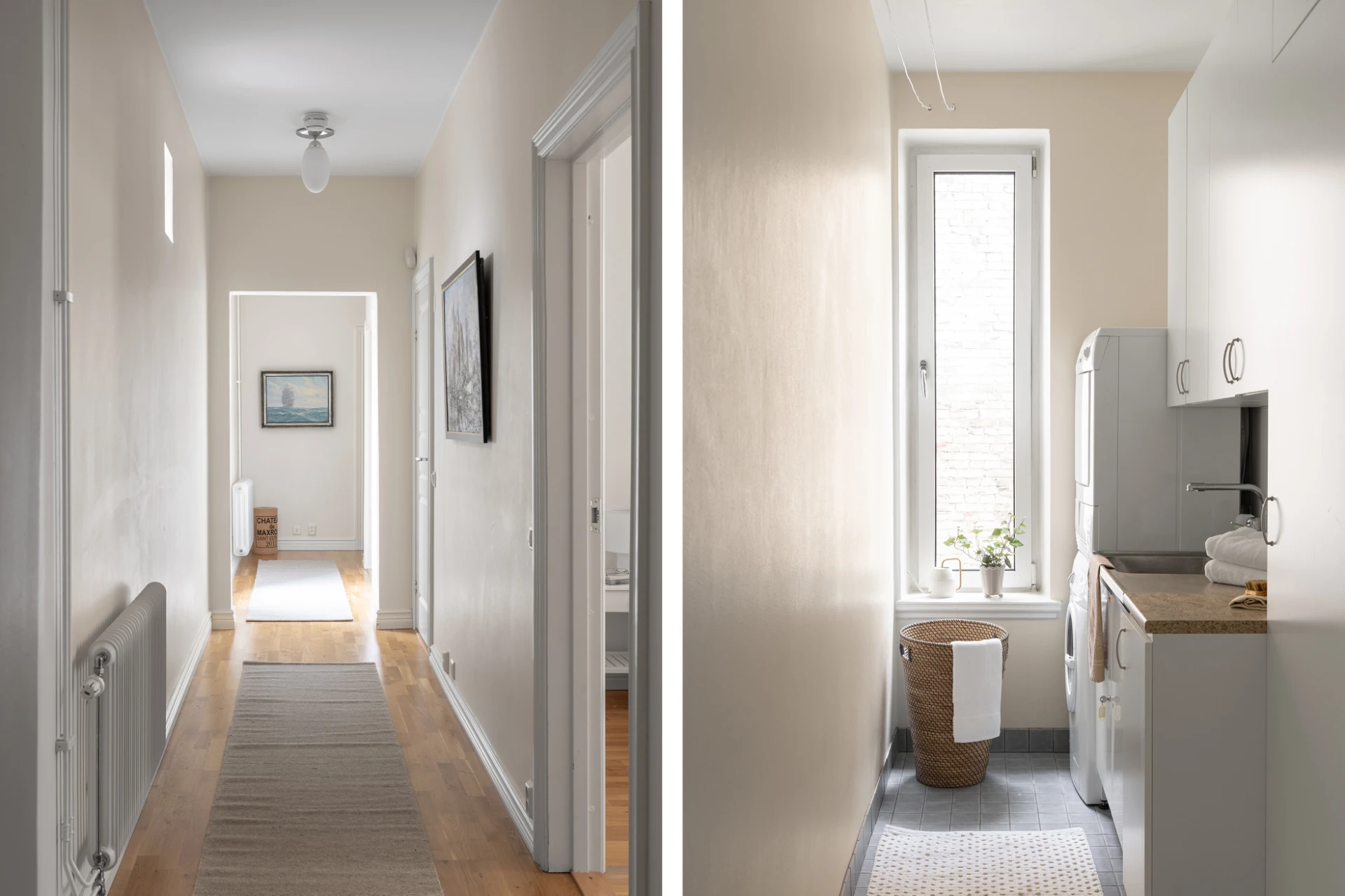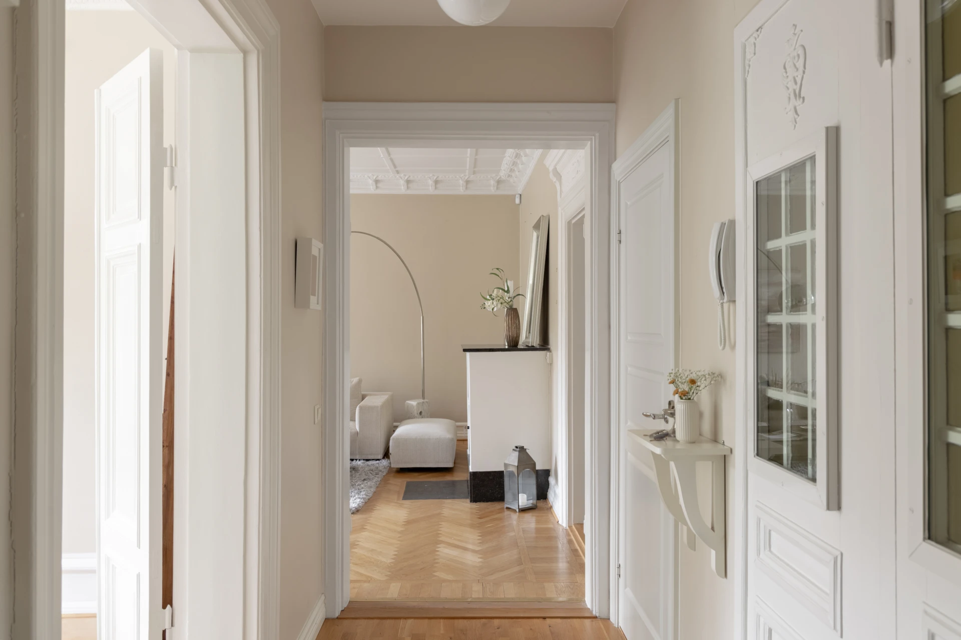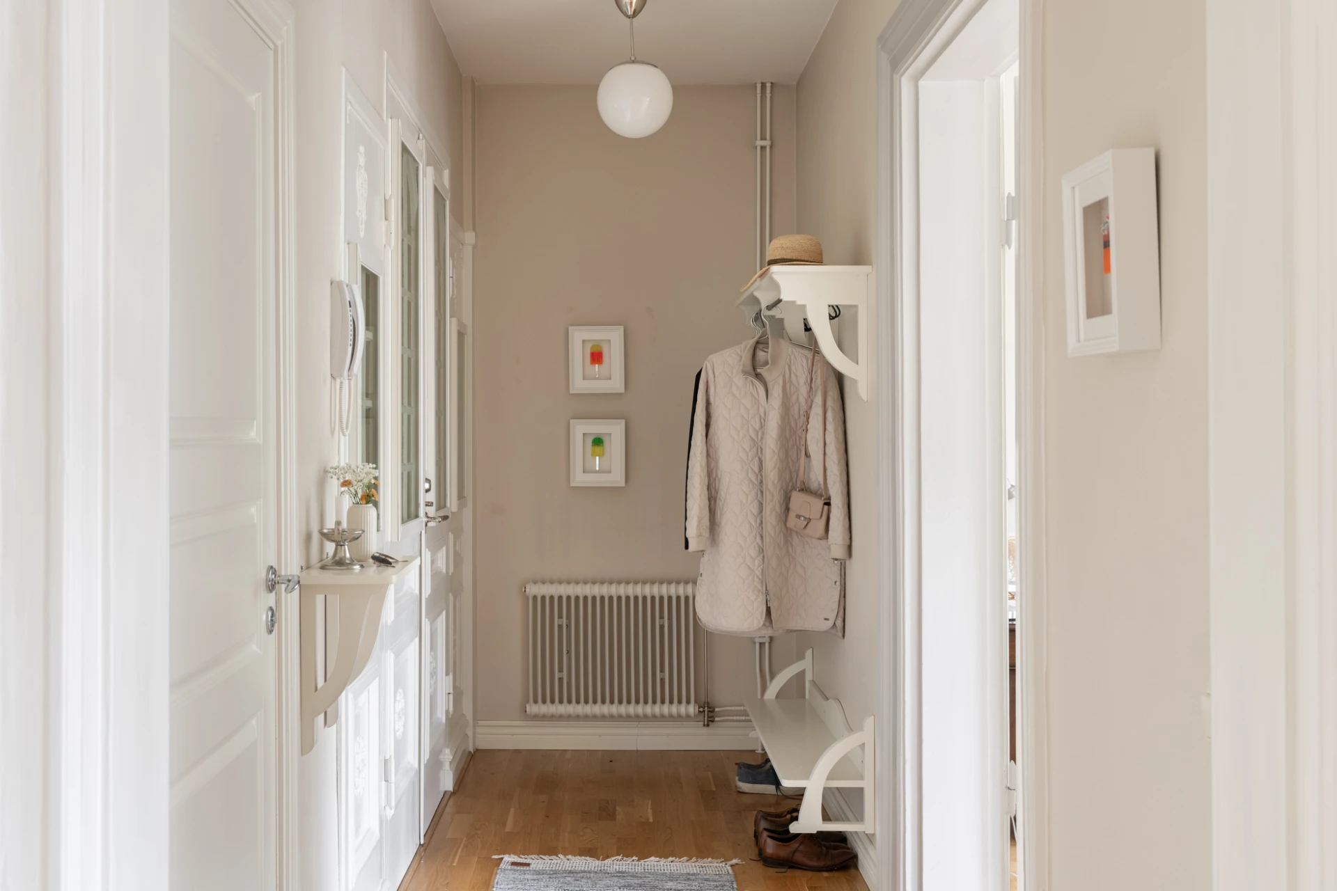 Parkettgolv och ljusa väggar. Fin hatthylla och utrymme för skor och ytterkläder. Vackra pardörrar in till matsalen.