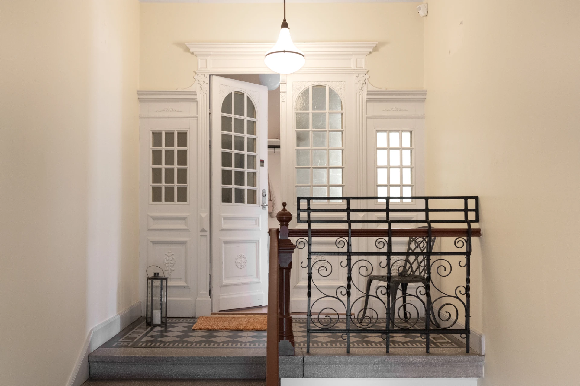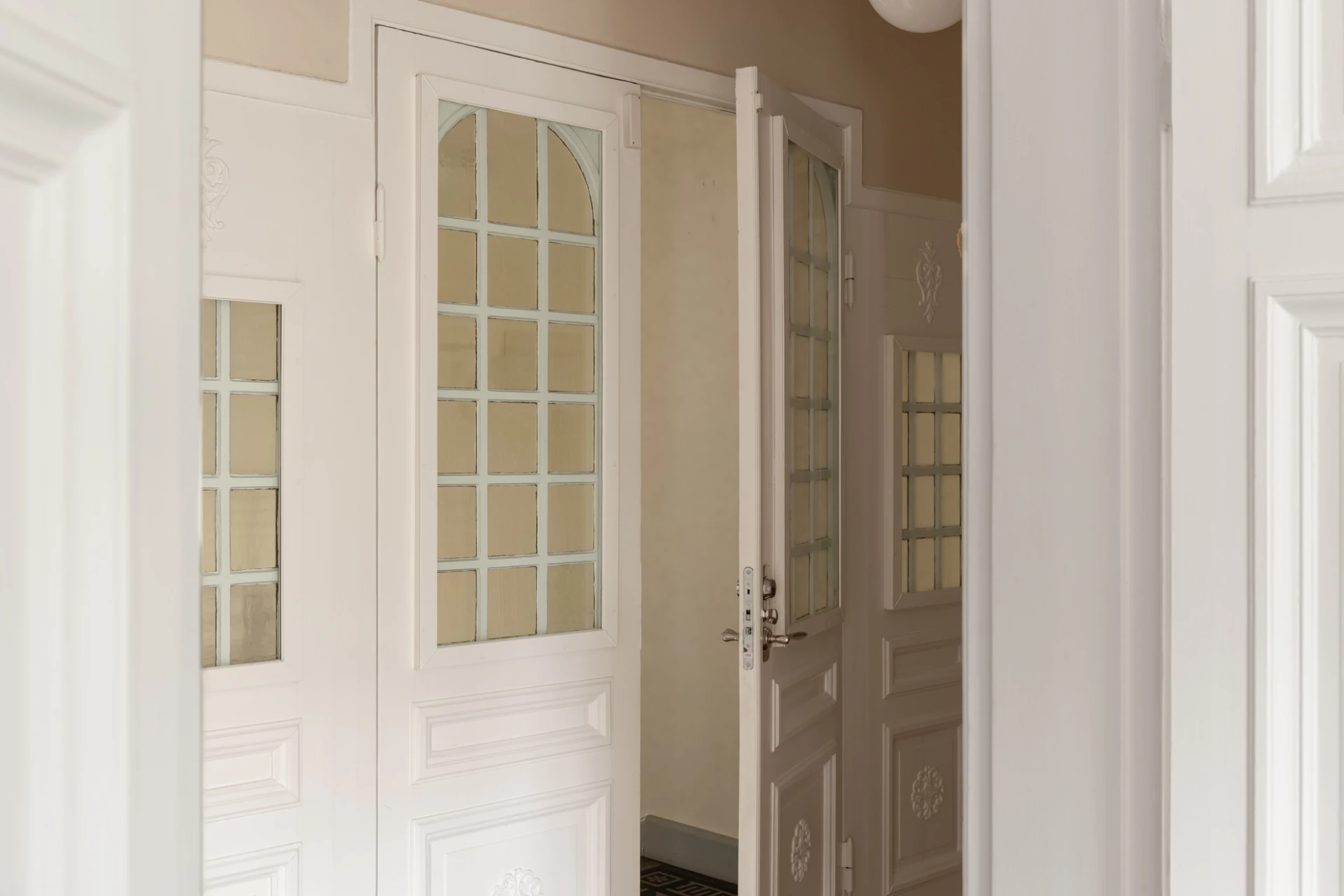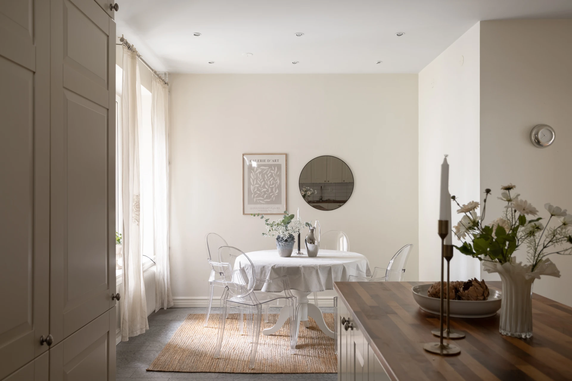 Parkettgolv och ljusa väggar. Fin hatthylla och utrymme för skor och ytterkläder. Vackra pardörrar in till matsalen.