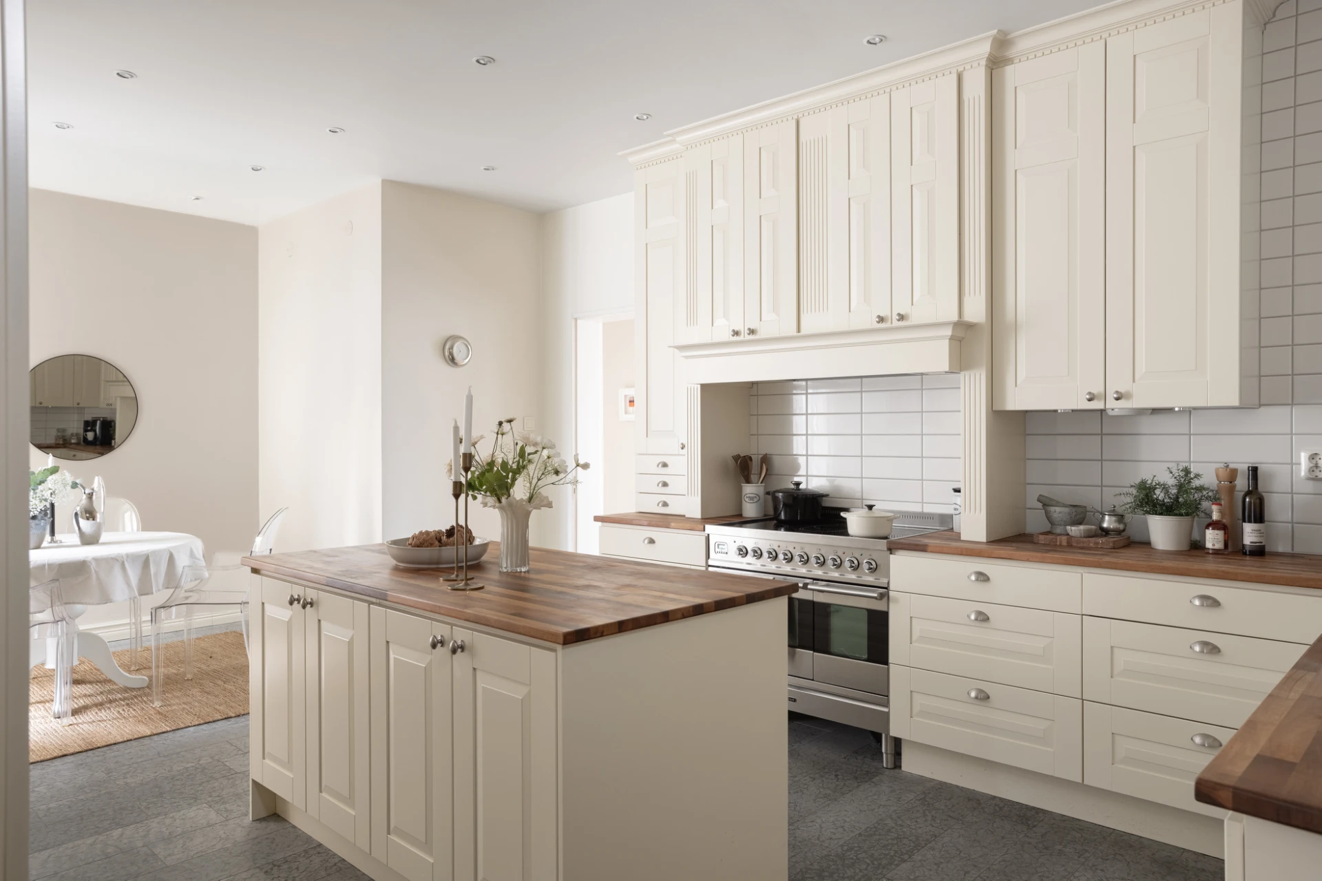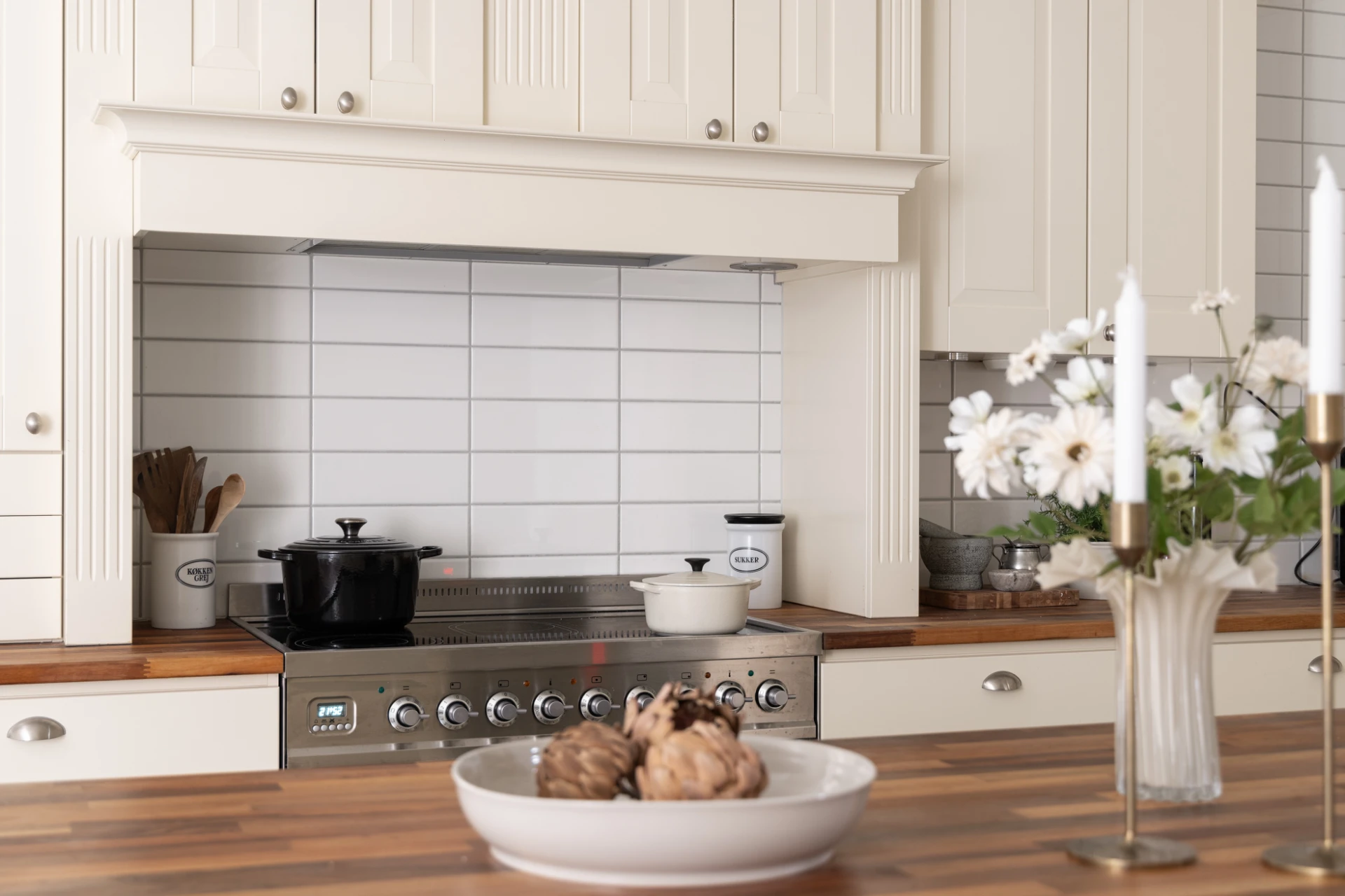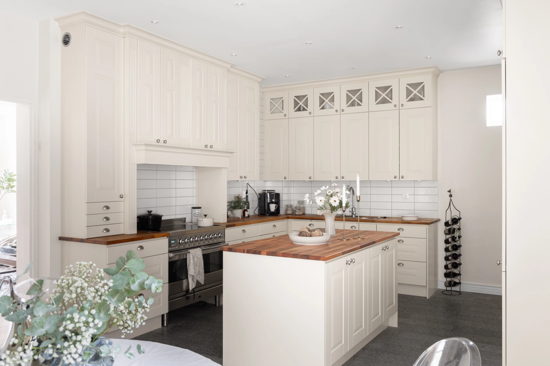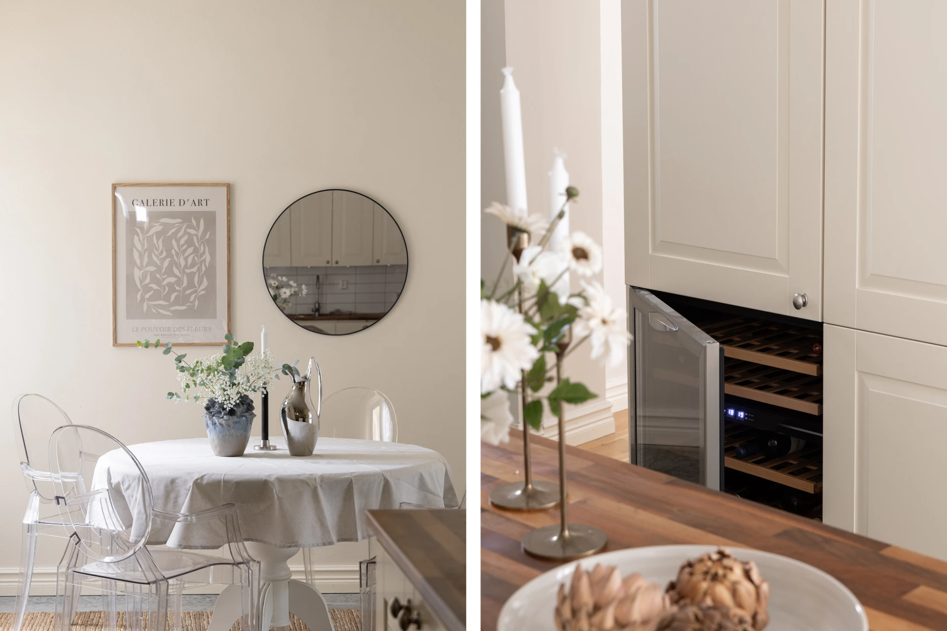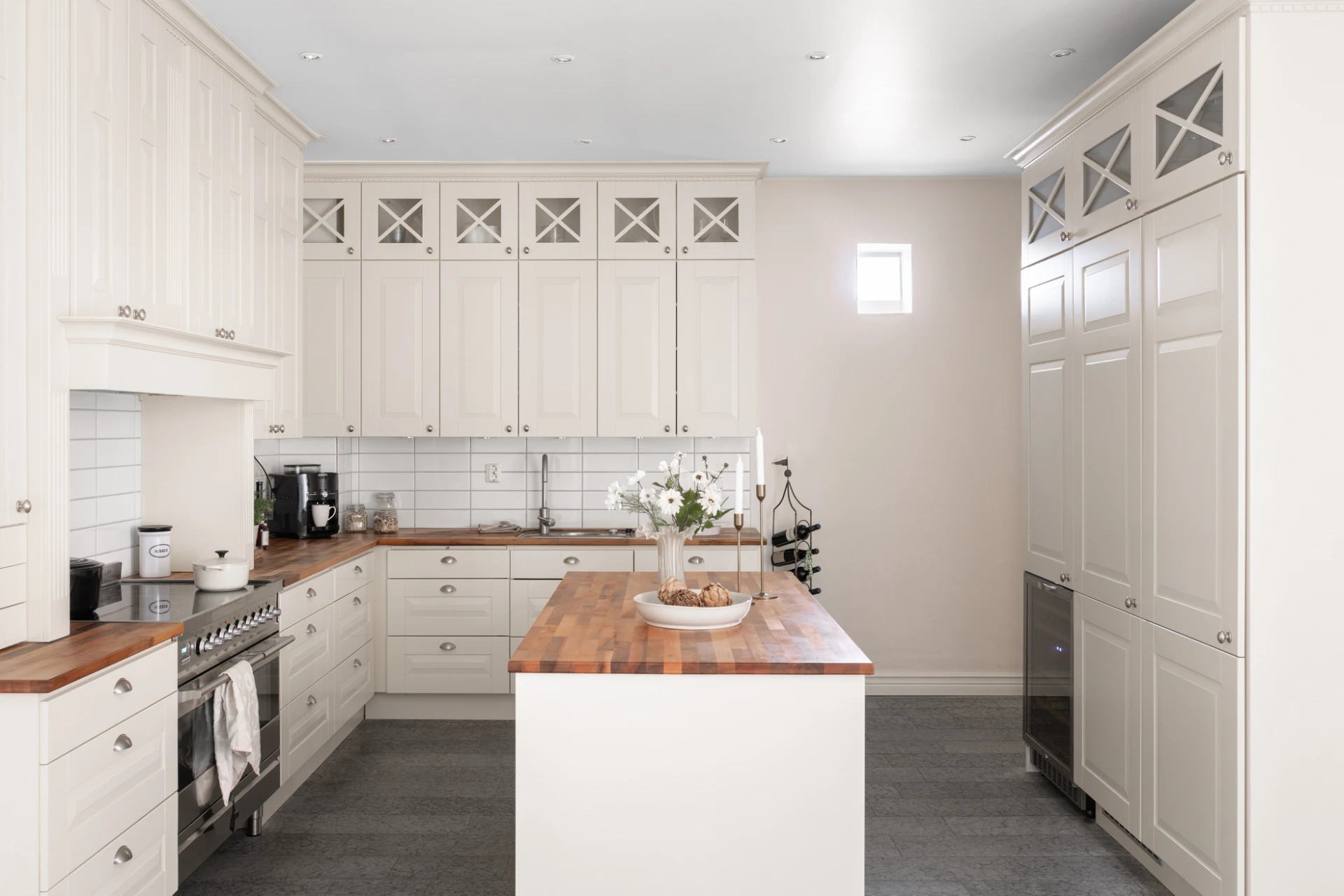 Golv med natursten och ljusa väggar. Vit köksinredning (Tibro), vitt kakel och bänkskiva i valnöt (Tibro). Utrustat med kyl och frys i fullhöjd (AEG), spis med glaskeramikhäll och ugn (ILVE), fläkt, inbyggd mikrovågsugn, diskmaskin och vinkyl. Infällda spotlights i tak. Matplats för ca 6-8 personer.