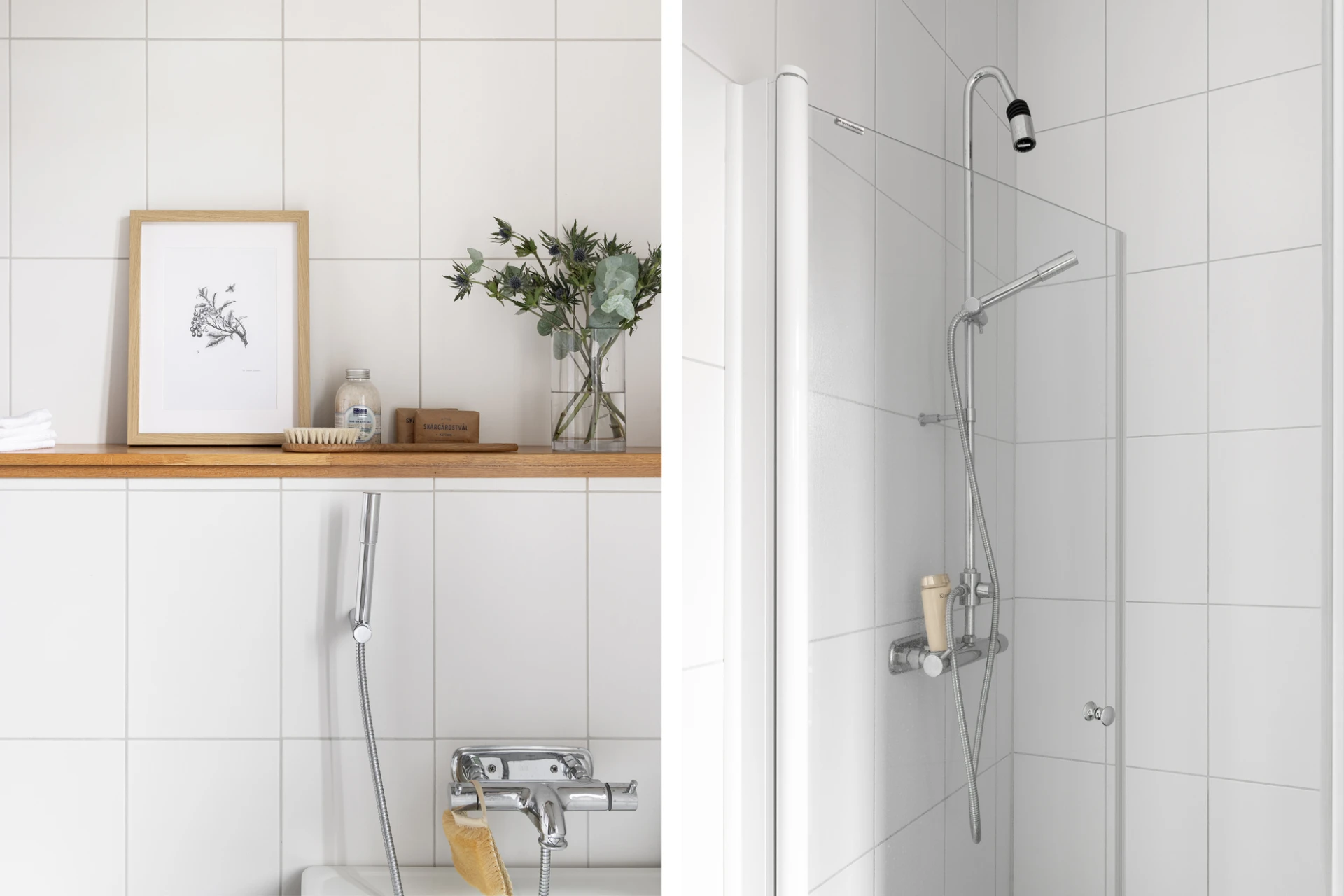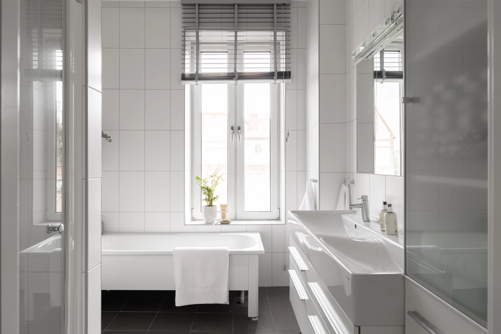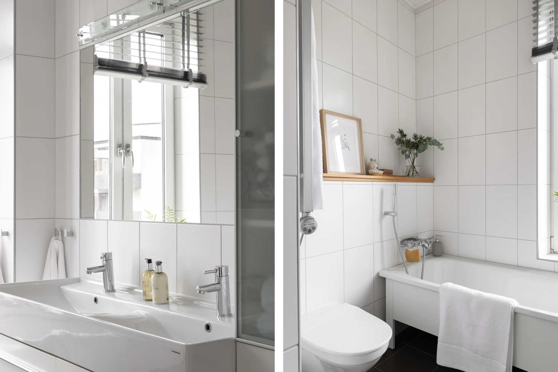 Mörk klinker och vitt kakel. Utrustat med badkar, dusch, vägghängd wc, dubbelhandfat med vit kommod, spegel, högskåp och handdukstork samt golvvärme. Naturligt ljusinsläpp från ett fönster.