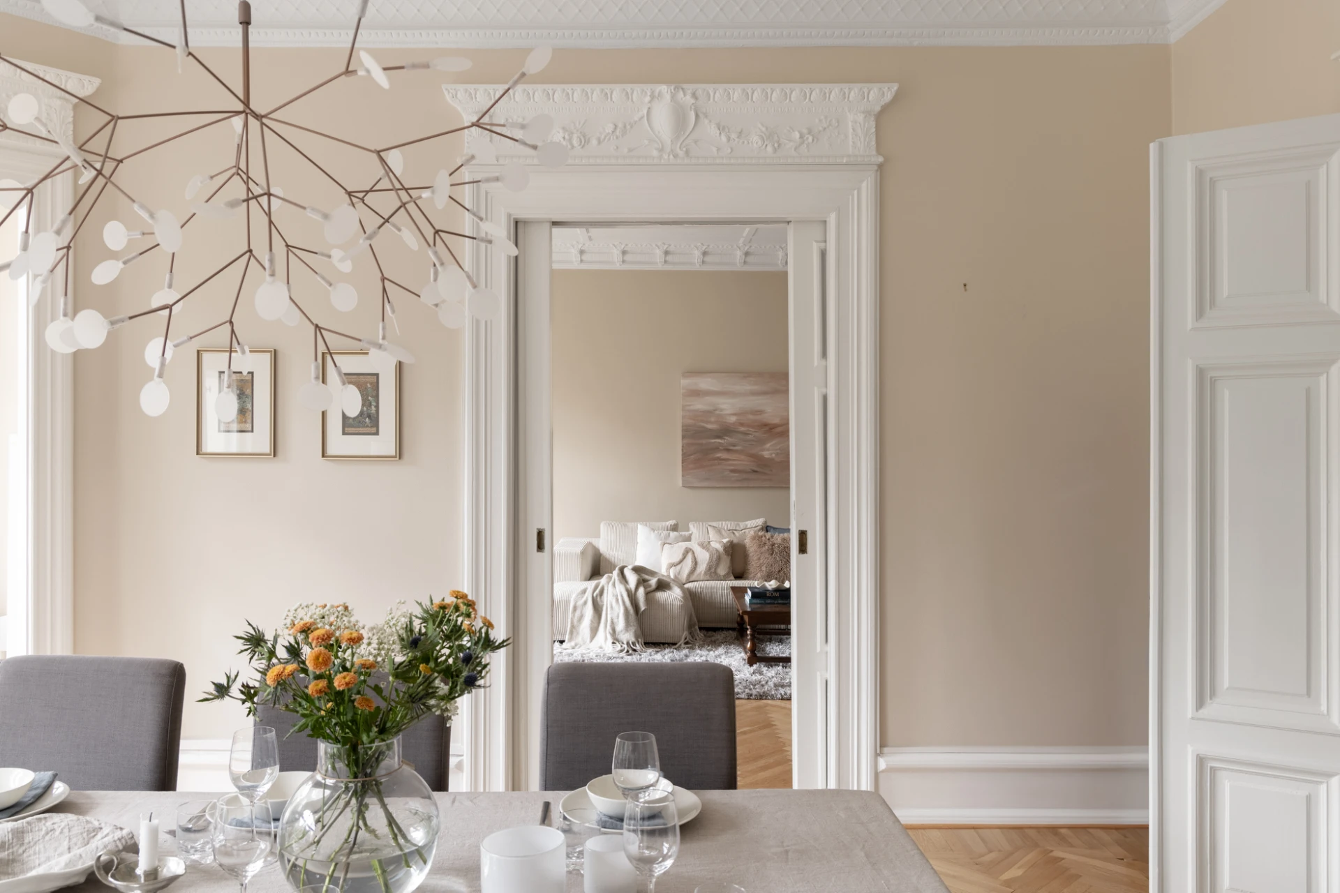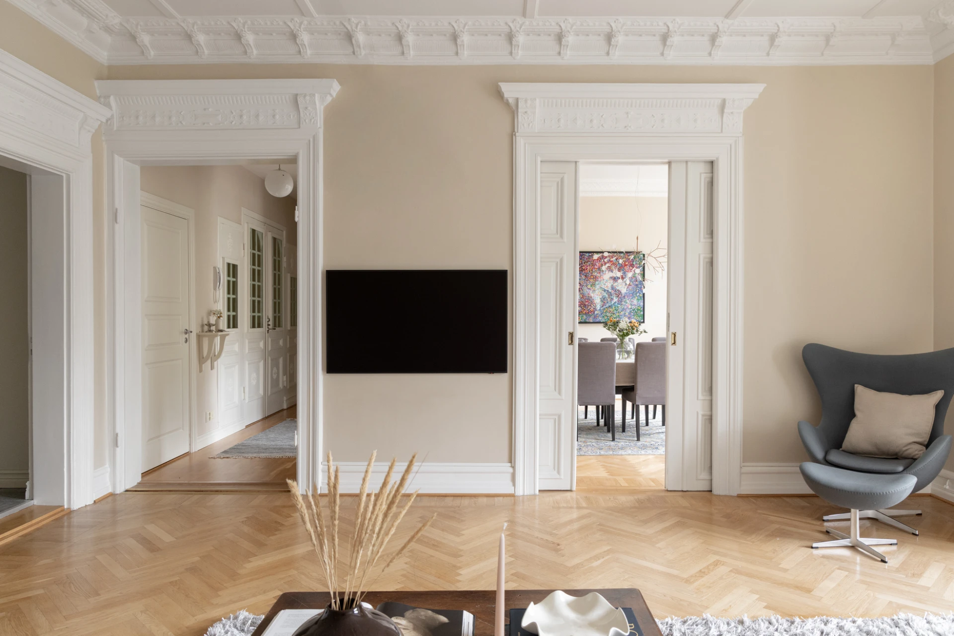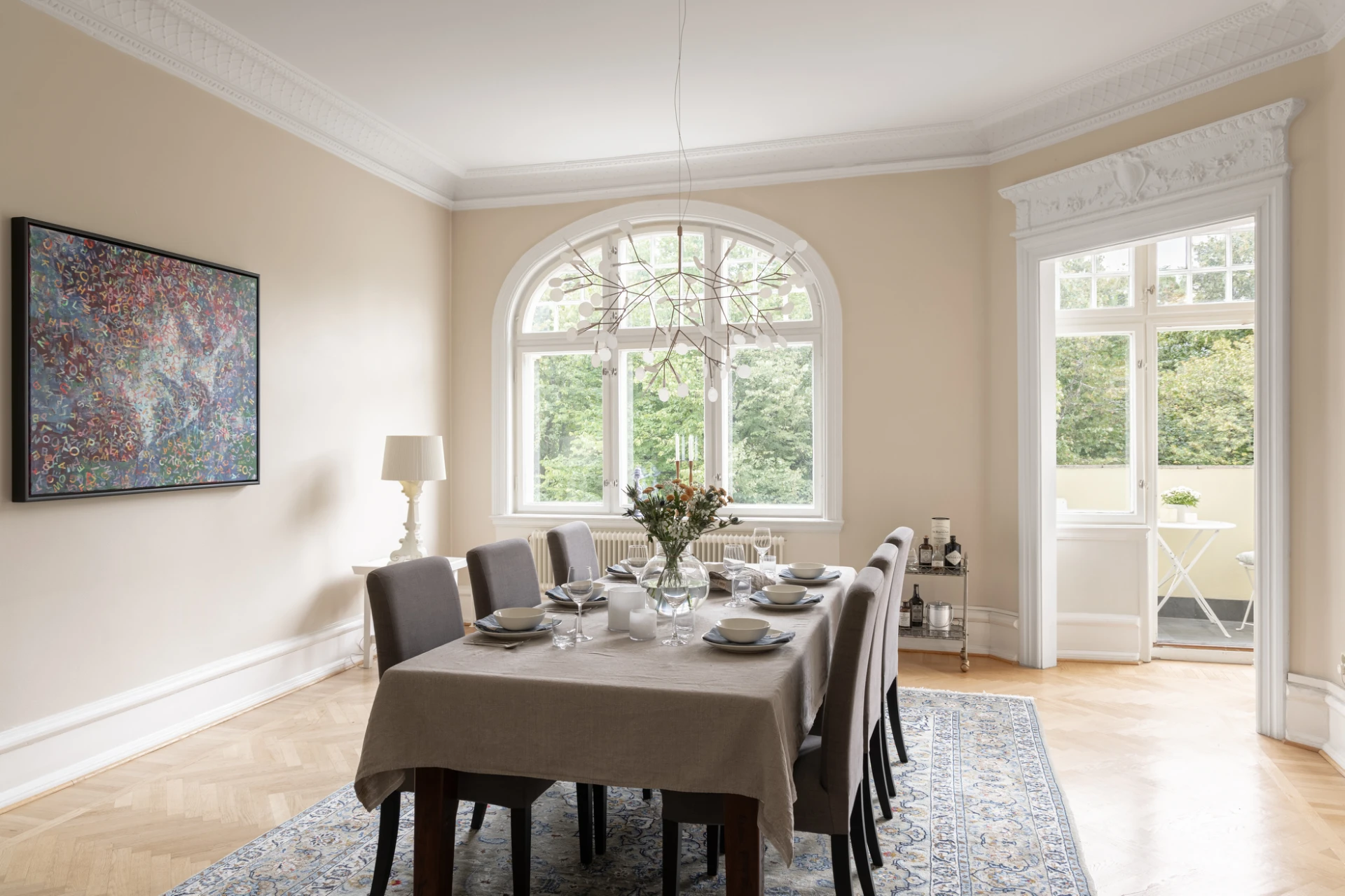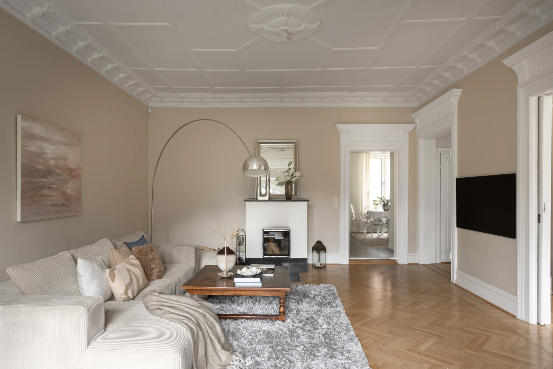 Fiskbensparkett och ljusa väggar. Pampig takstuckatur, eldstad och skjutdörr till matsalen. Trevlig nivåskillnad vid fönstret.