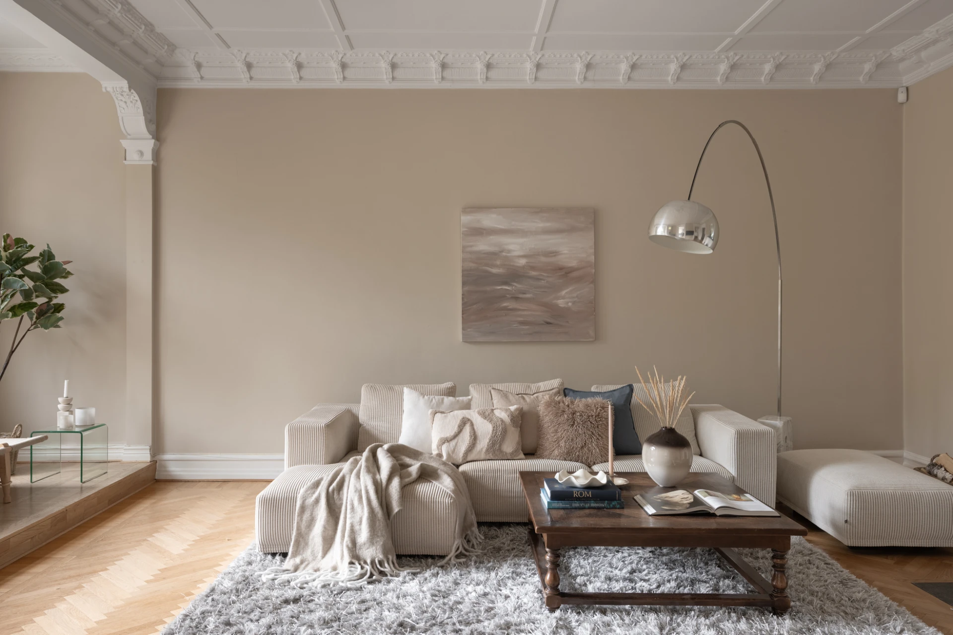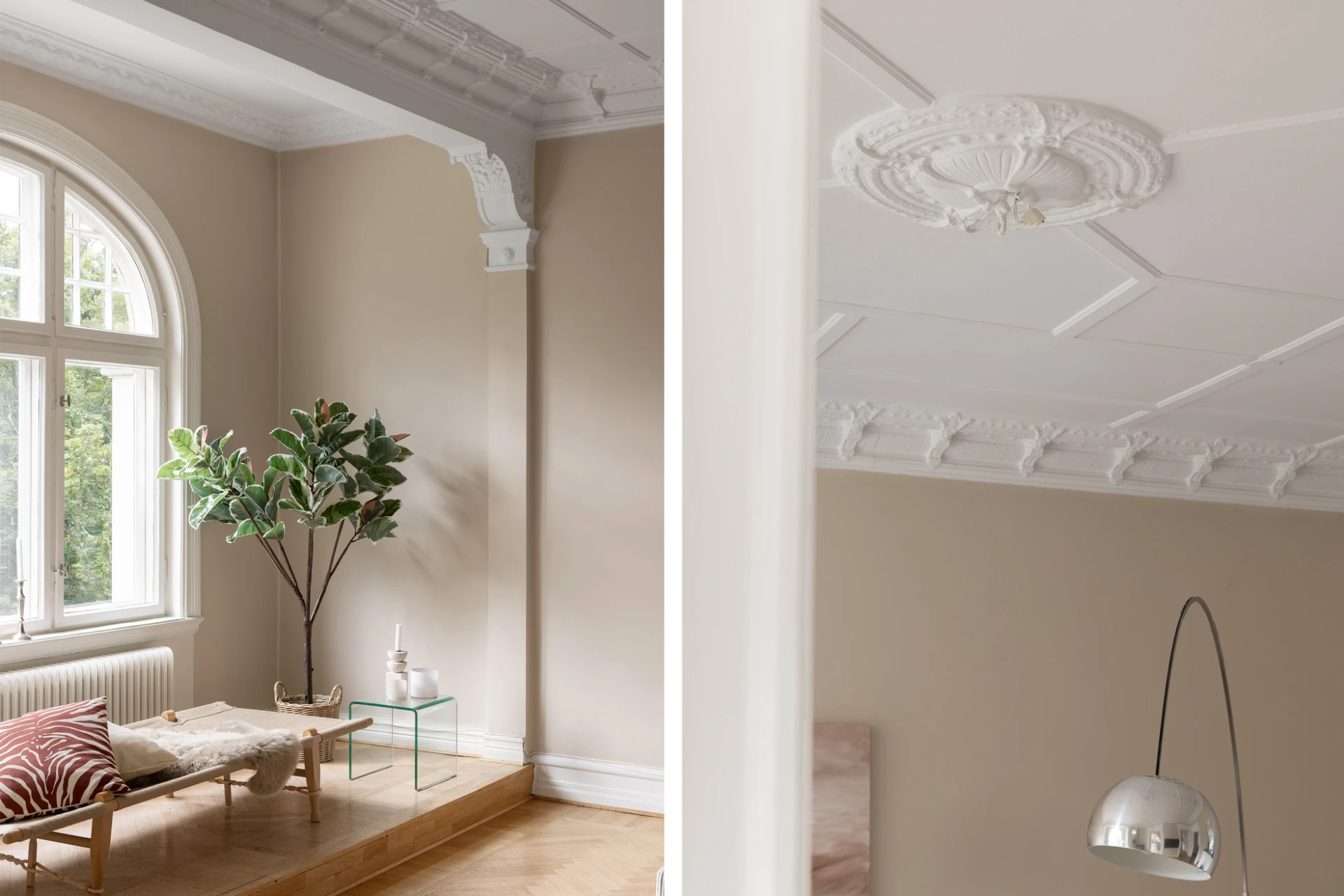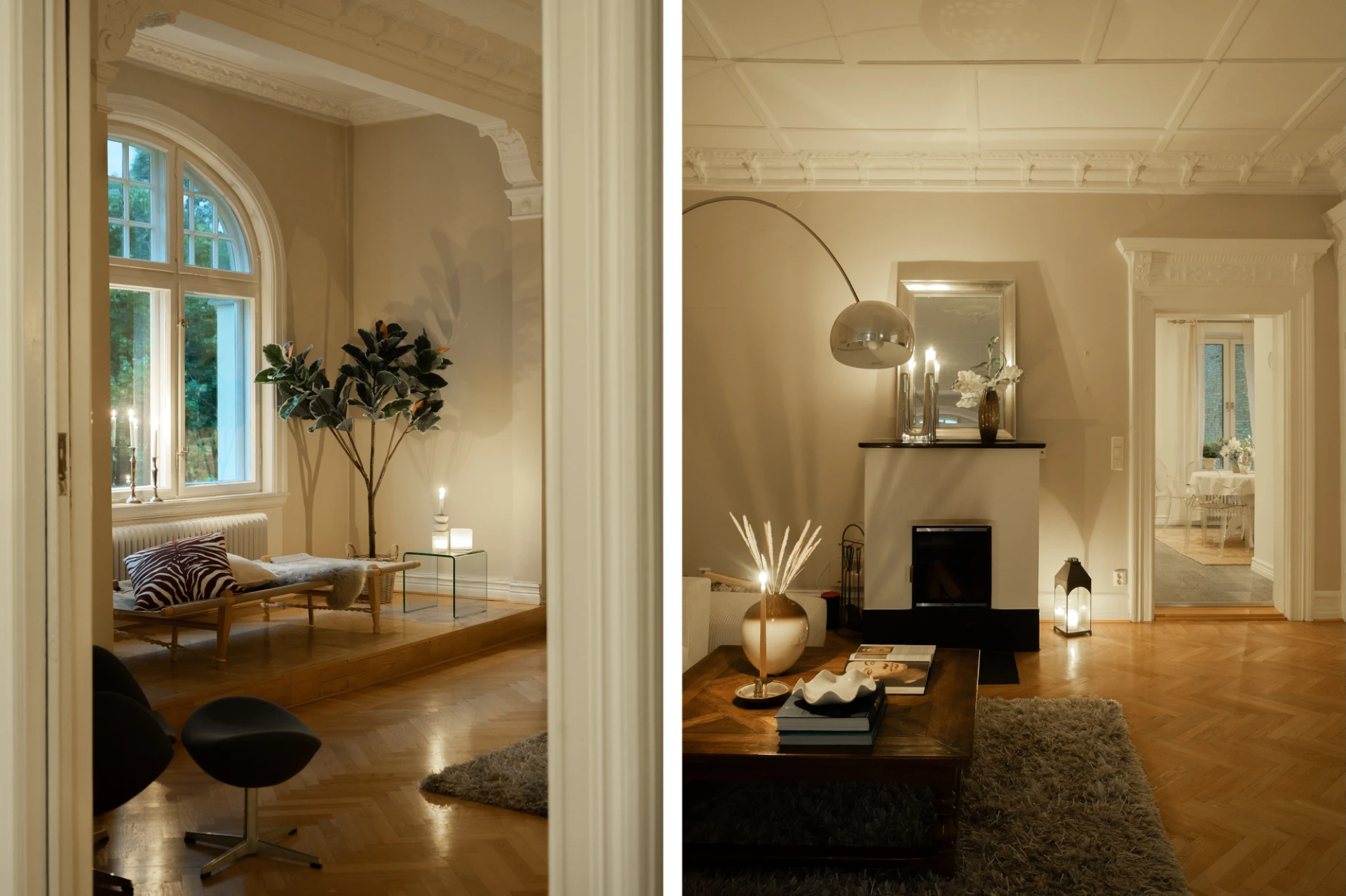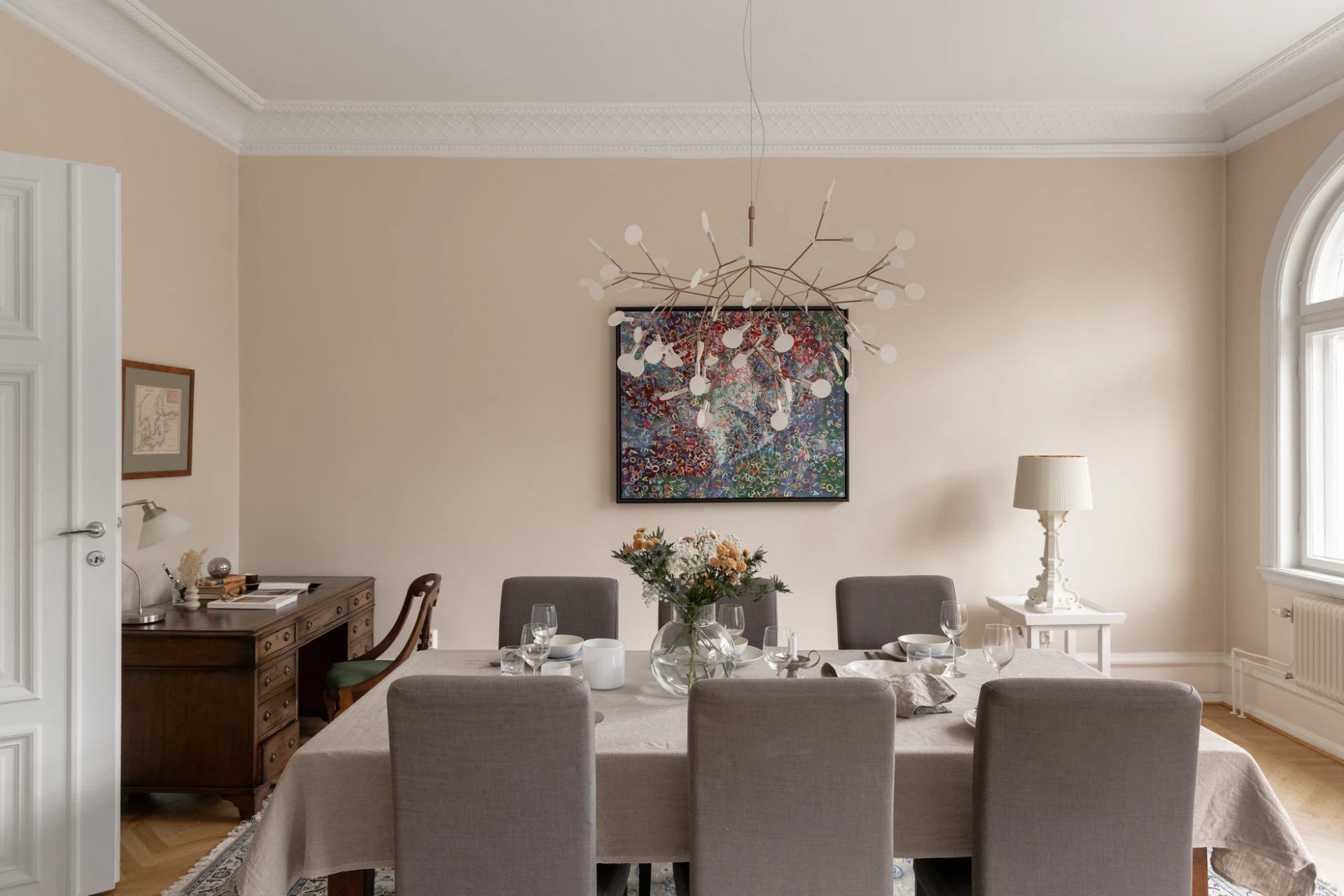 Fiskbensparkett och ljusa väggar. Pampig takstuckatur, eldstad och skjutdörr till matsalen. Trevlig nivåskillnad vid fönstret.