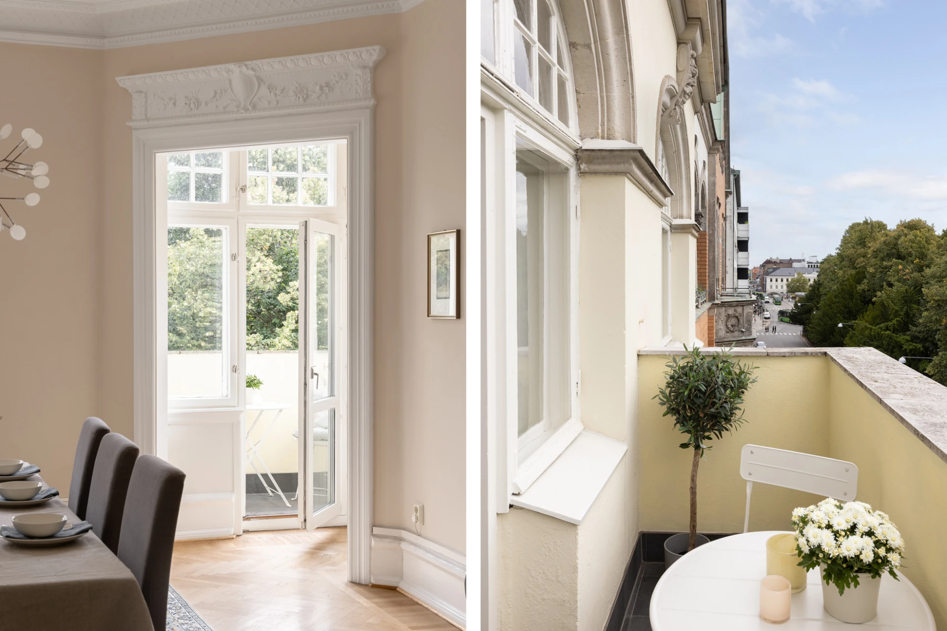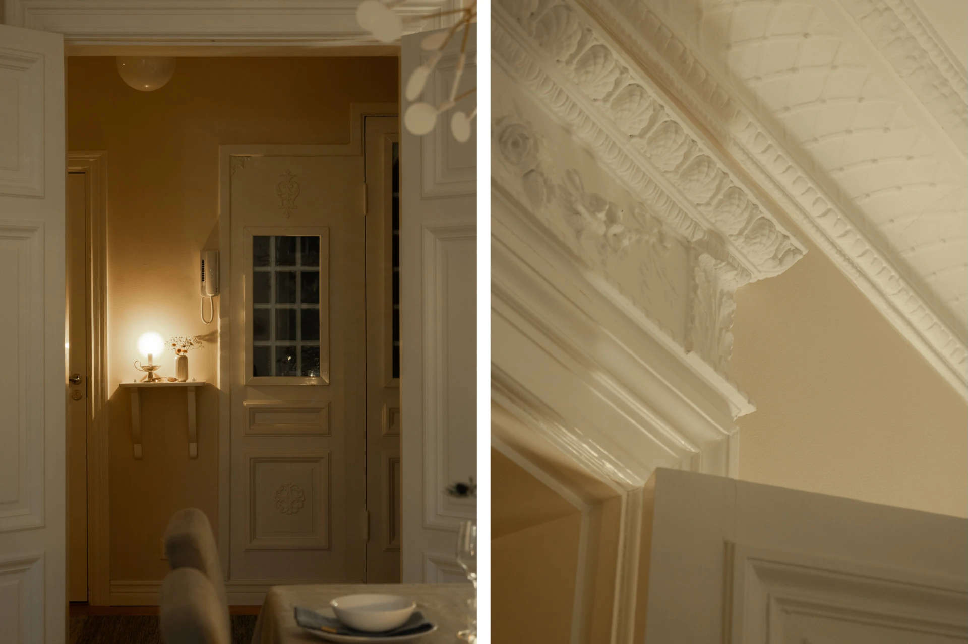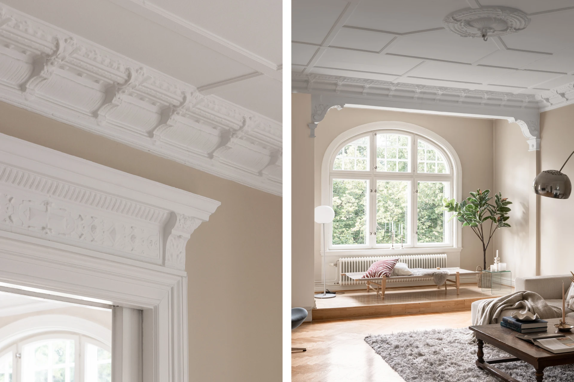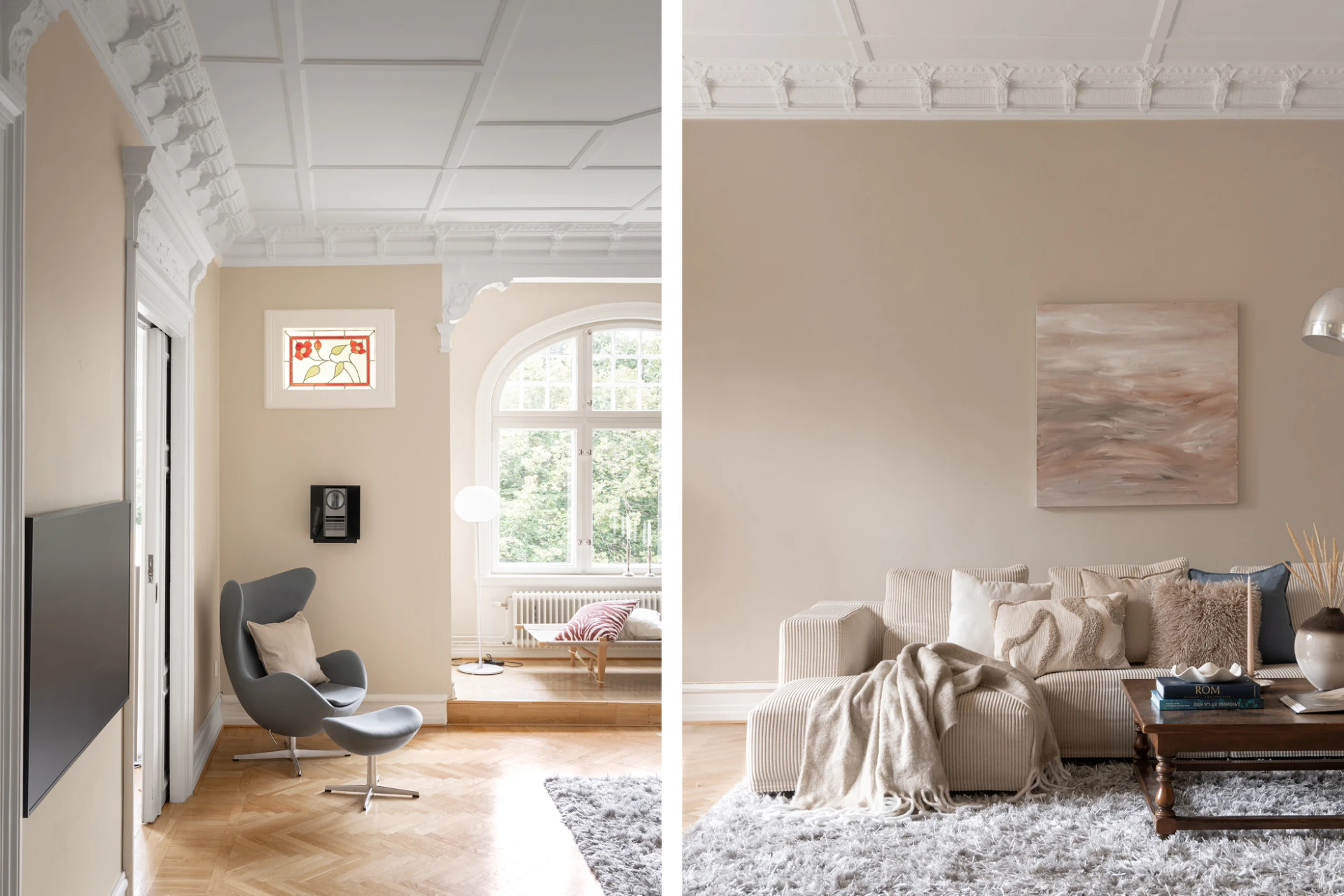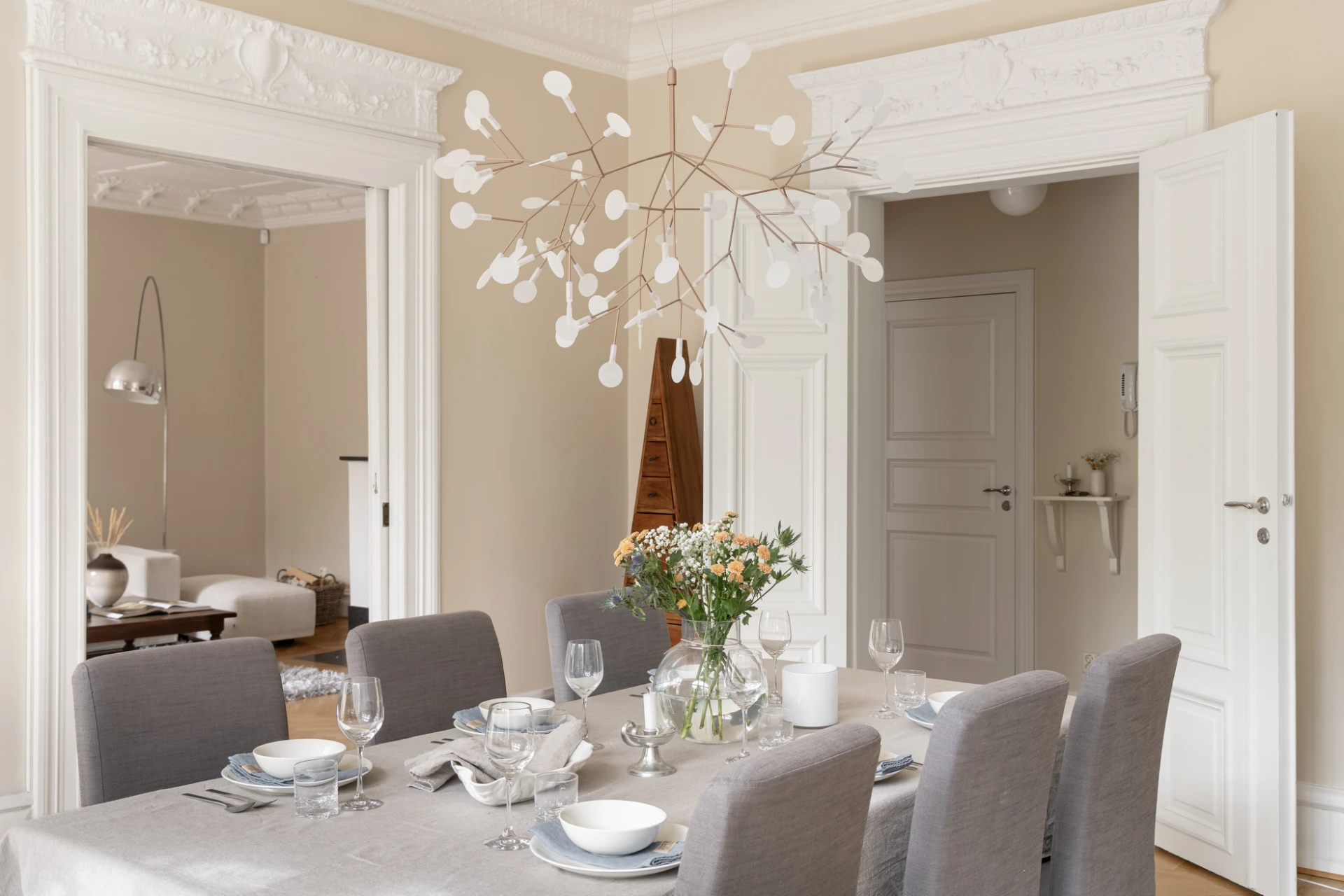 Fiskbensparkett och ljusa väggar. Pampig takstuckatur, eldstad och skjutdörr till matsalen. Trevlig nivåskillnad vid fönstret.