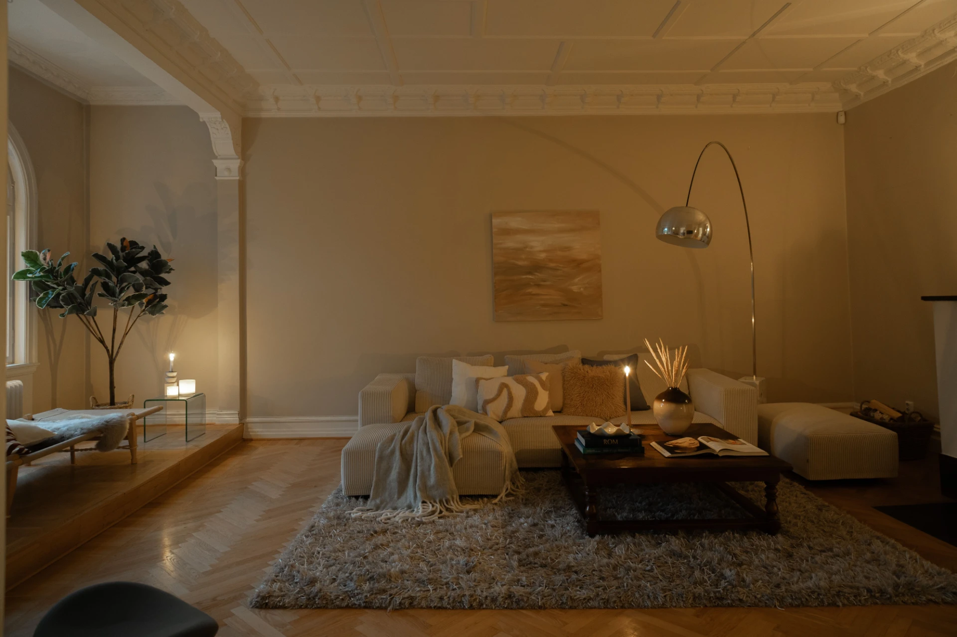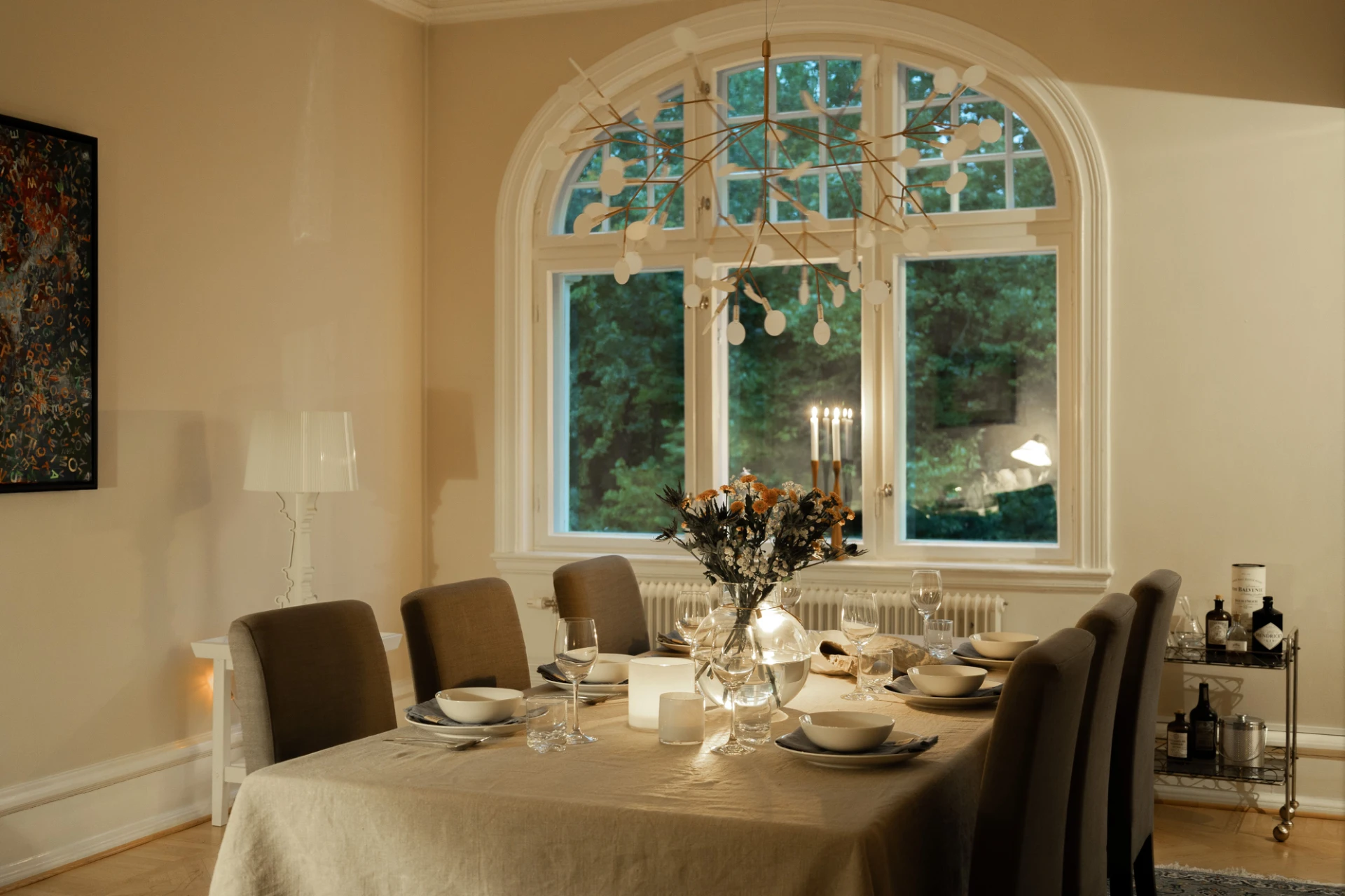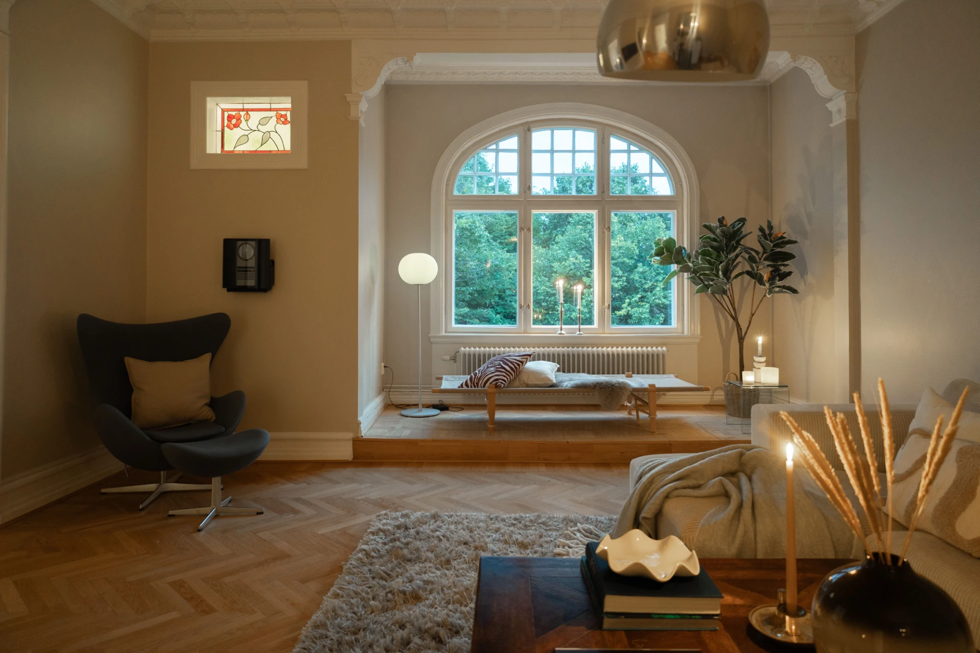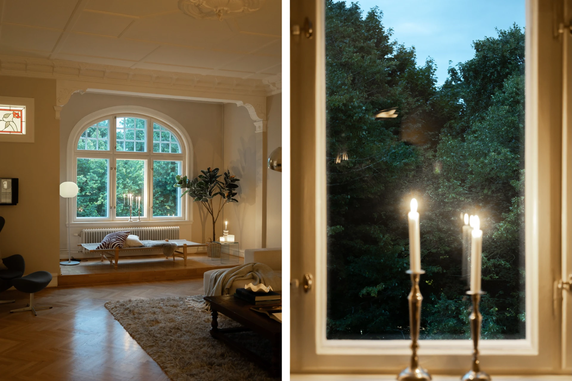 Fiskbensparkett och ljusa väggar. Pampig takstuckatur, eldstad och skjutdörr till matsalen. Trevlig nivåskillnad vid fönstret.