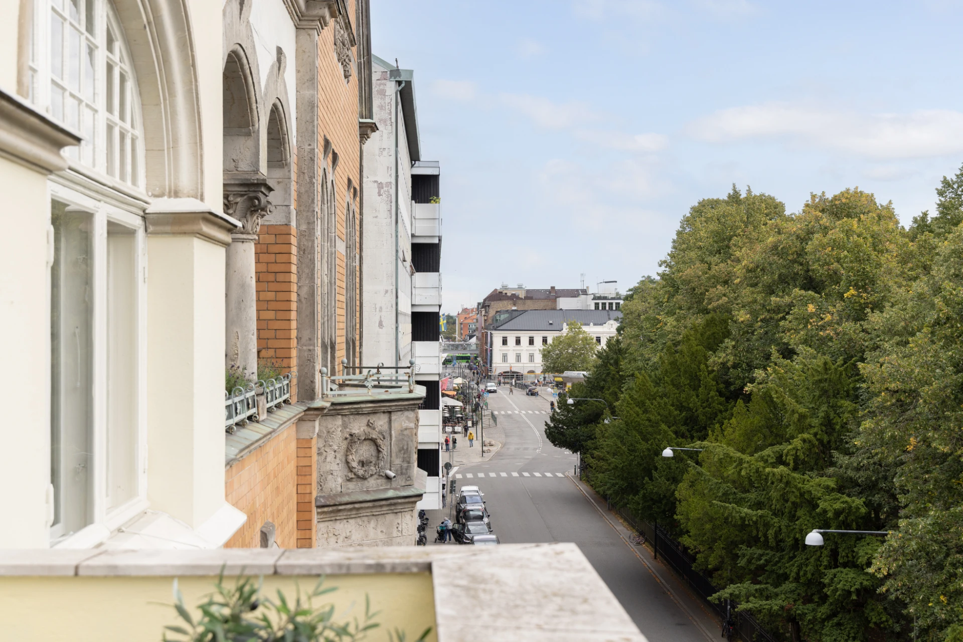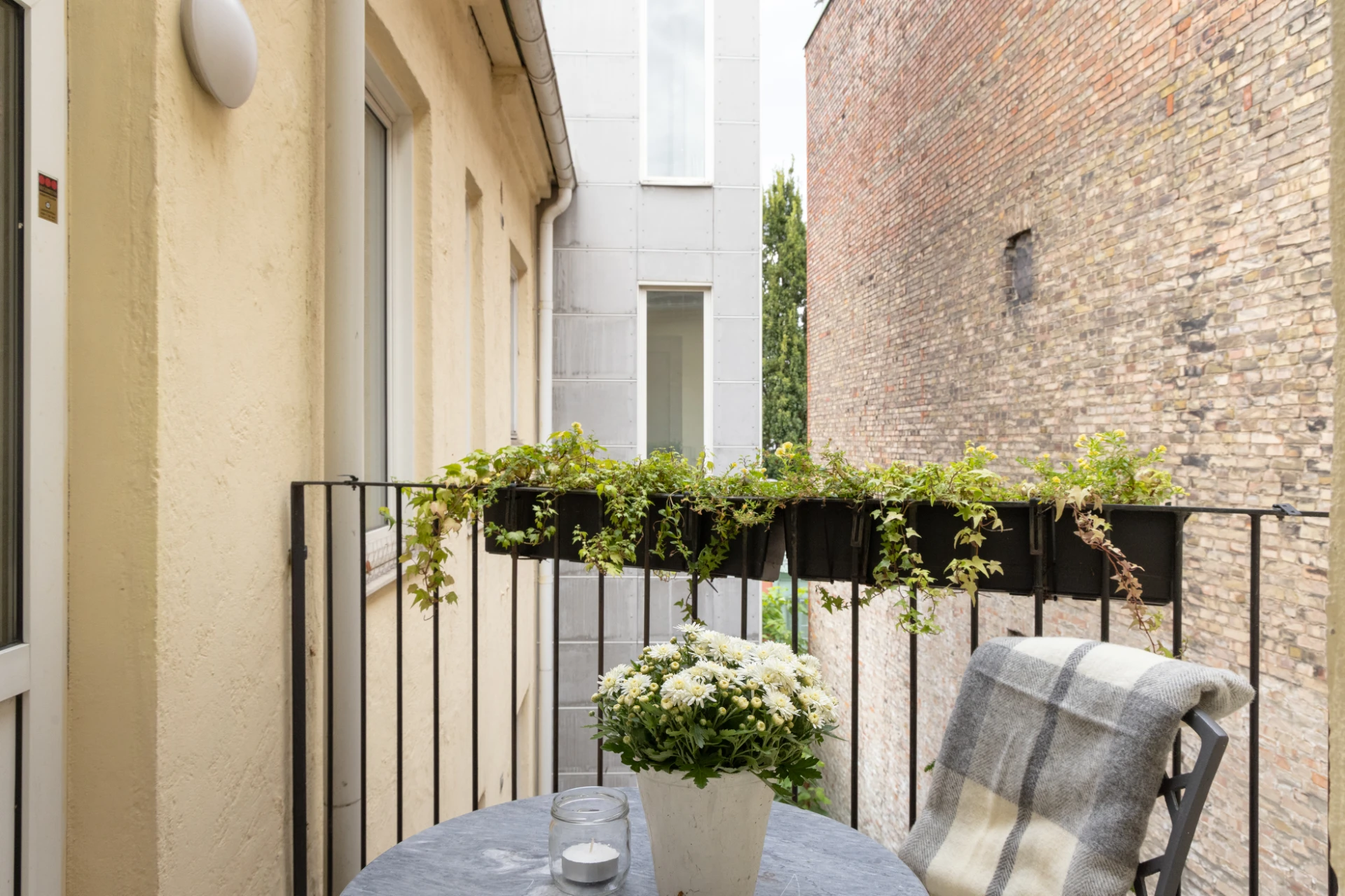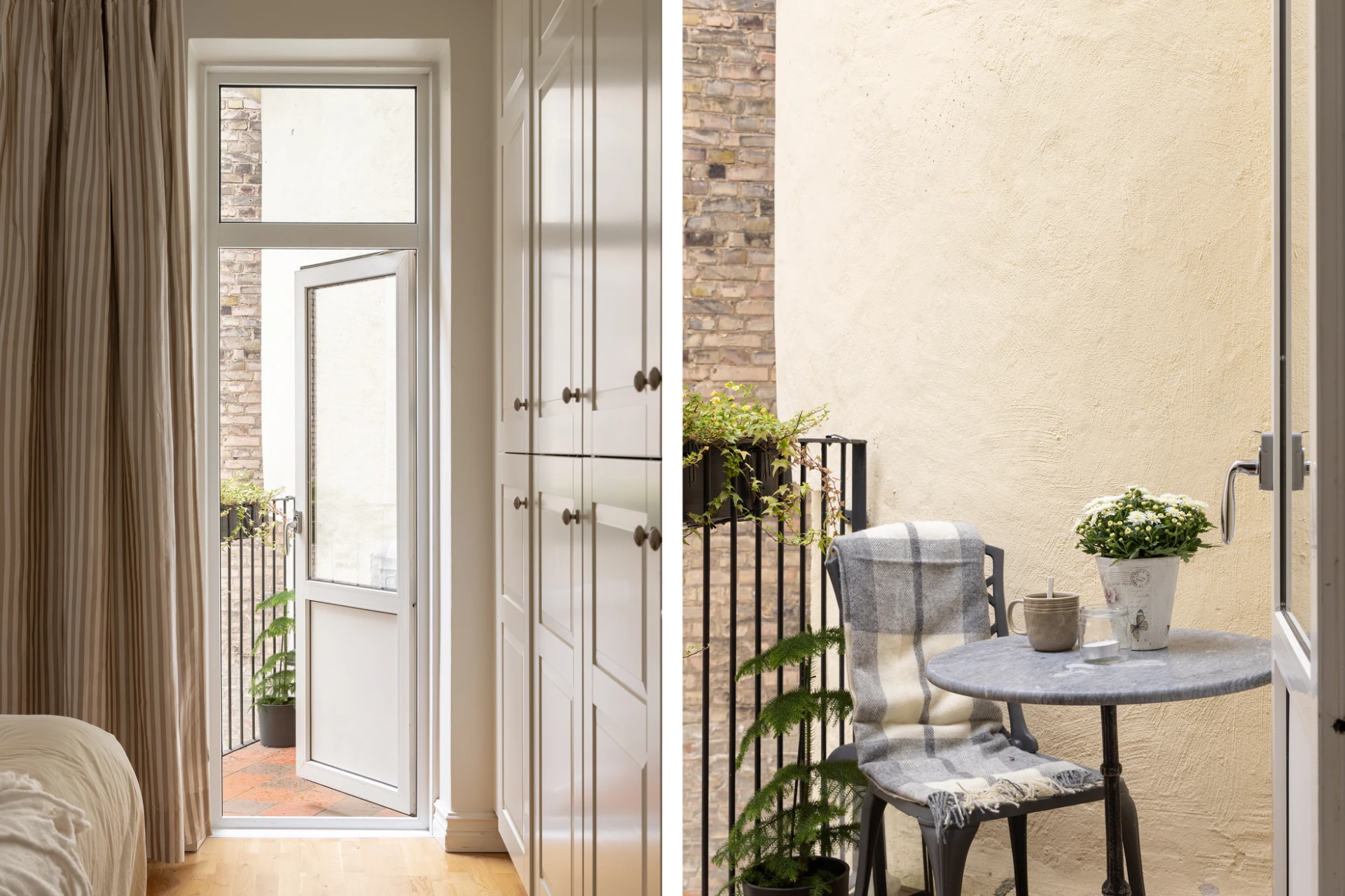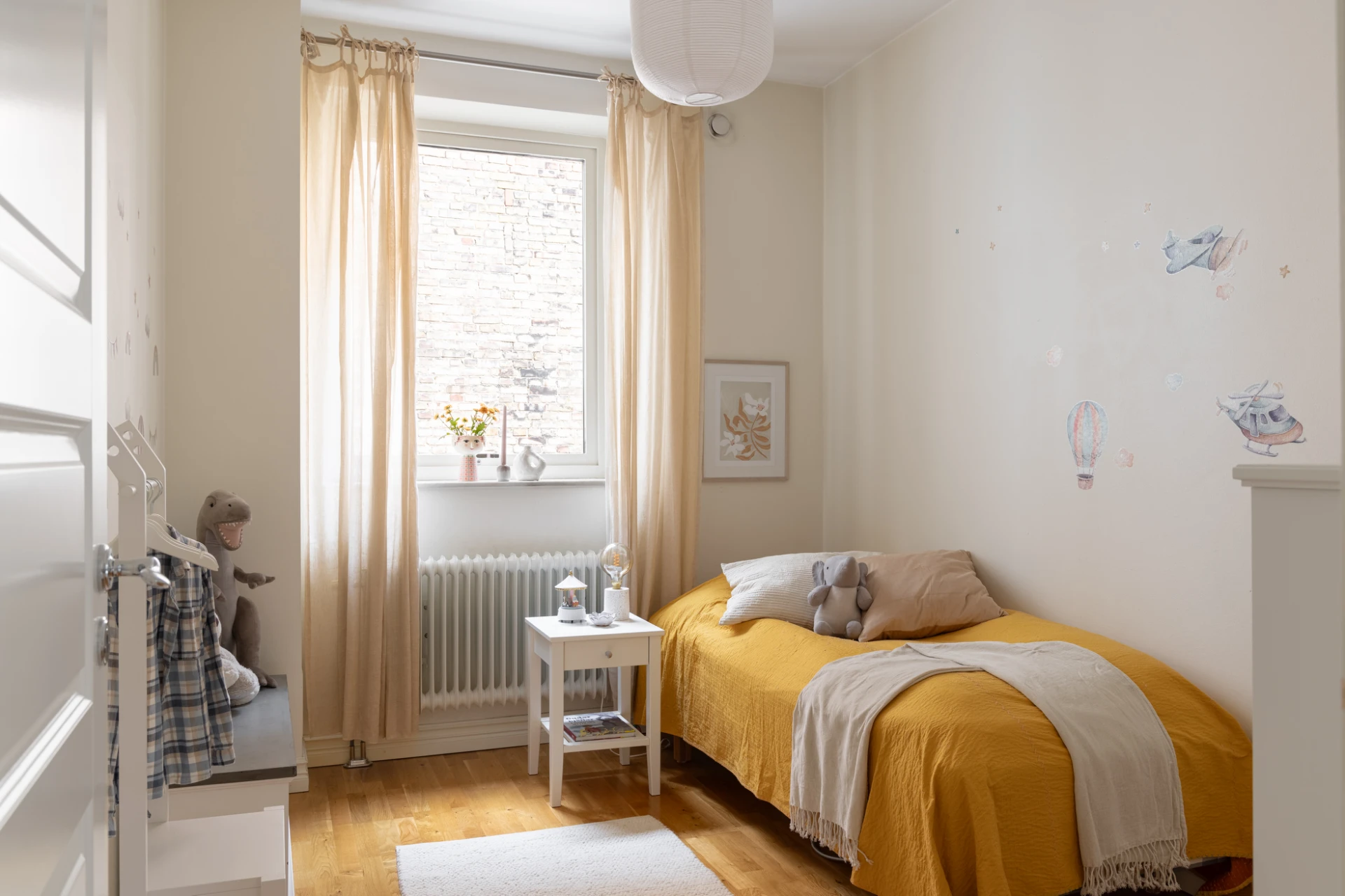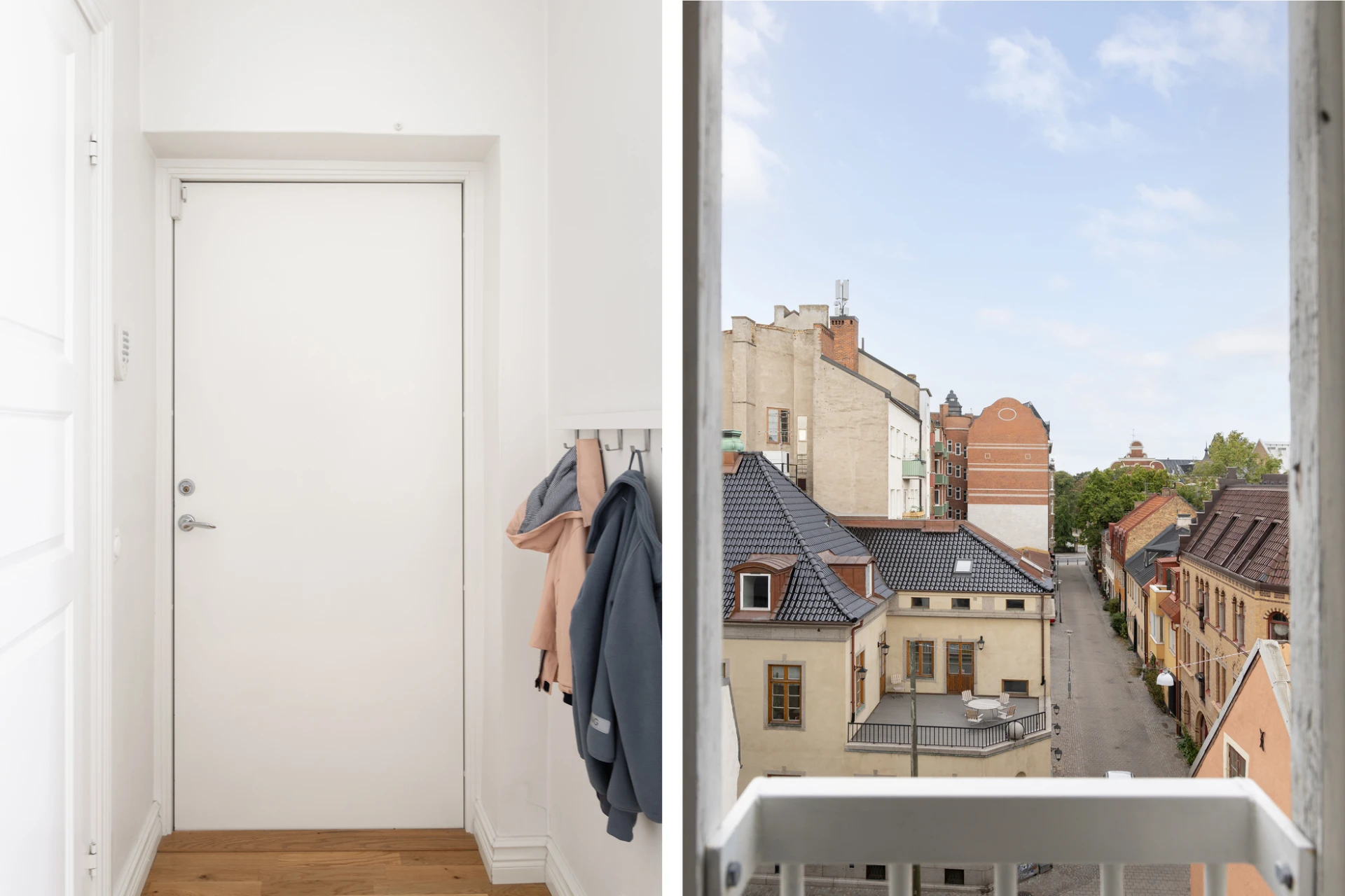 Parkettgolv och vita väggar. Förvaring i fyra inbyggda klädskåp. Utgång till gårdsvänd balkong.