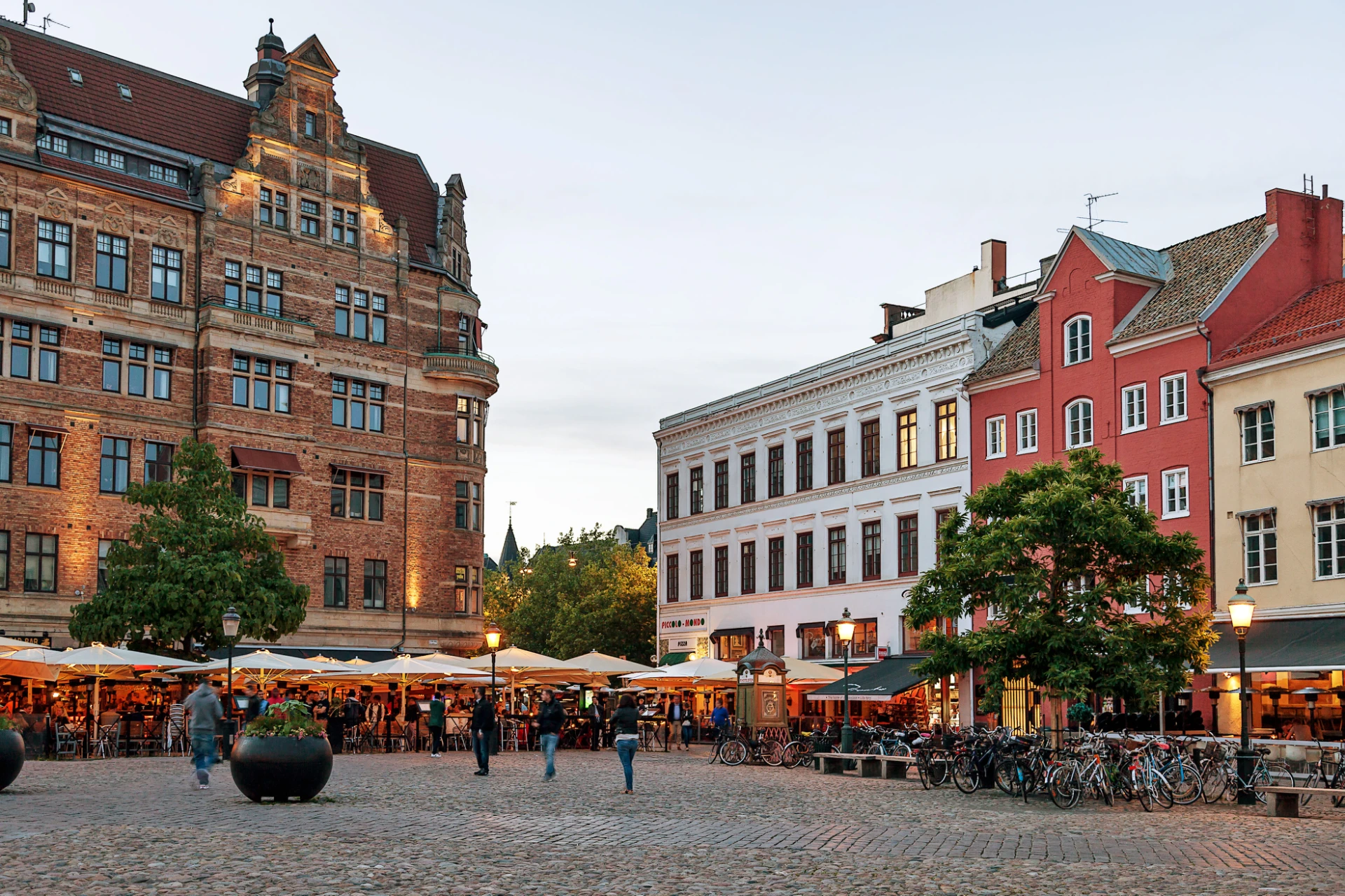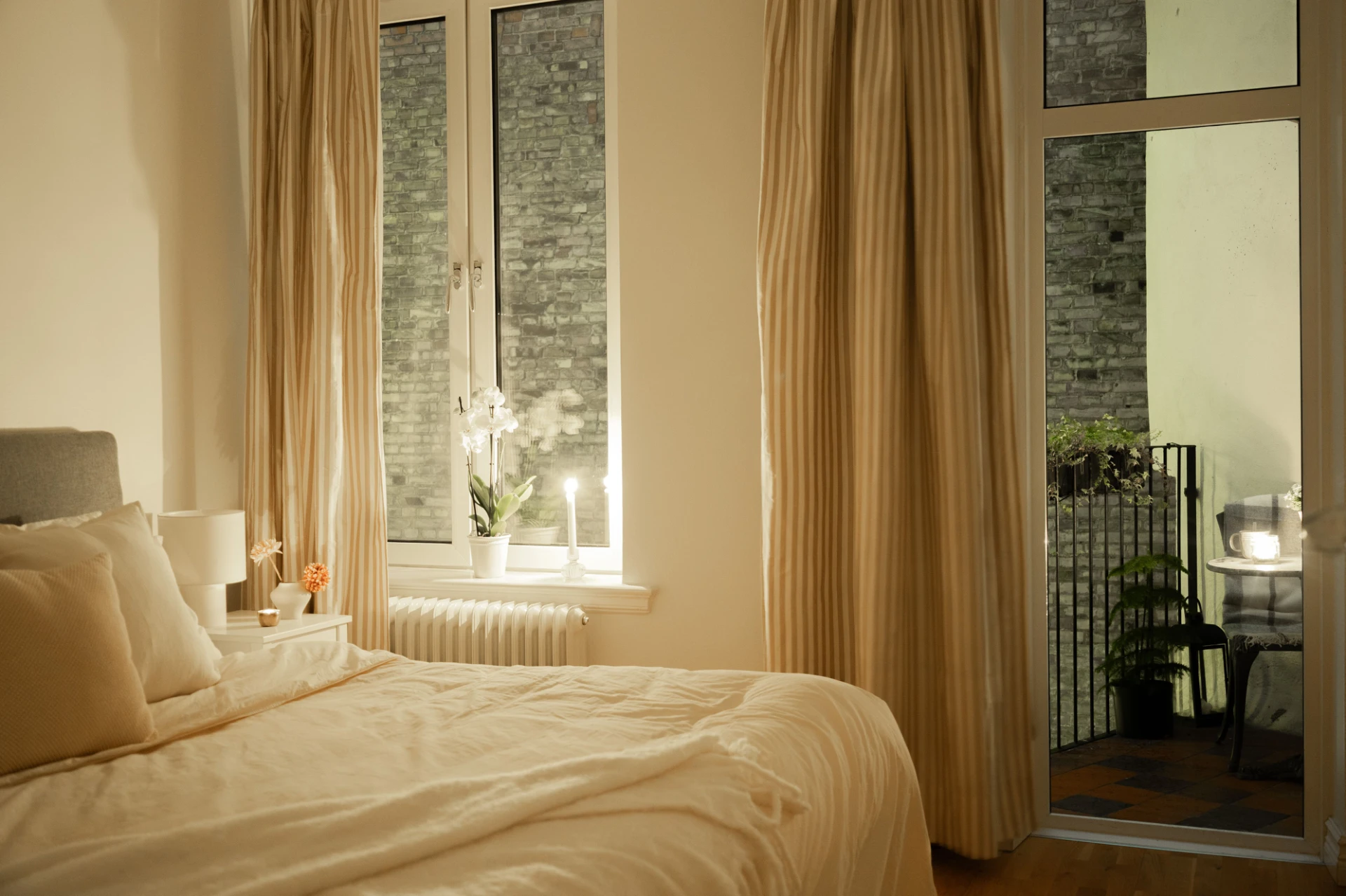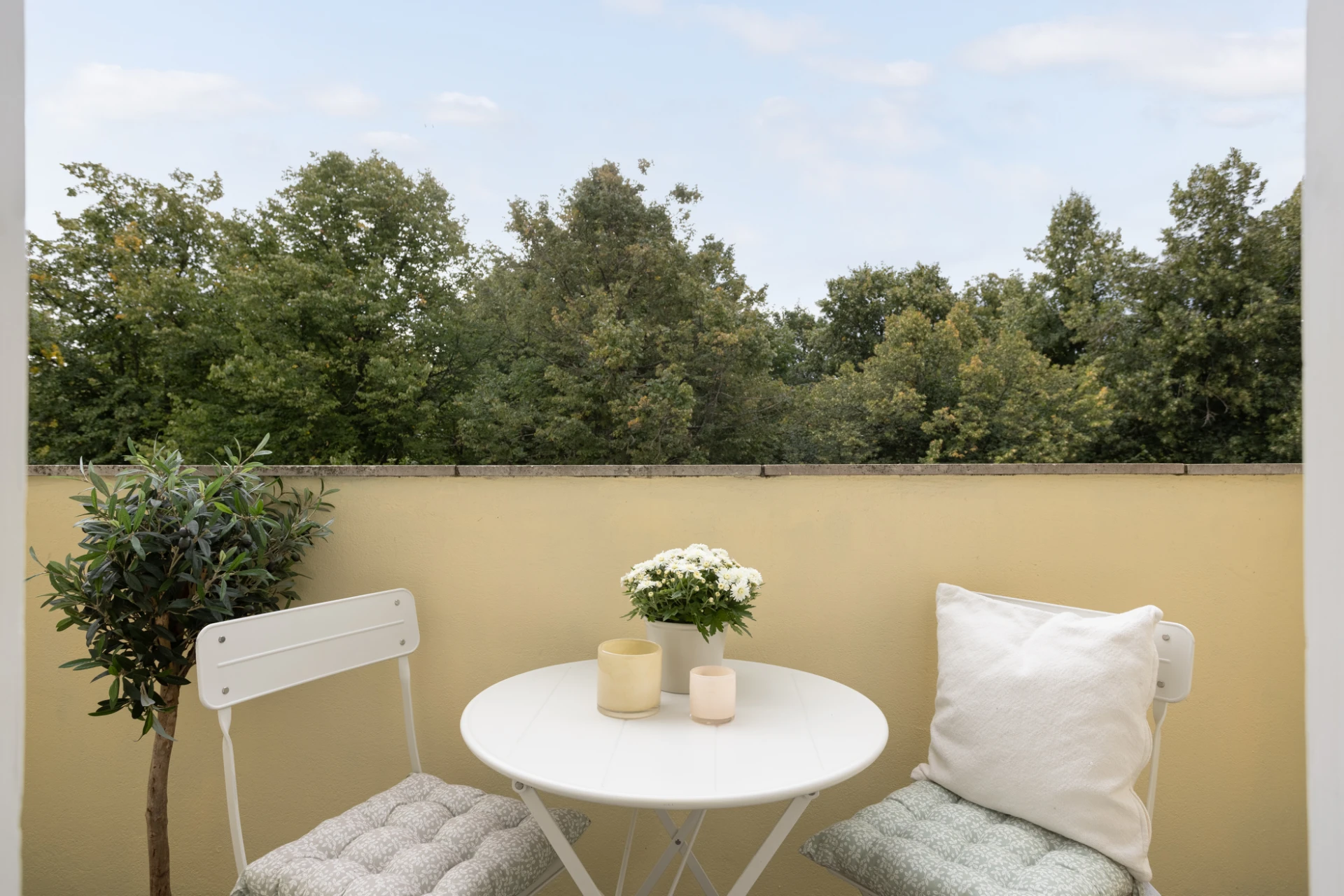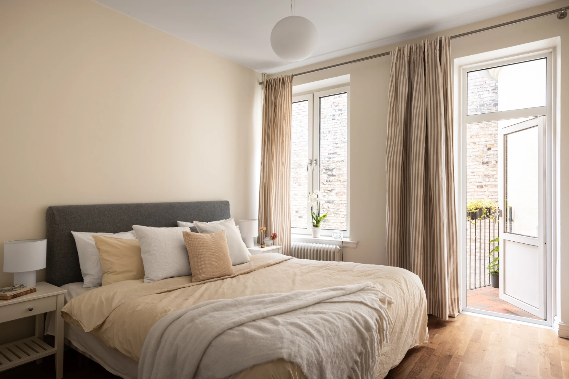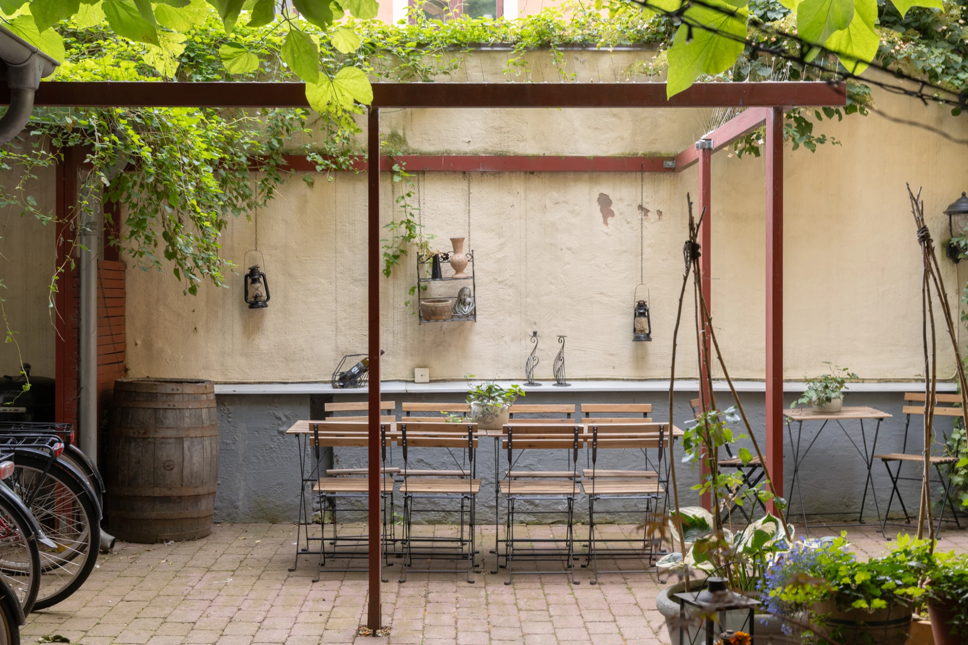 Parkettgolv och vita väggar. Förvaring i fyra inbyggda klädskåp. Utgång till gårdsvänd balkong.