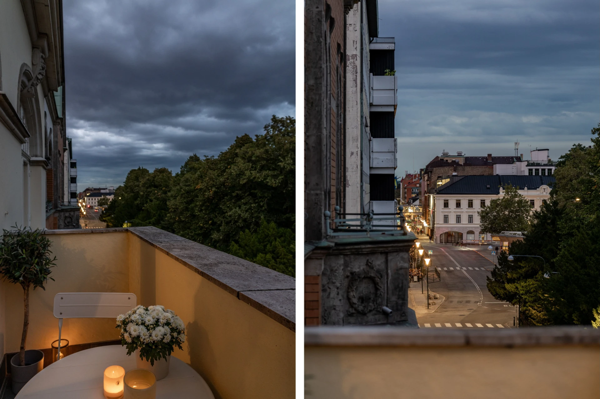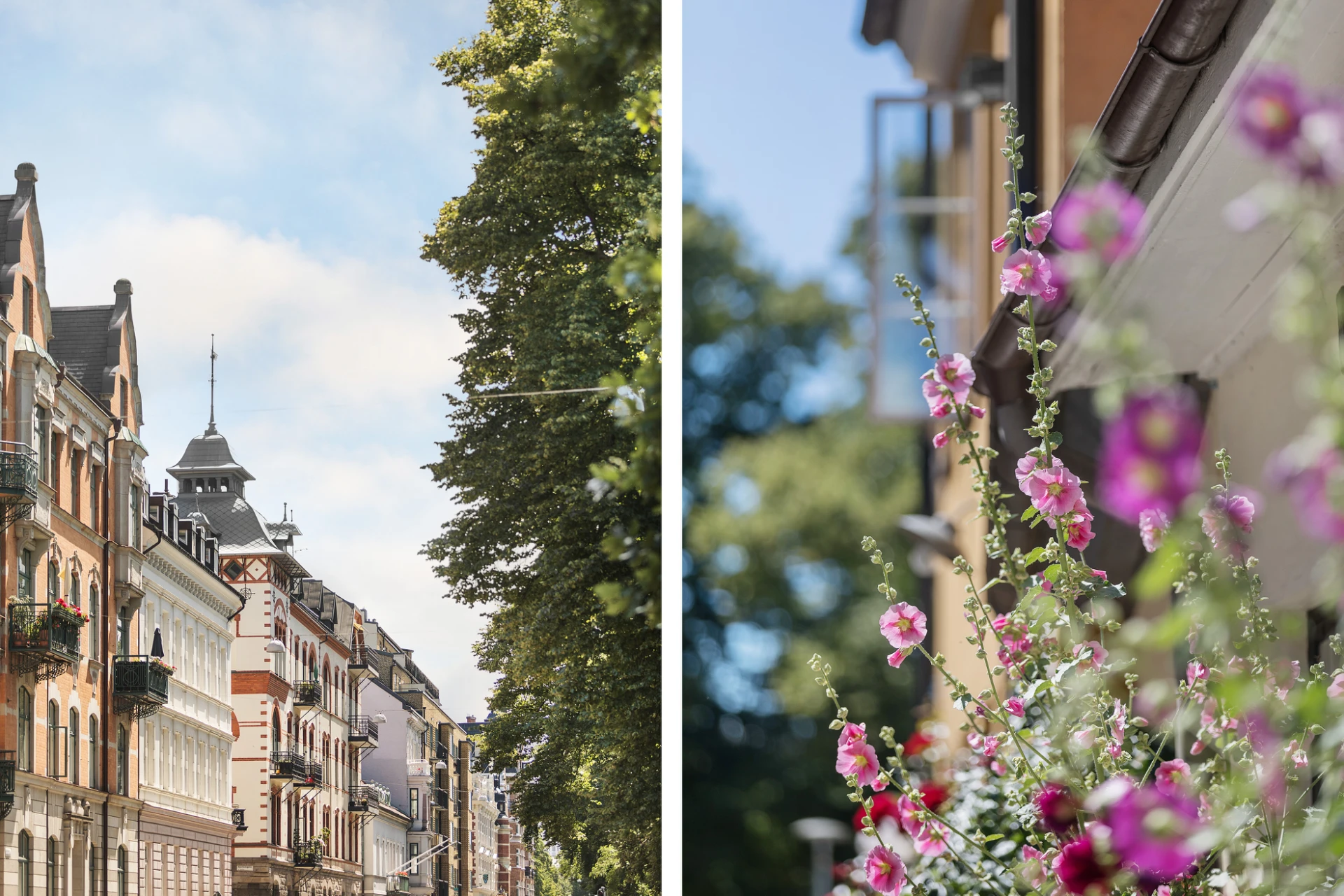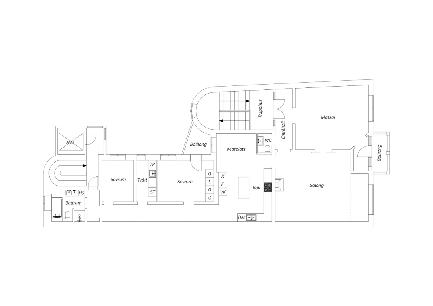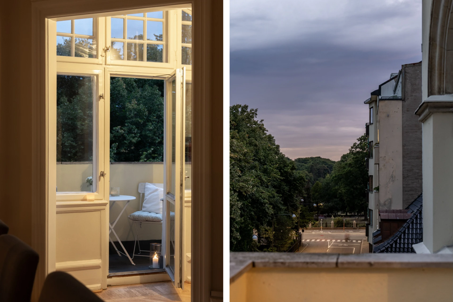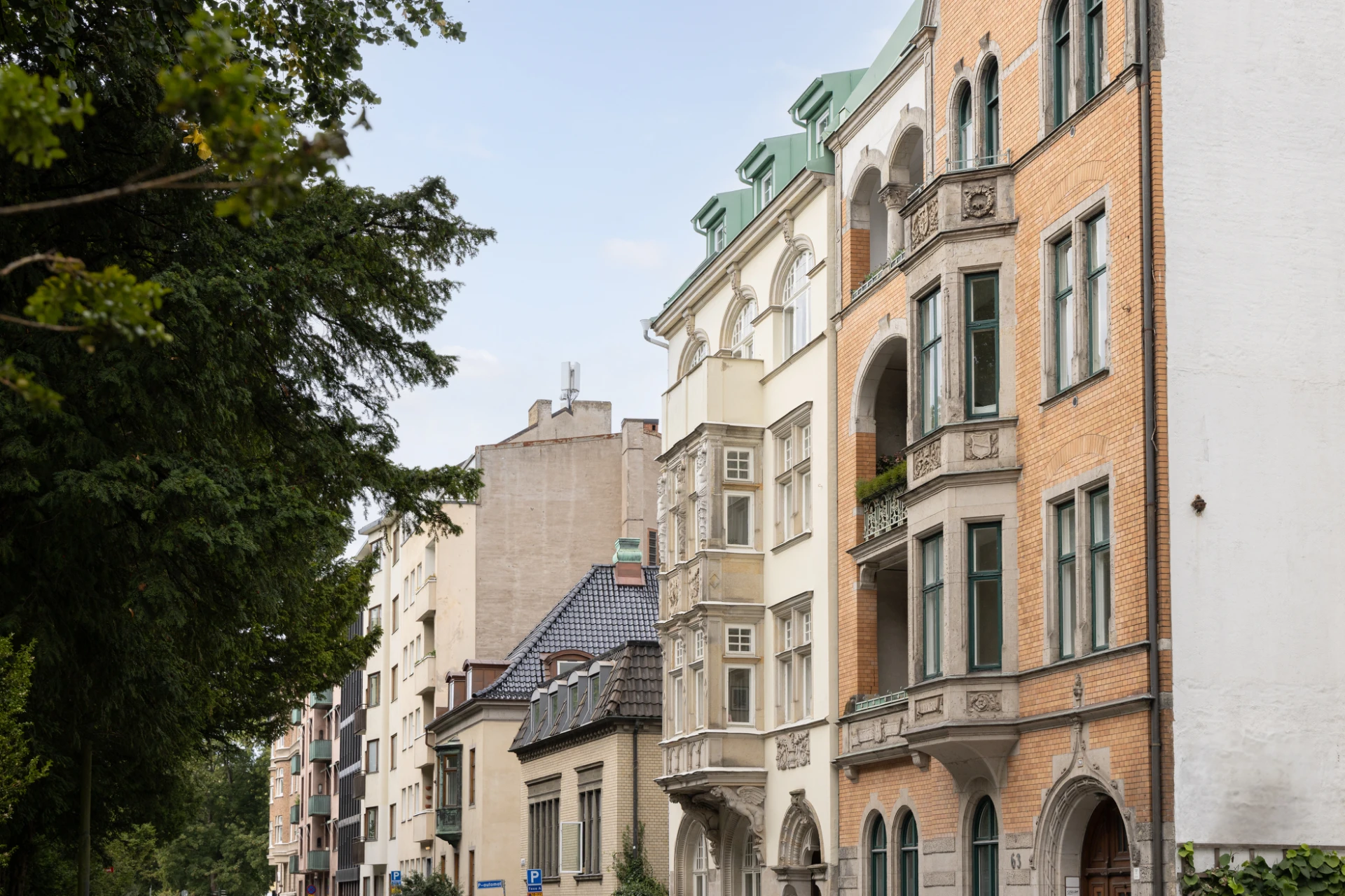 Fiskbensparkett och ljusa väggar. Takstuckatur. Dörrar med sirliga dörröverstycken mot salong och hall. Utgång till balkong i söderläge.