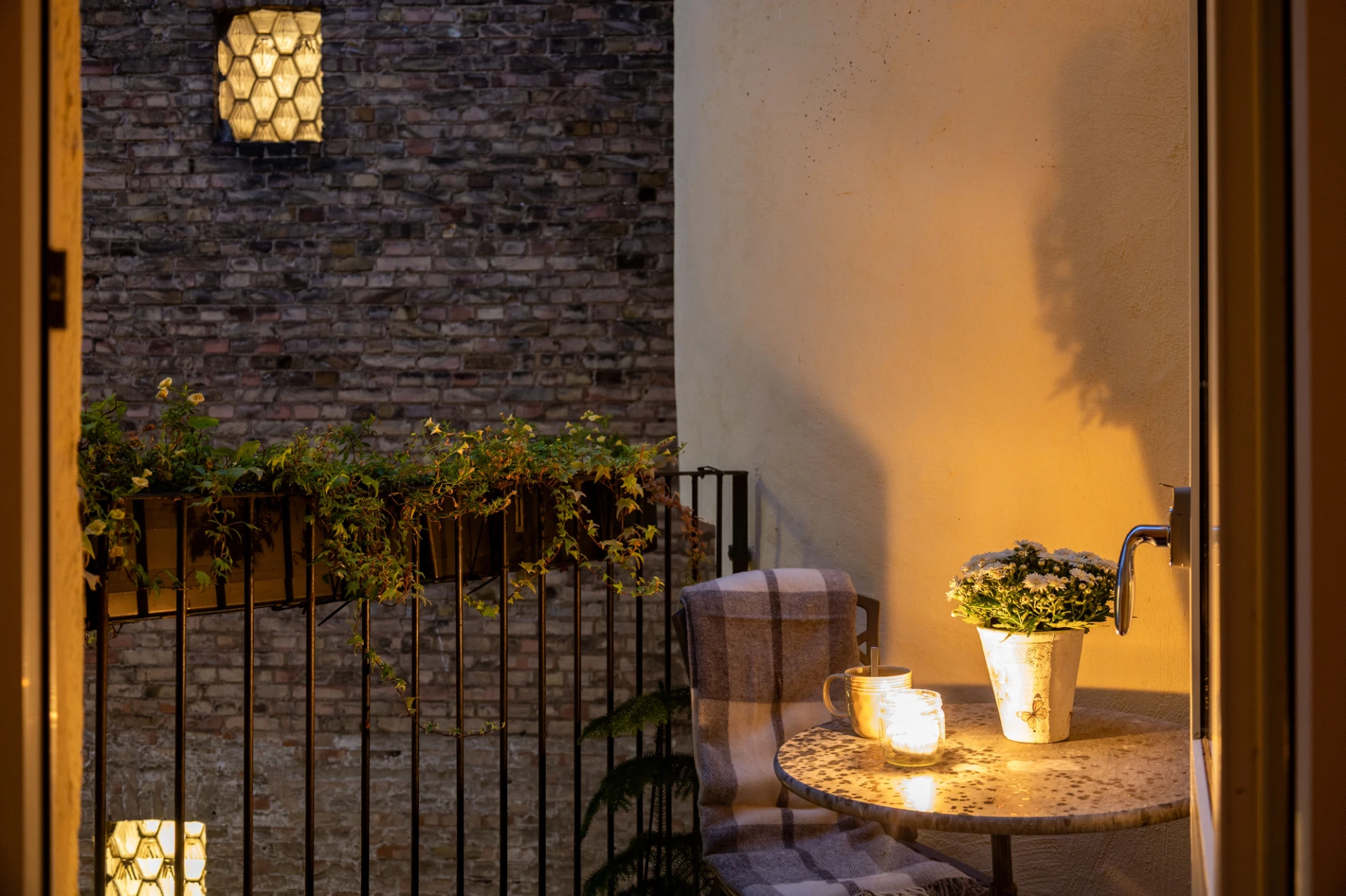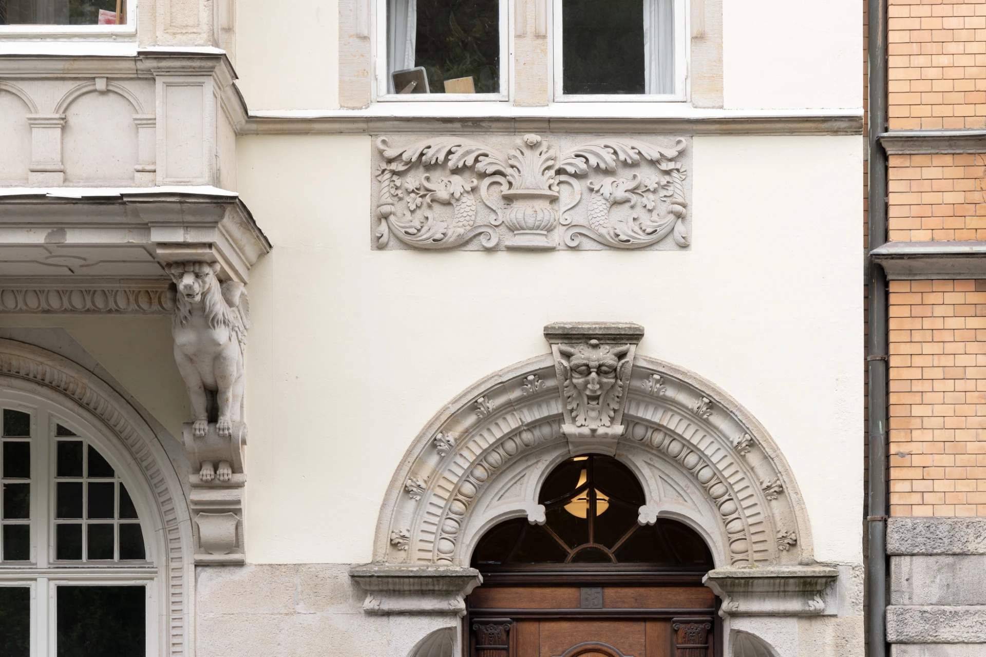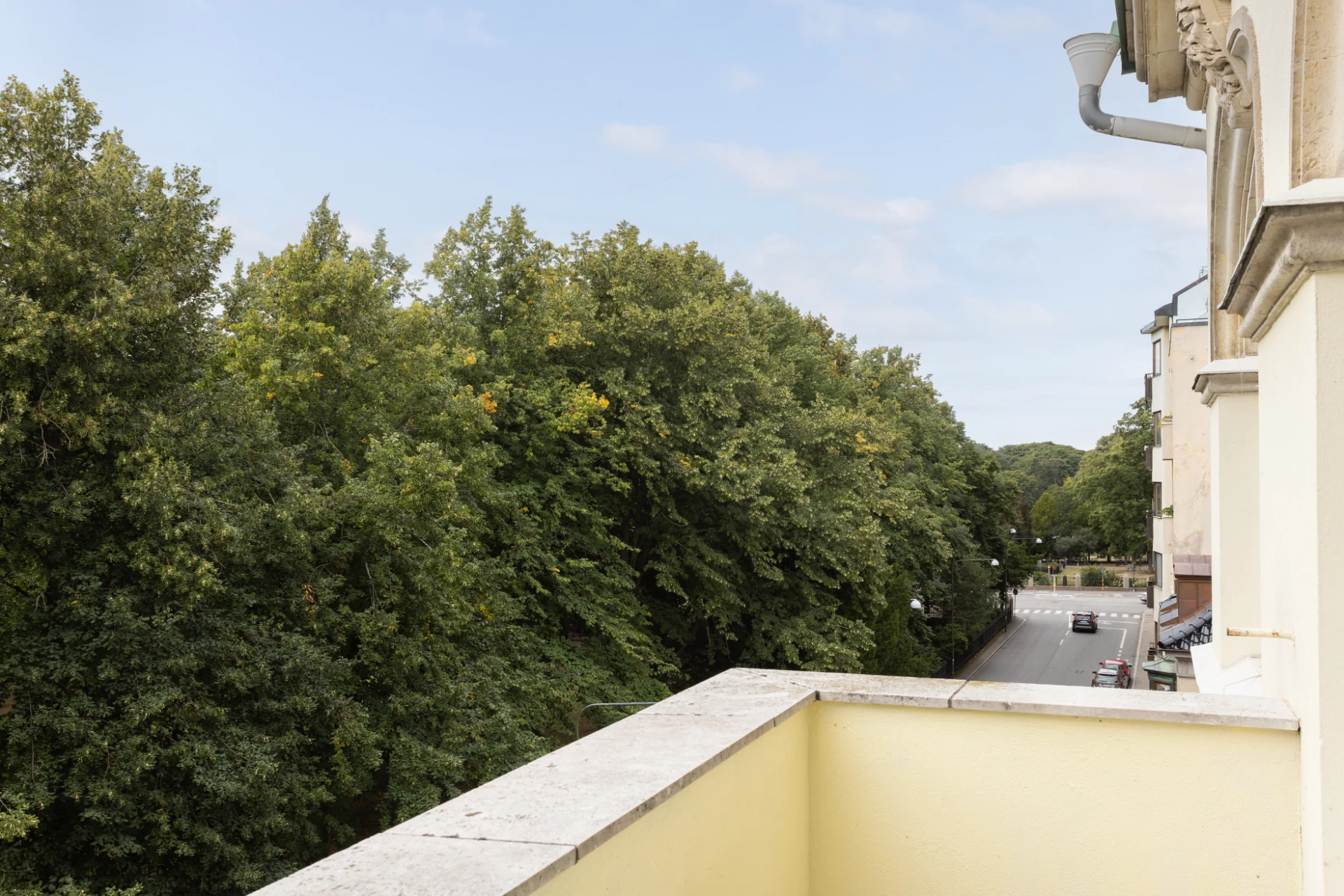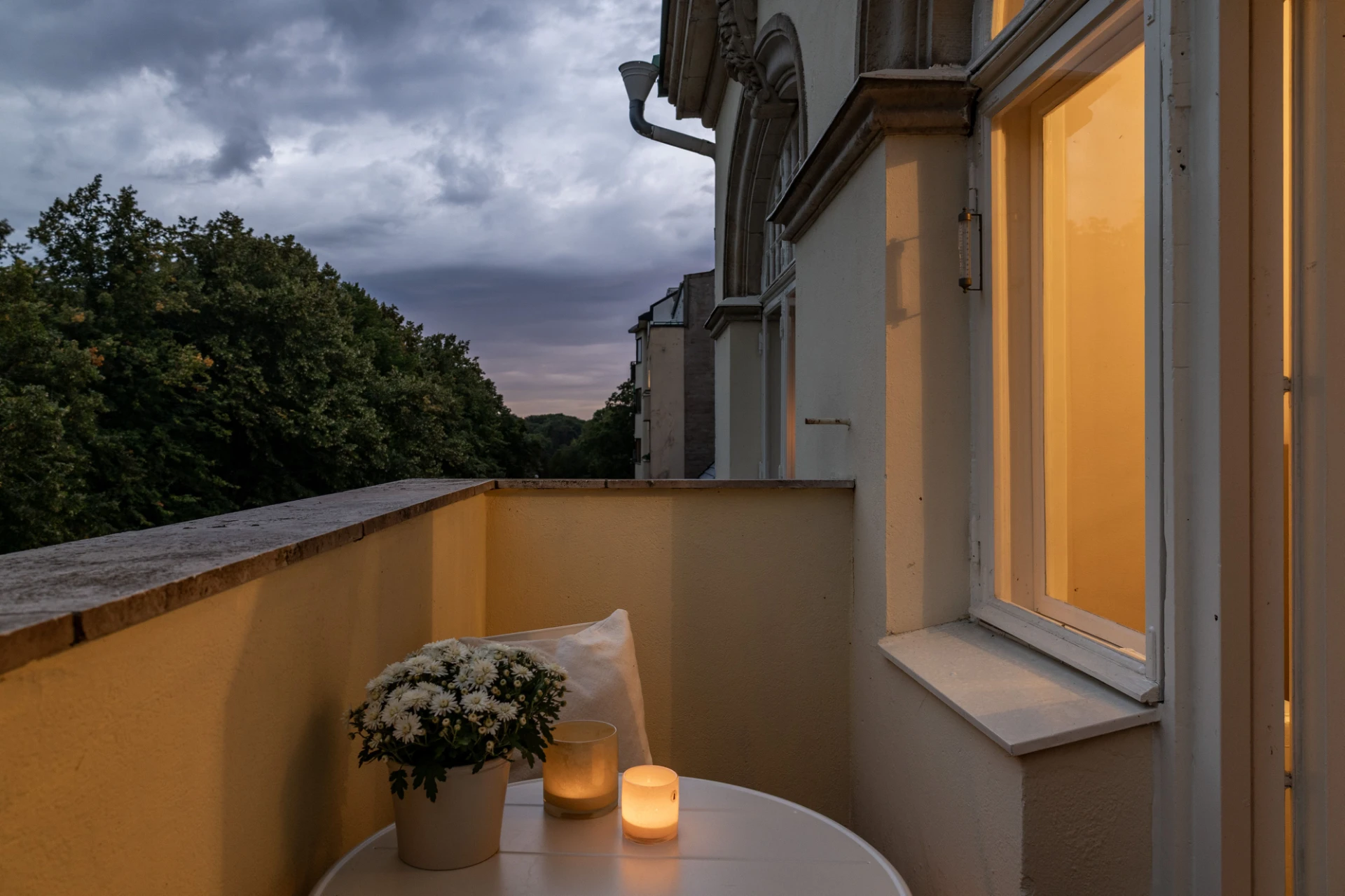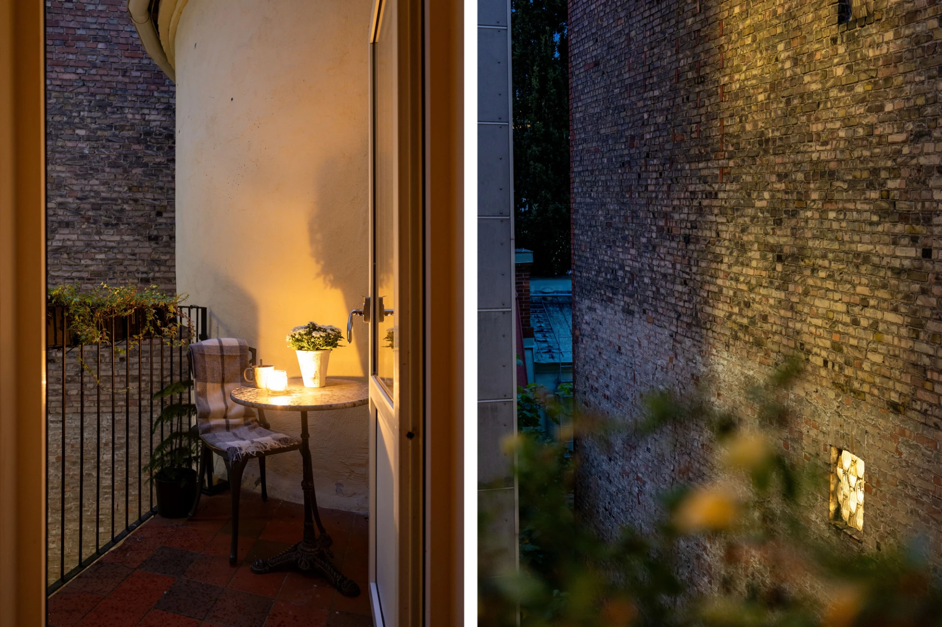 Fiskbensparkett och ljusa väggar. Takstuckatur. Dörrar med sirliga dörröverstycken mot salong och hall. Utgång till balkong i söderläge.