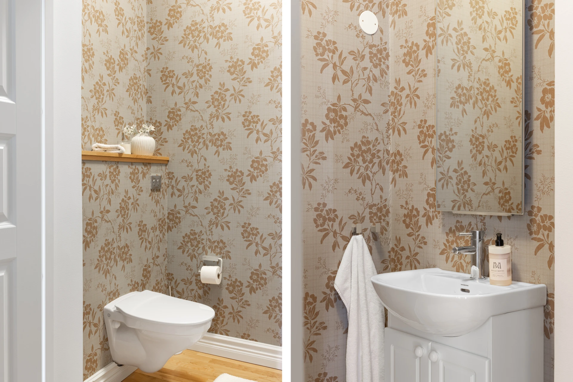 Parkettgolv och mönstrad tapet. Utrustad med vägghängd wc, handfat med vitt underskåp och spegel.