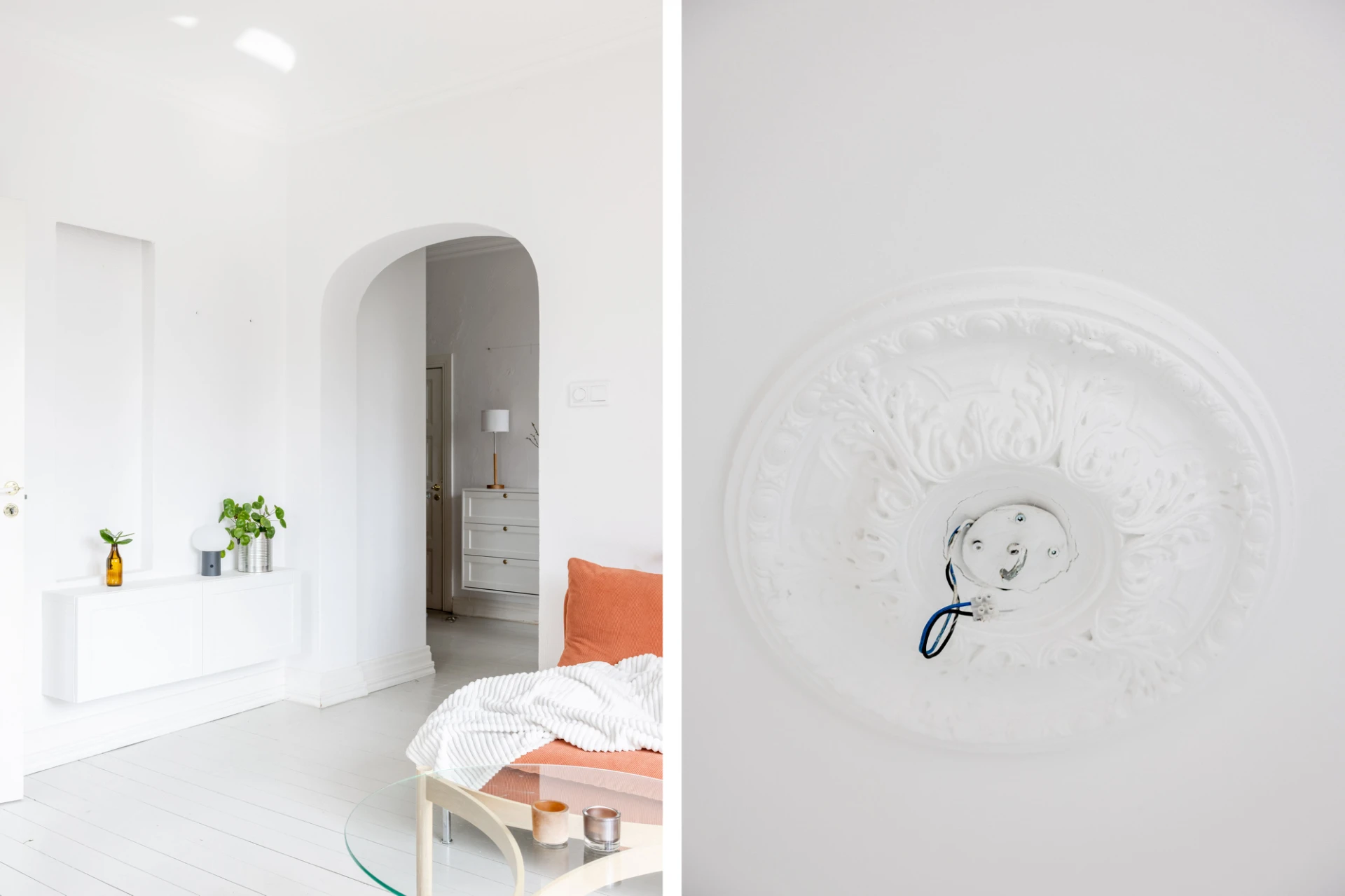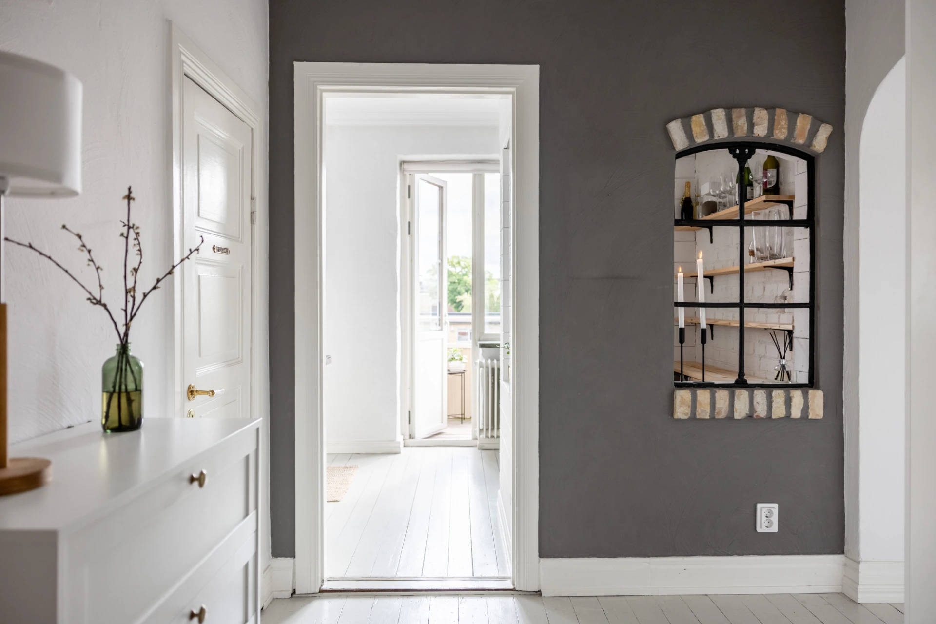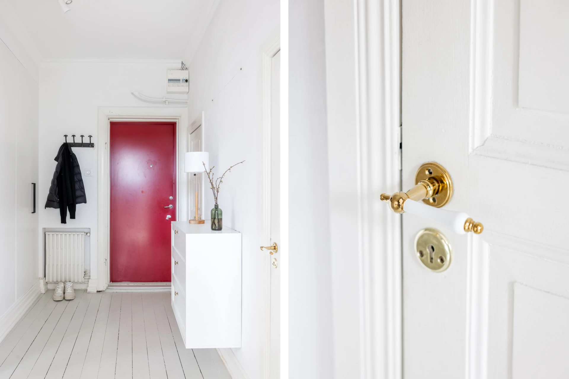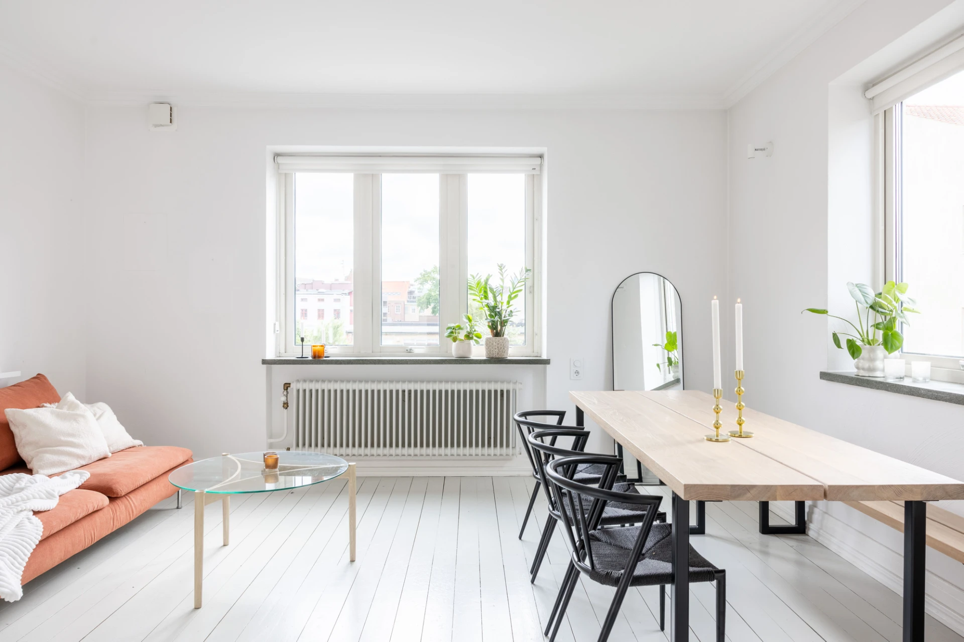 Välkommen till ett hem där ljuset och detaljerna samspelar för att skapa en harmonisk atmosfär. Det genomgående ljusa brädgolvet ger bostaden en enhetlig och stilren karaktär, medan klassiska inslag som höga fotlister, dekorativ stuckatur och eleganta dubbeldörrar sätter en tidlös prägel.