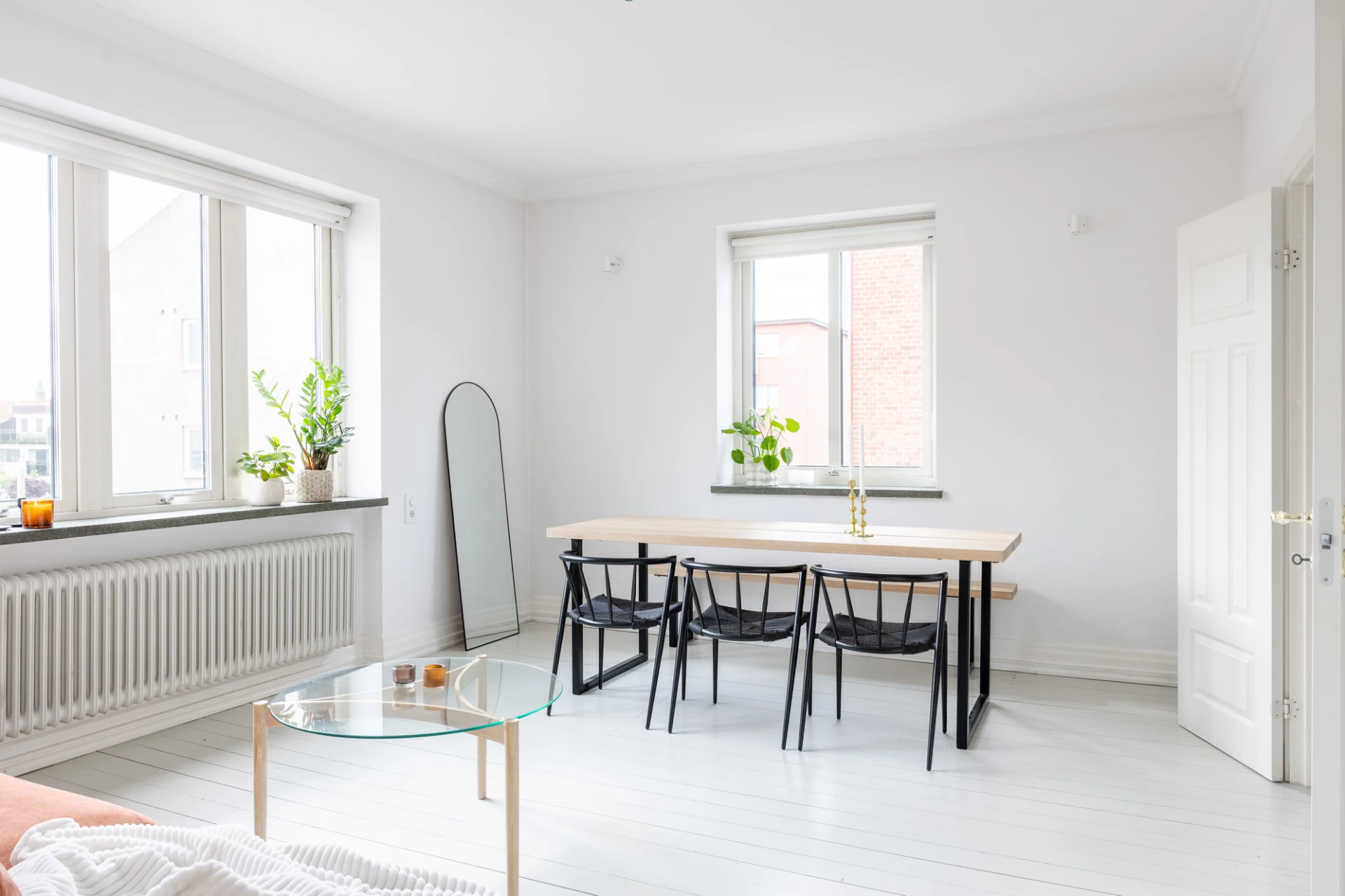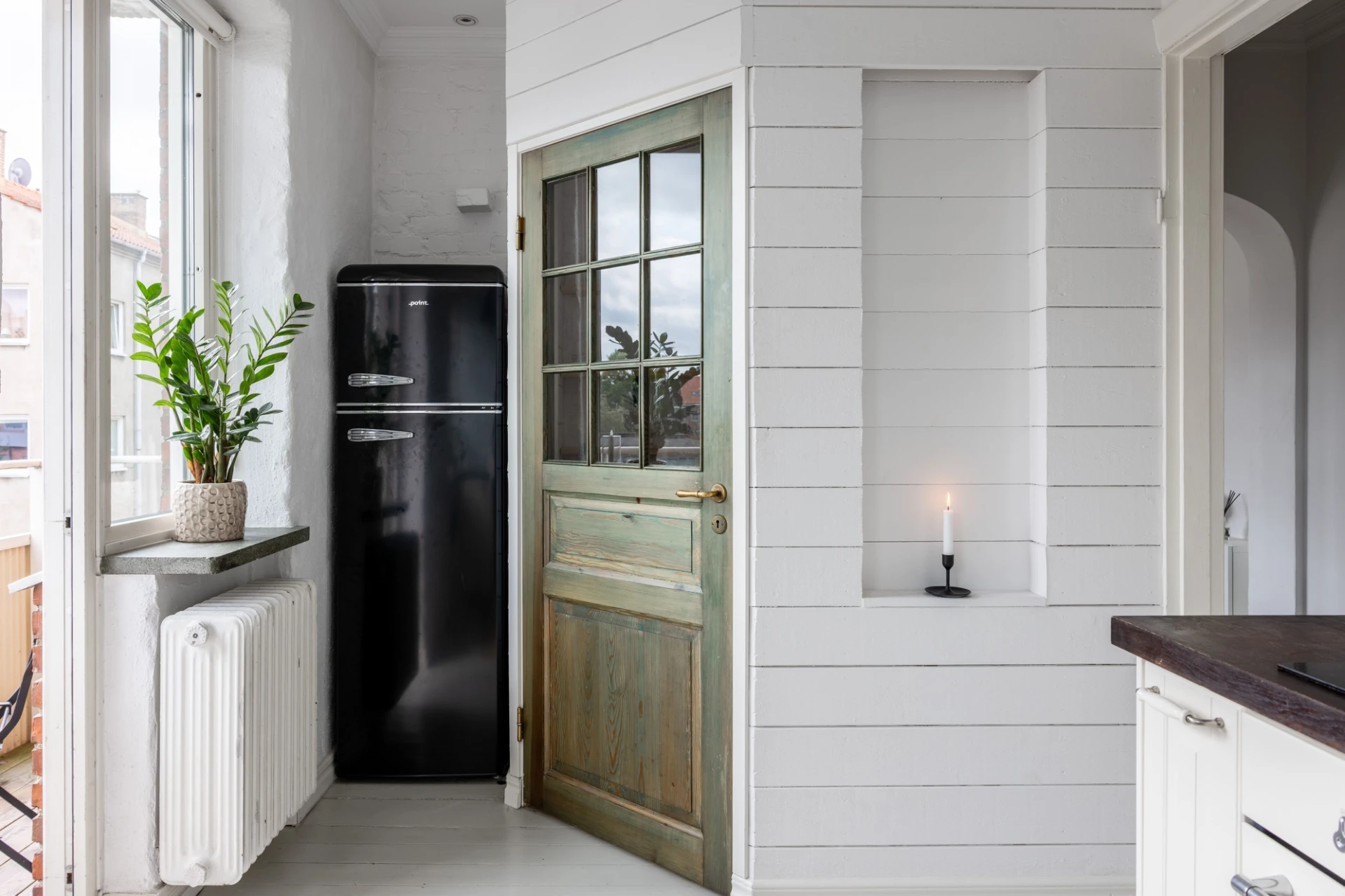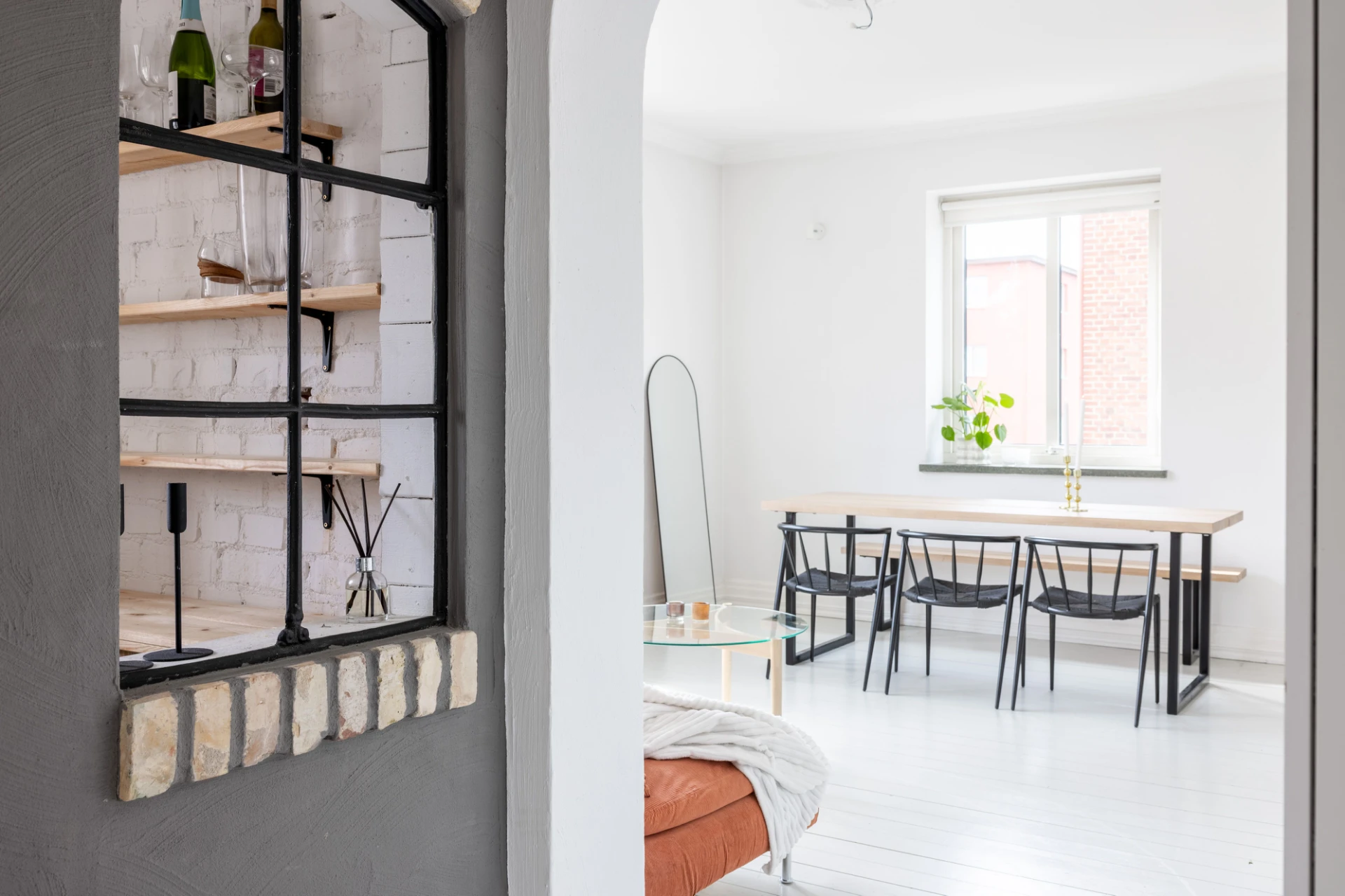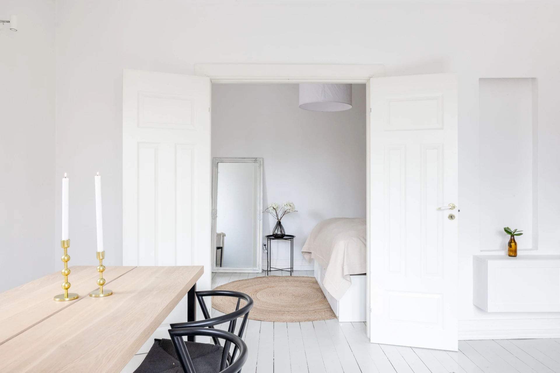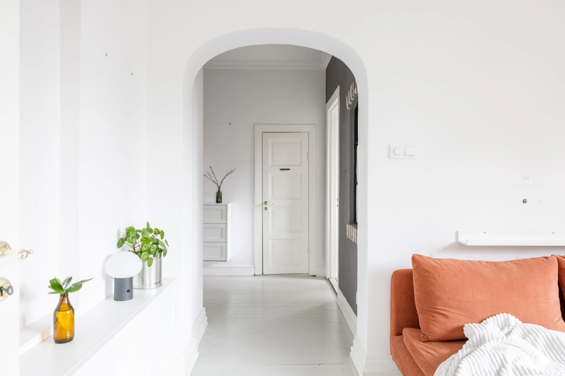 Välkommen till ett hem där ljuset och detaljerna samspelar för att skapa en harmonisk atmosfär. Det genomgående ljusa brädgolvet ger bostaden en enhetlig och stilren karaktär, medan klassiska inslag som höga fotlister, dekorativ stuckatur och eleganta dubbeldörrar sätter en tidlös prägel.