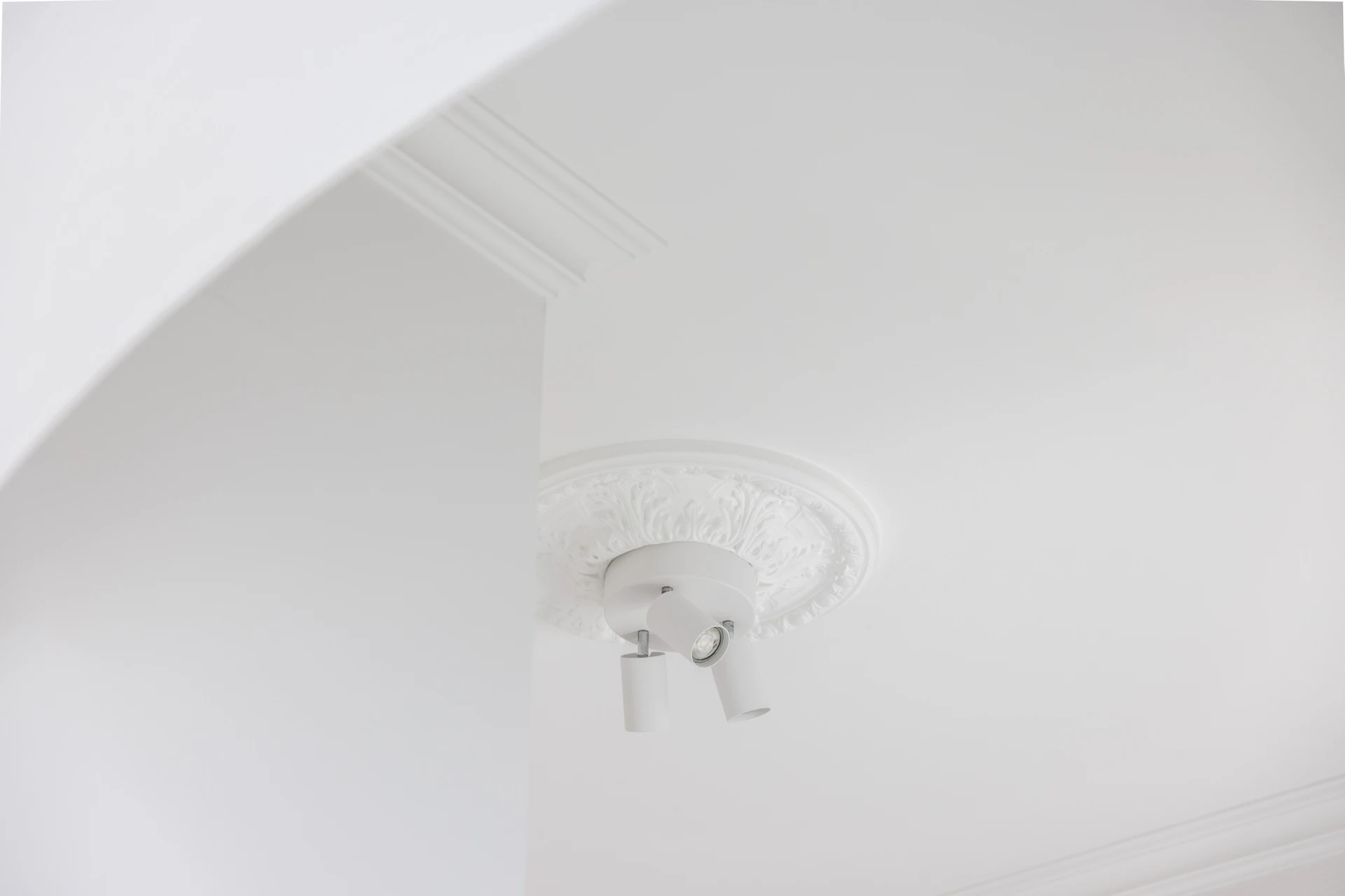 Brädgolv, vita väggar, stuckatur samt höga fotlister.