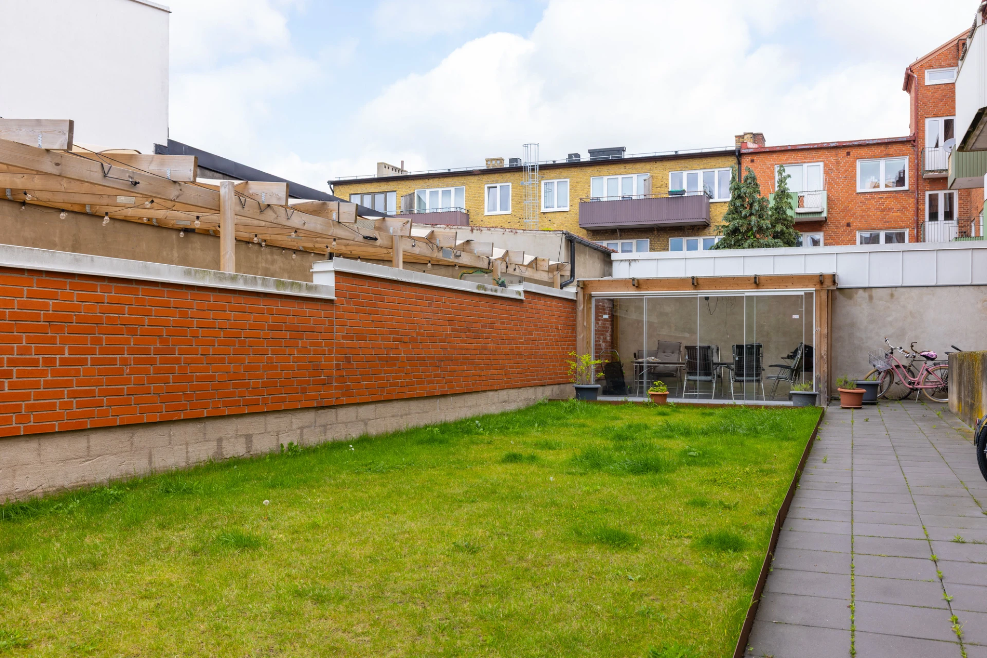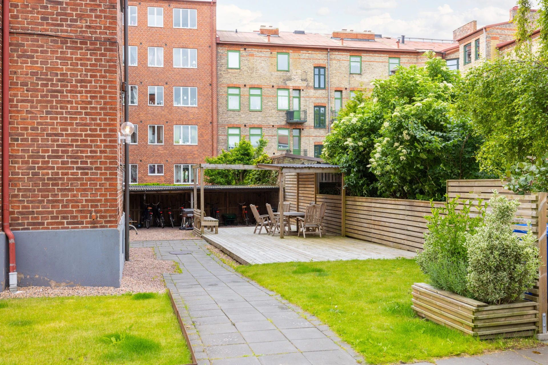 Föreningen har en fin innergård med gräsytor och ett inglasat uterum.