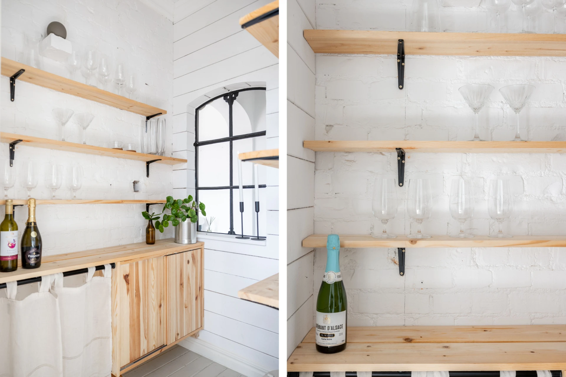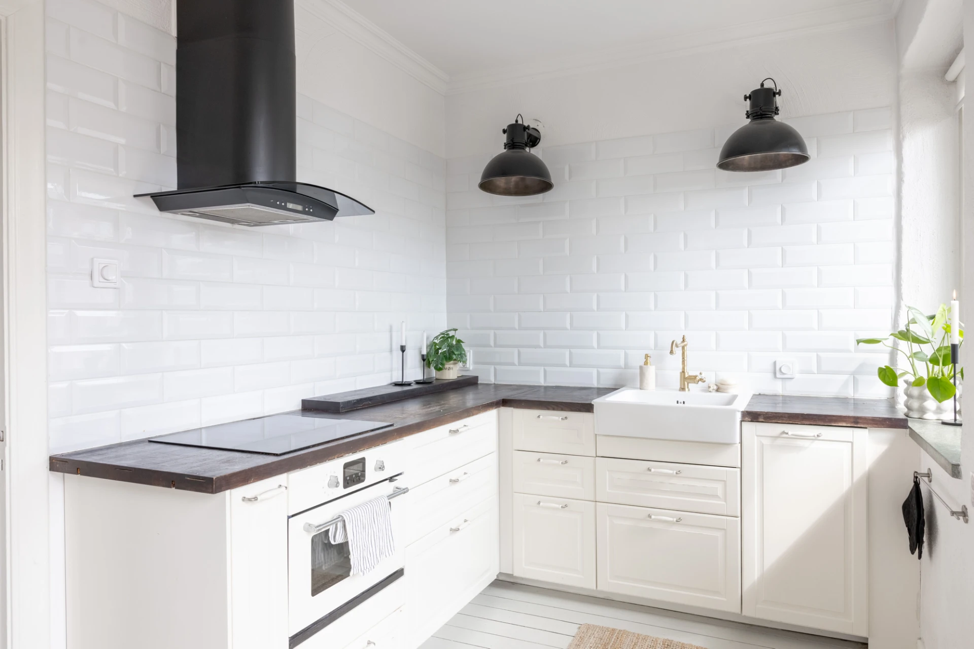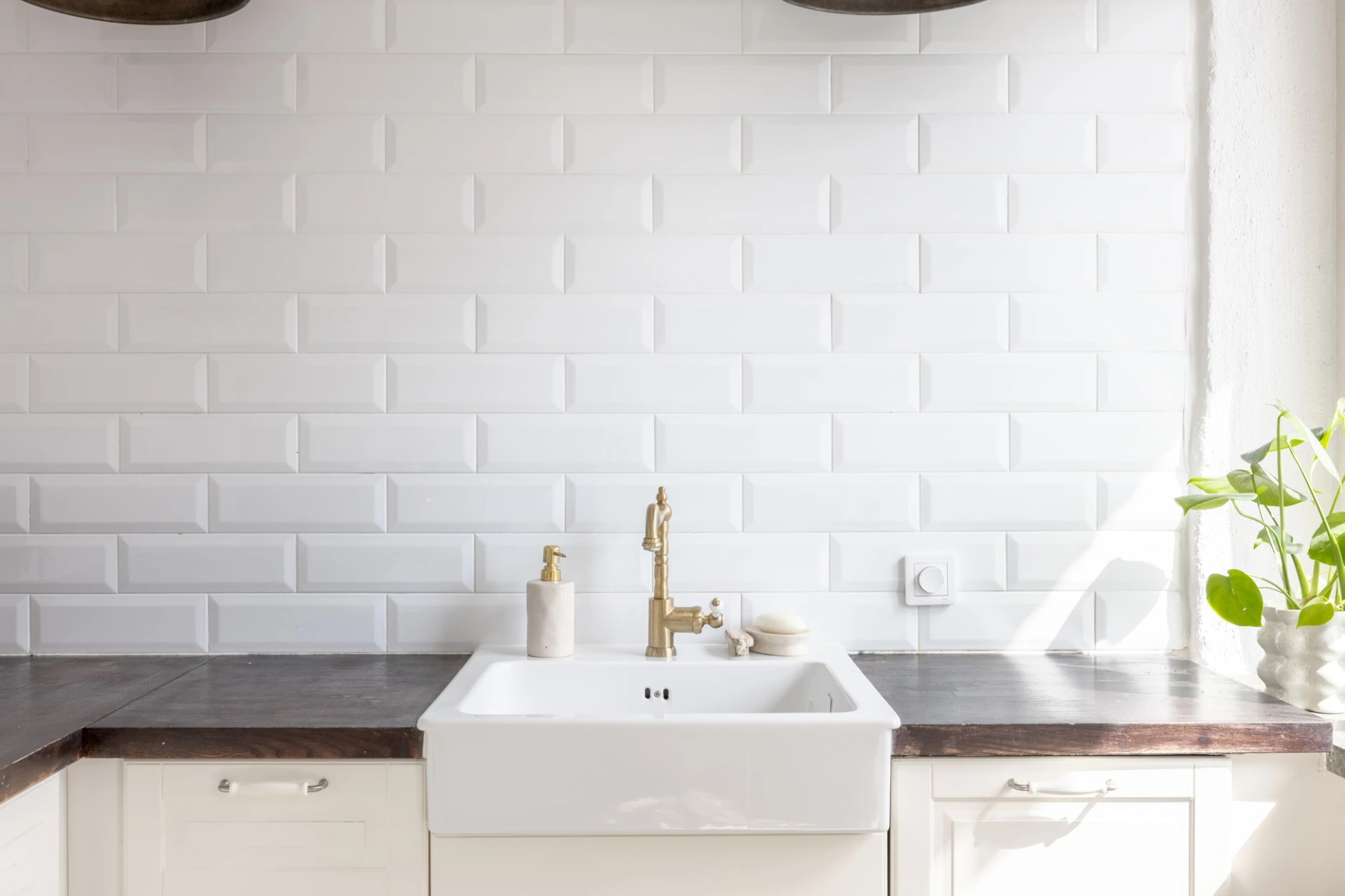 Brädgolv, vita väggar, tegelvägg, garderob, höga fotlister samt dubbeldörr.