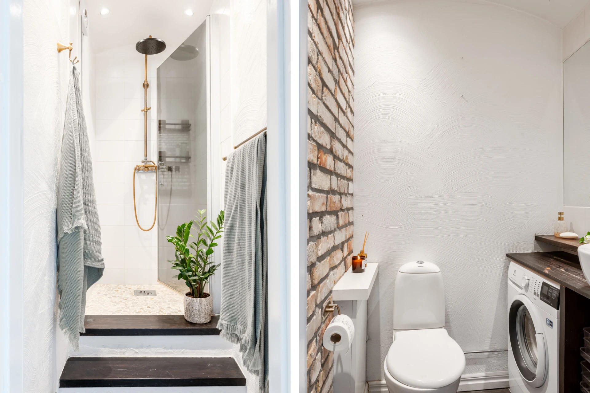 Klinkergolv, vita väggar, tegelvägg samt inbyggda spotts. Utrustat med WC, handfat, tvättmaskin samt spegel.