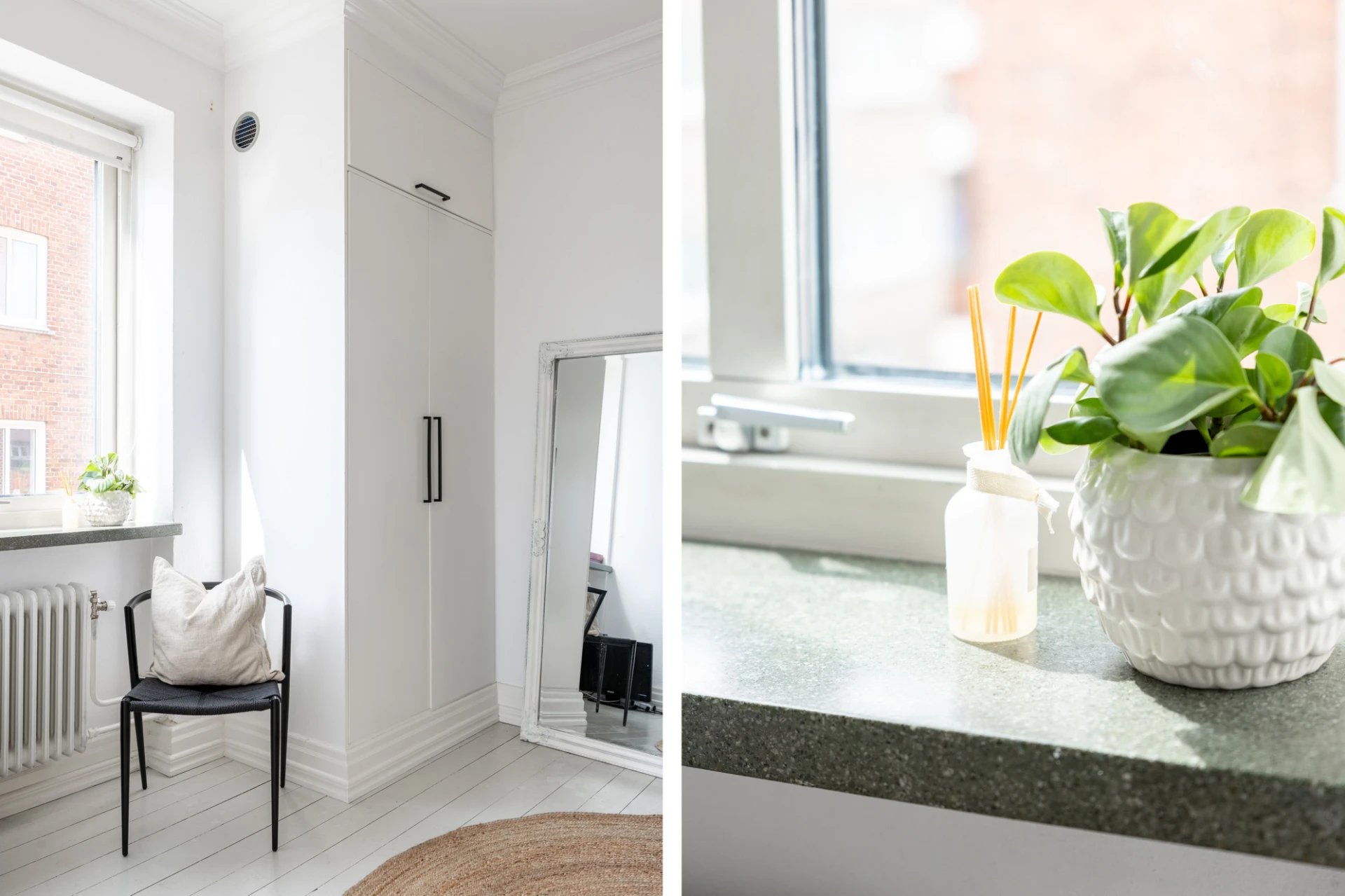 Brädgolv, vita väggar, stuckatur, höga fotlister samt goda förvaringsmöjligheter i garderober.