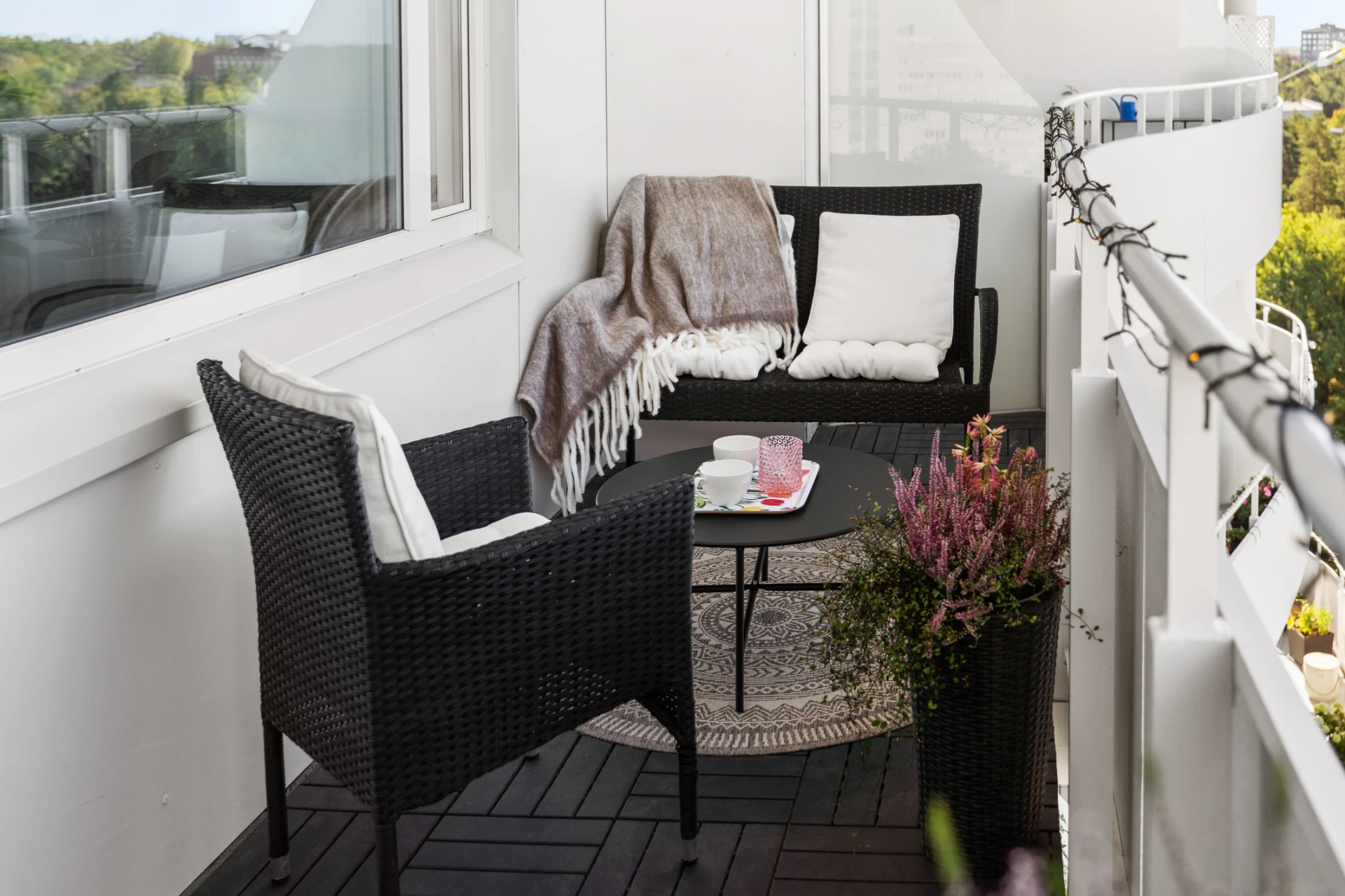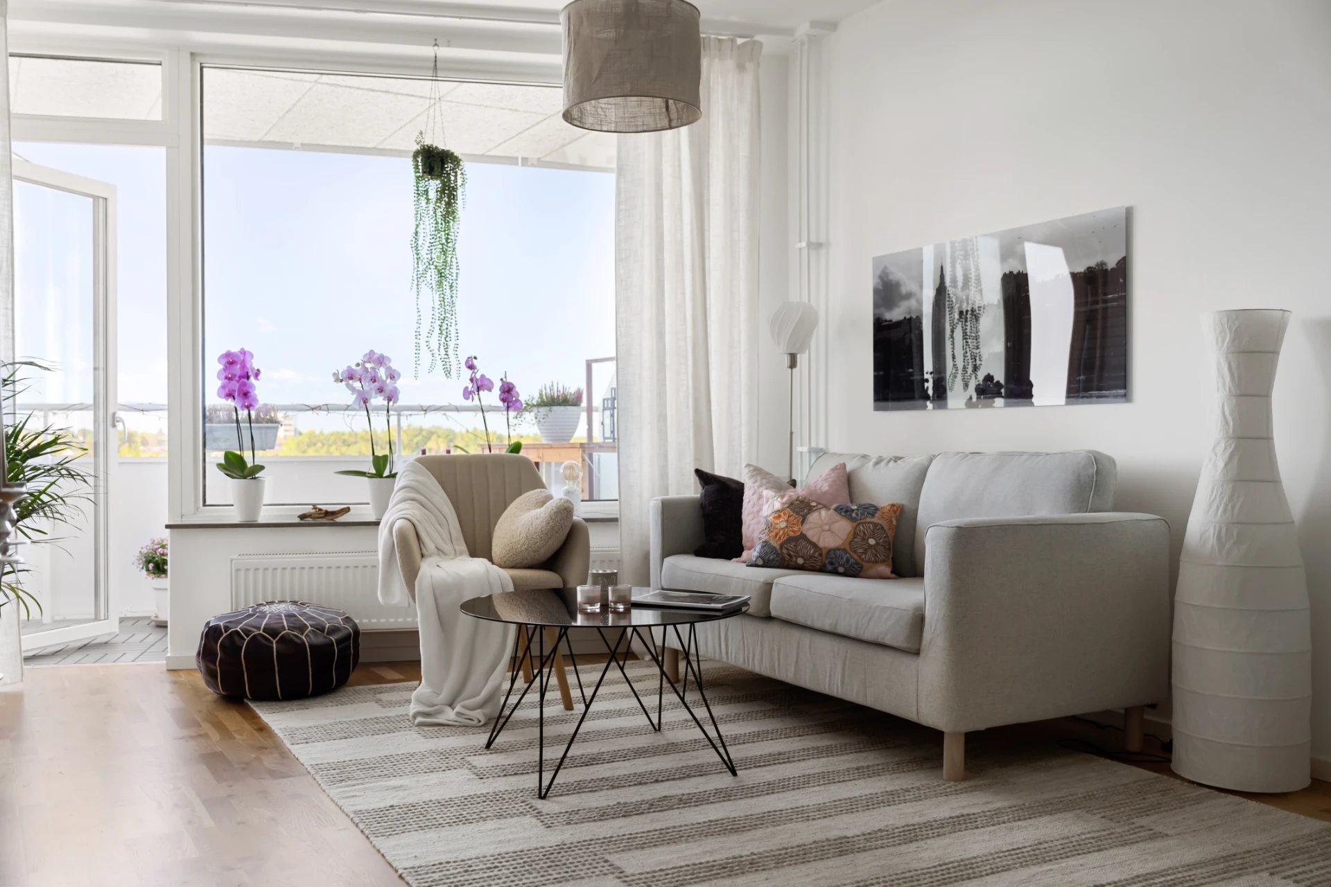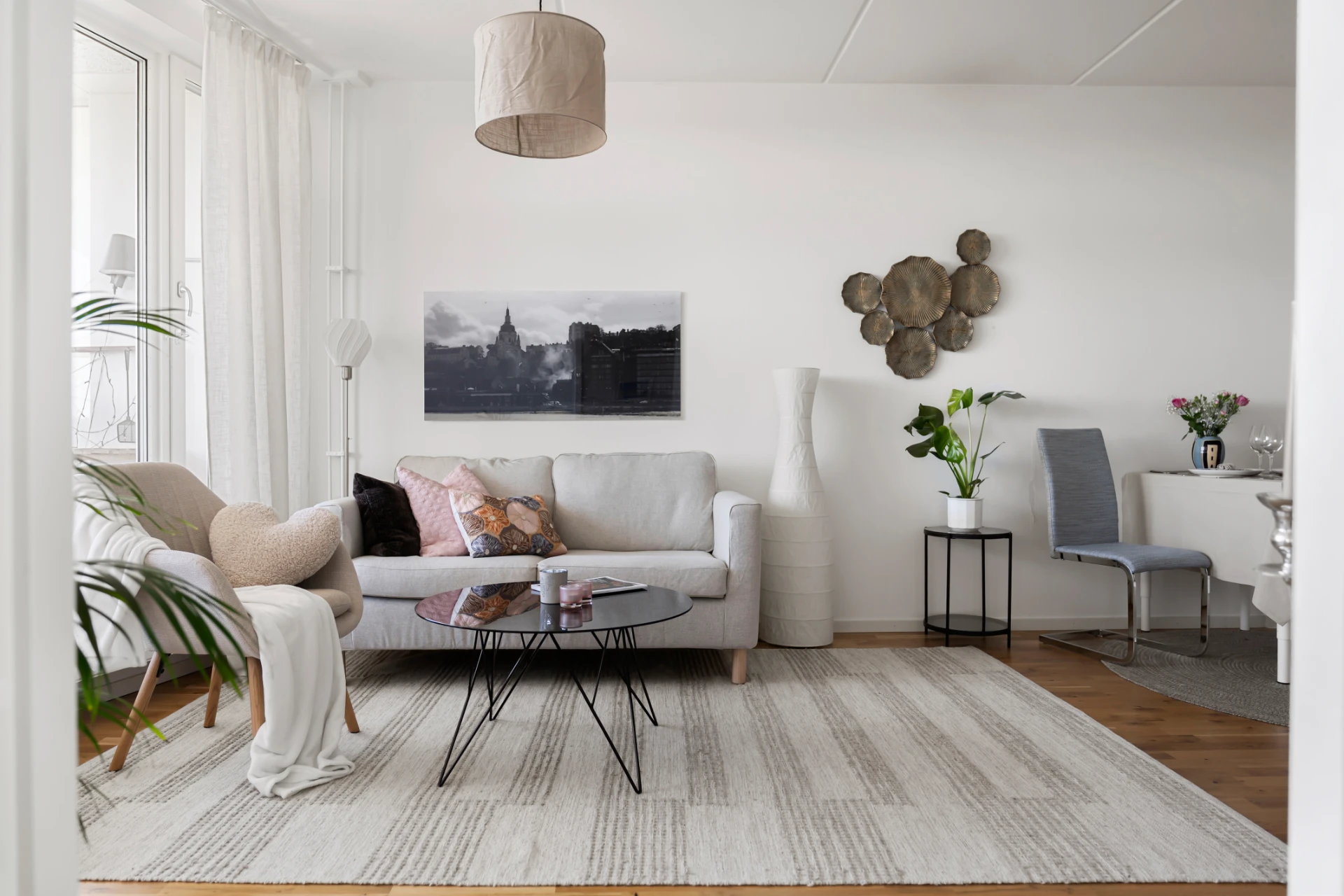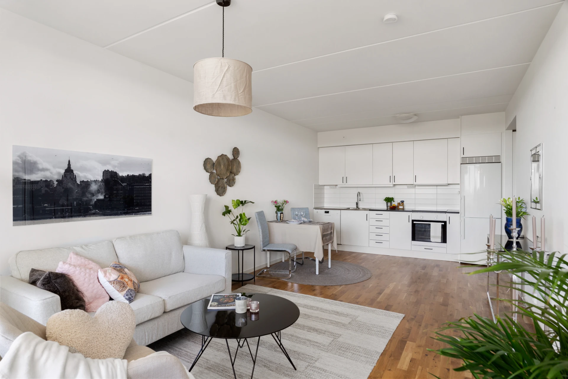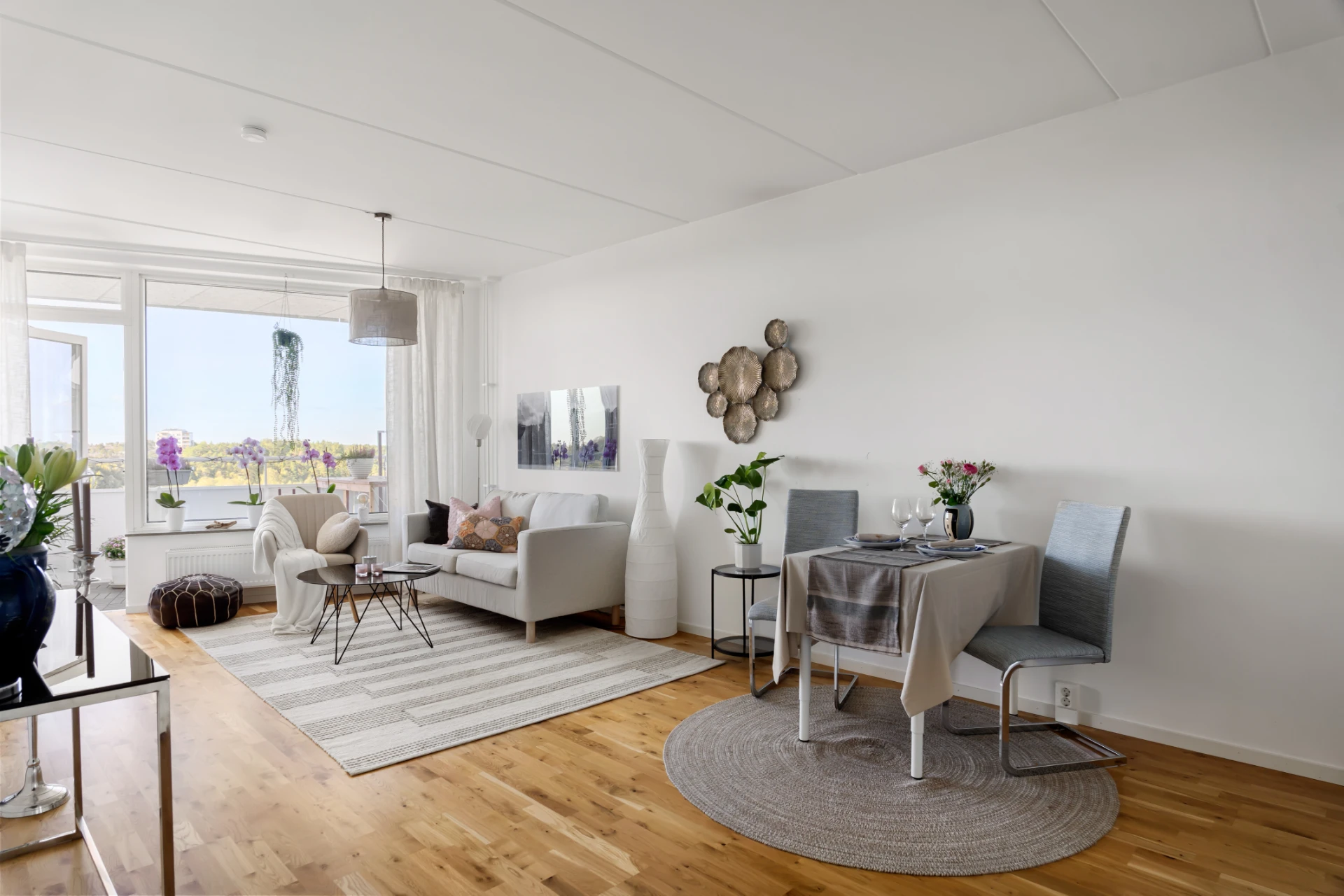 Luftigt och ljust vardagsrum med plats för soffgrupp och tillhörande mediamöblemang. Härifrån nås bostadens balkong som förlänger sällskapsytan ytterligare.