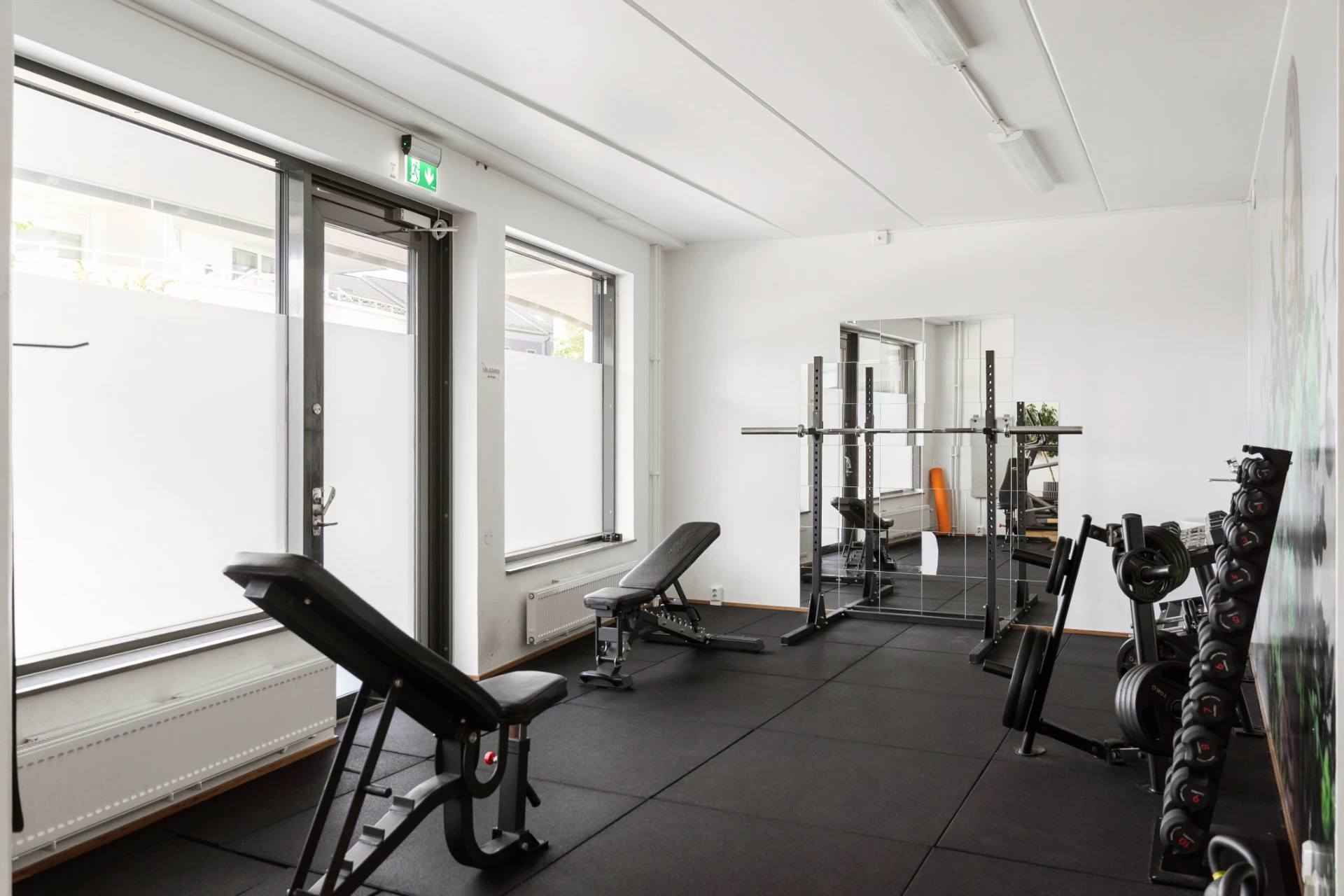 I entréplan i hus A finns ett fräscht gym. Här finns också en lokal med övernattningsrum att hyra för 600 kr/natt samt mötes-/kalasrum som kan hyras av övernattande gäster eller om man inte får plats med födelsedagsfesten i sin egen lägenhet! På taket till hus B finns en härlig takterrass där du kan umgås med familj och vänner. På gården mellan husen skapas ett grönt torg med plats för både lek och avkoppling. I huset finns även Nordic Wellnes där man som medlem f.n. får 20% rabatt.