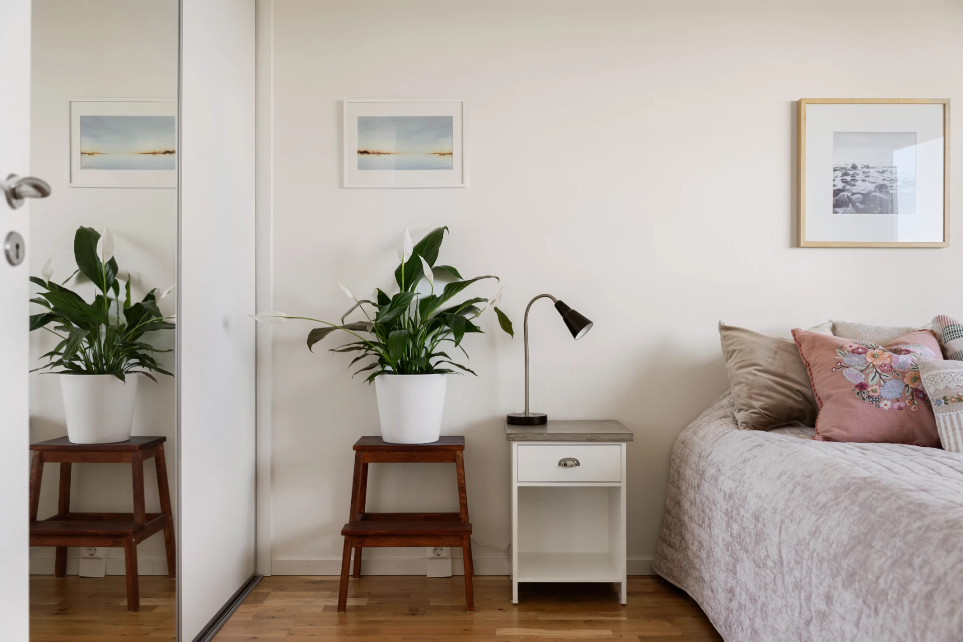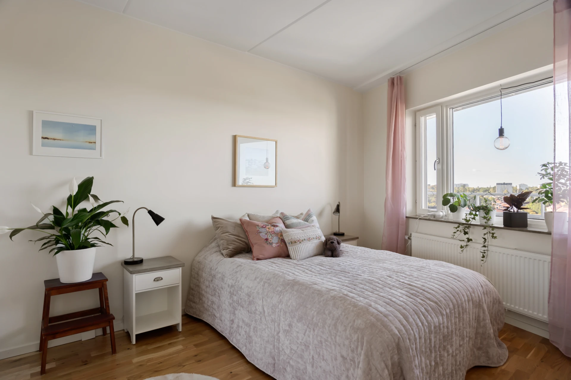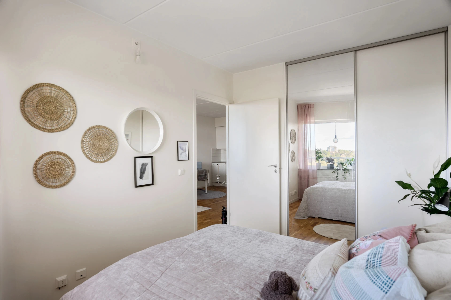 Rogivande sovrum med plats för dubbelsäng, nattduksbord och övrigt önskat möblemang. Förvaring i garderober med skjutdörrar.