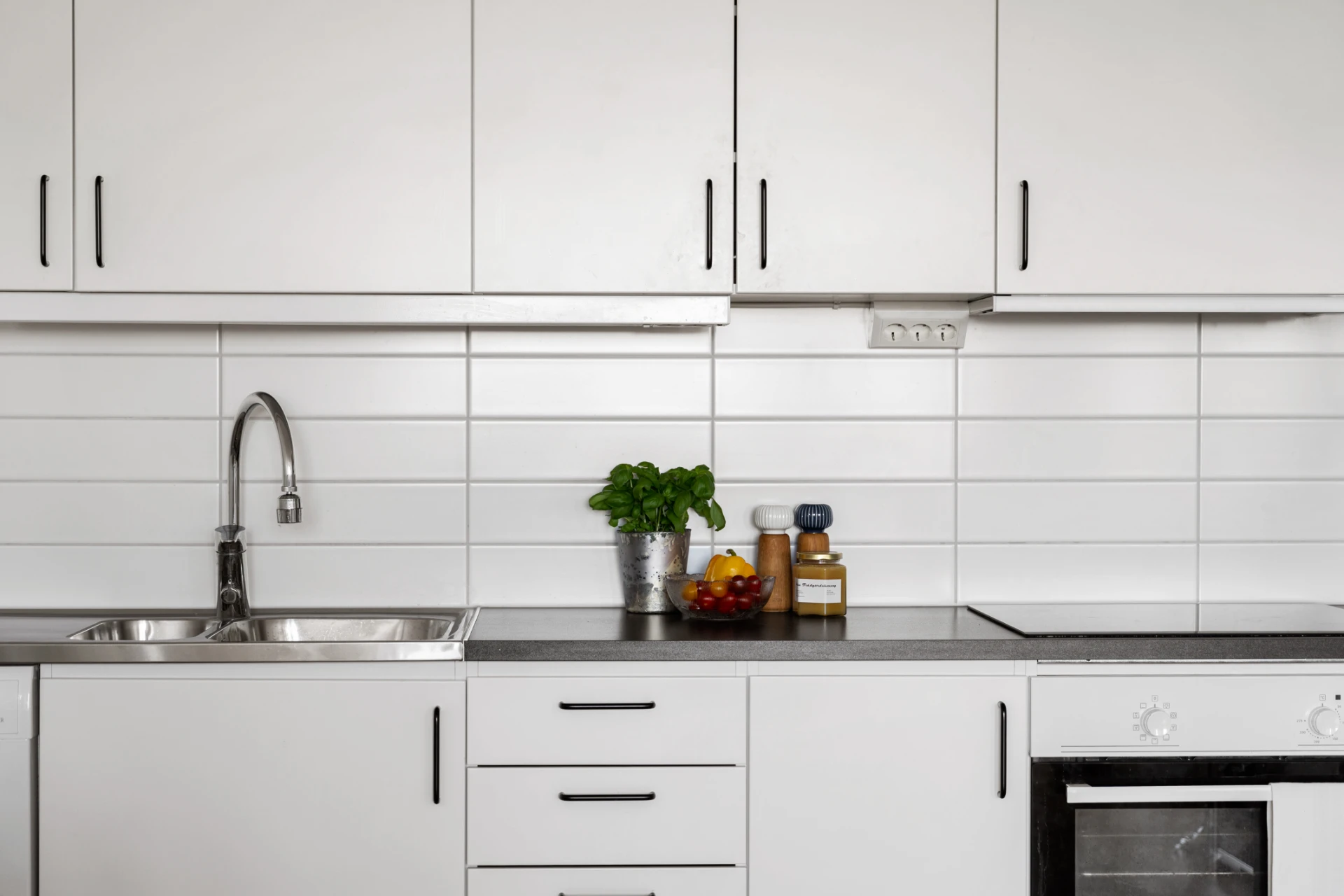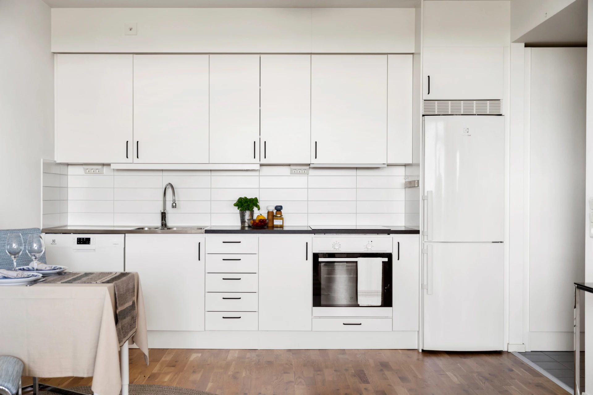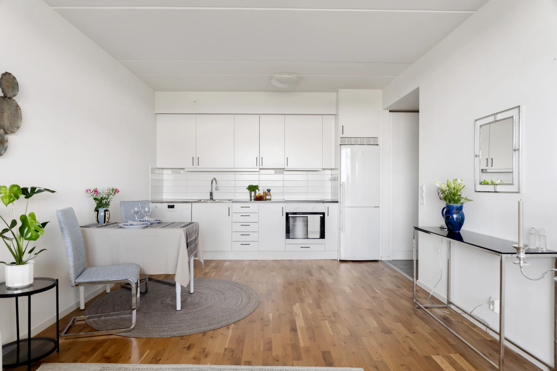 Kök från Vedum med ljusa skåpsluckor och ljust kakel ovanför arbetsytorna. Kökets maskinella utrustning består av induktionshäll, fläkt, ugn, diskmaskin samt kyl/frys. Plats för matbord för sällskap om ca 4 personer i direkt anslutning.