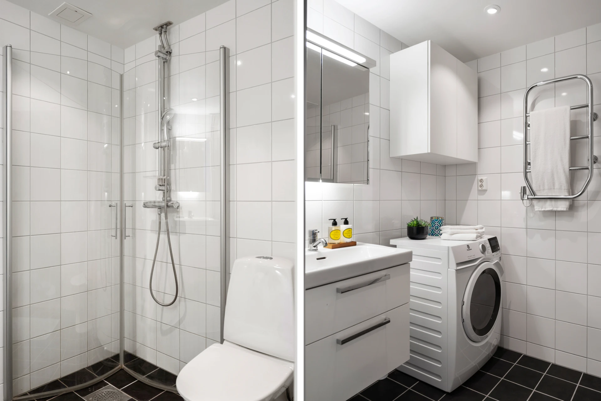 Helkaklat badrum inrett med wc, tvättställ med kommod, belyst spegelskåp, dusch samt kombinerad tvättmaskin/torktumlare. Golvvärme.