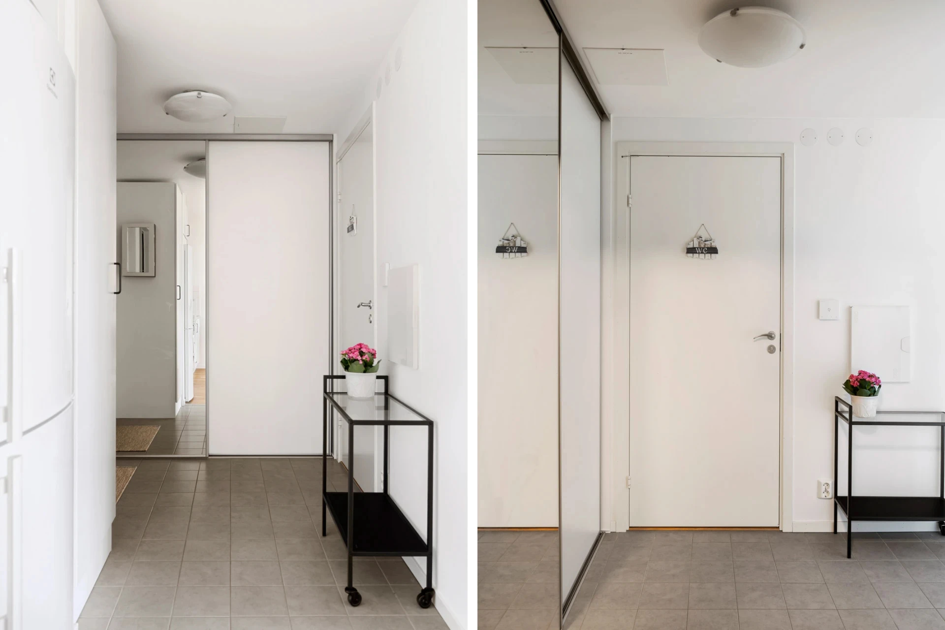 Välkomnande entré med plats för hallmöblemang. Förvaring i garderober med skjutdörrar.