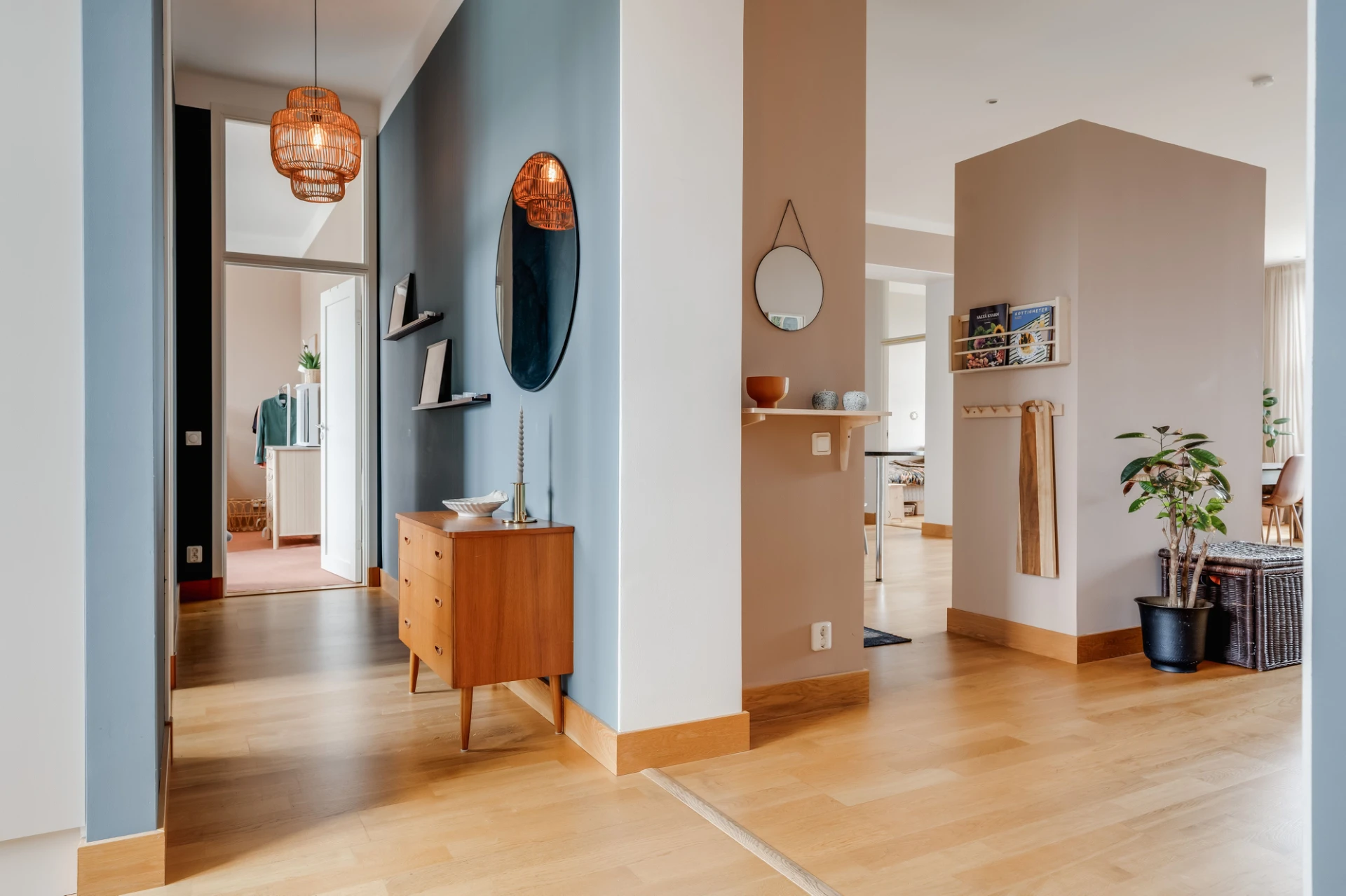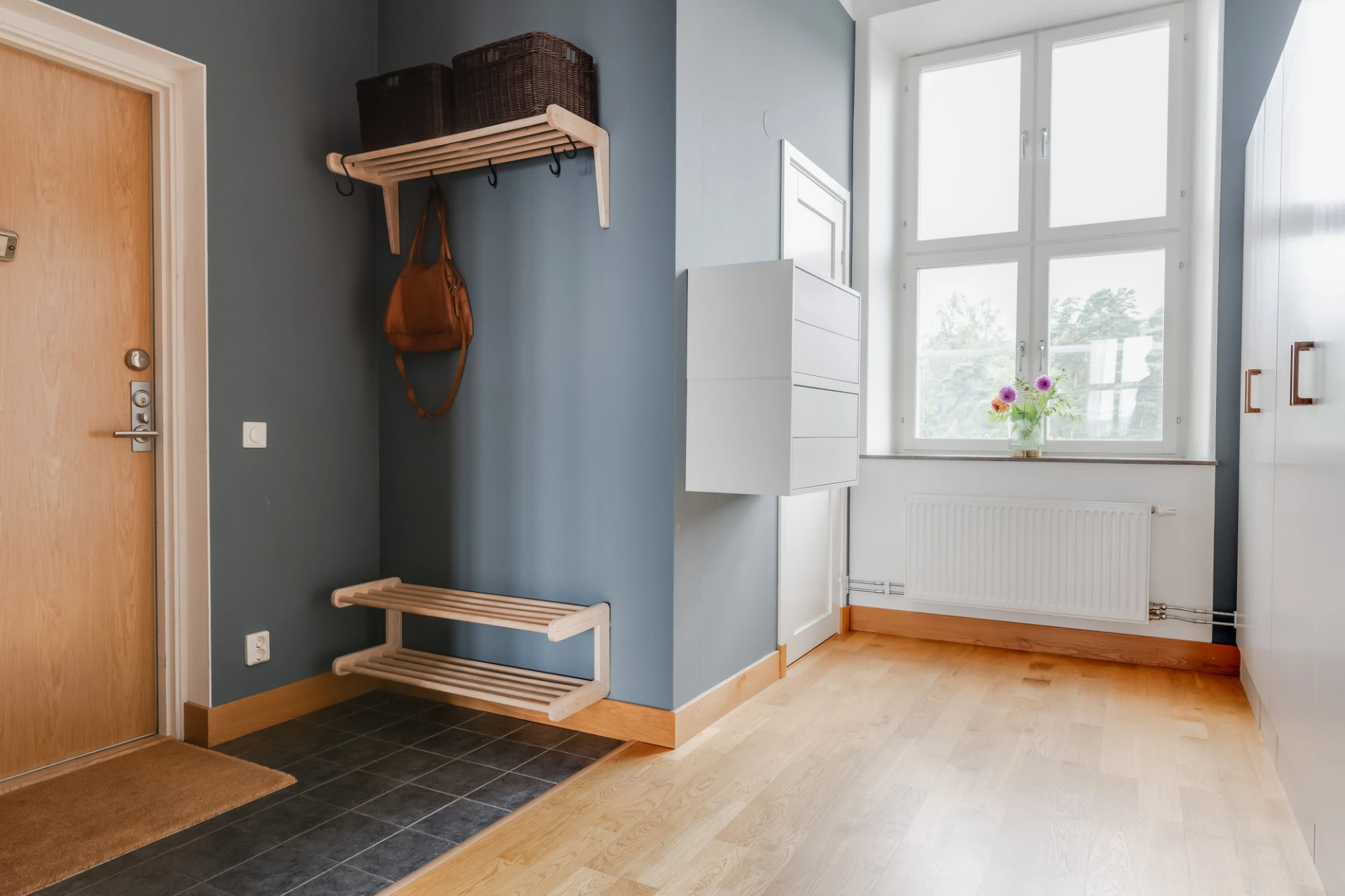 Precis innanför entrédörren ligger ett antracitgrått klinkergolv som övergår i en fin ekparkett med matchande golvlister och väggarna är målade en fin blå kulör.
