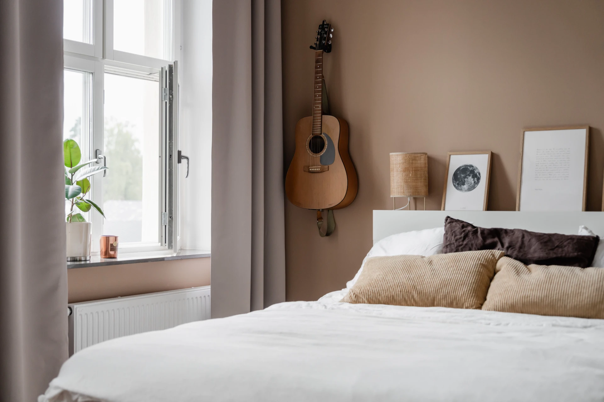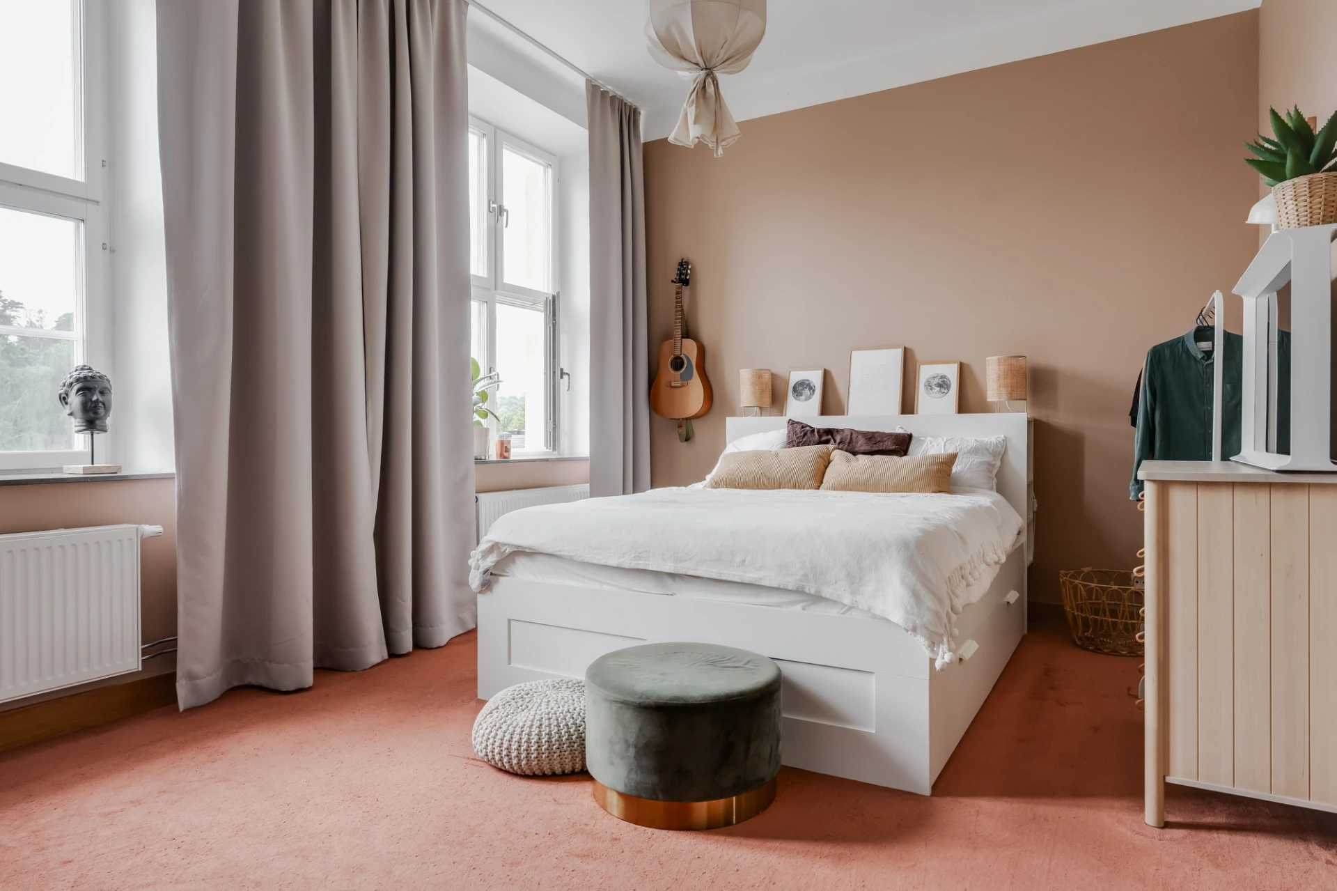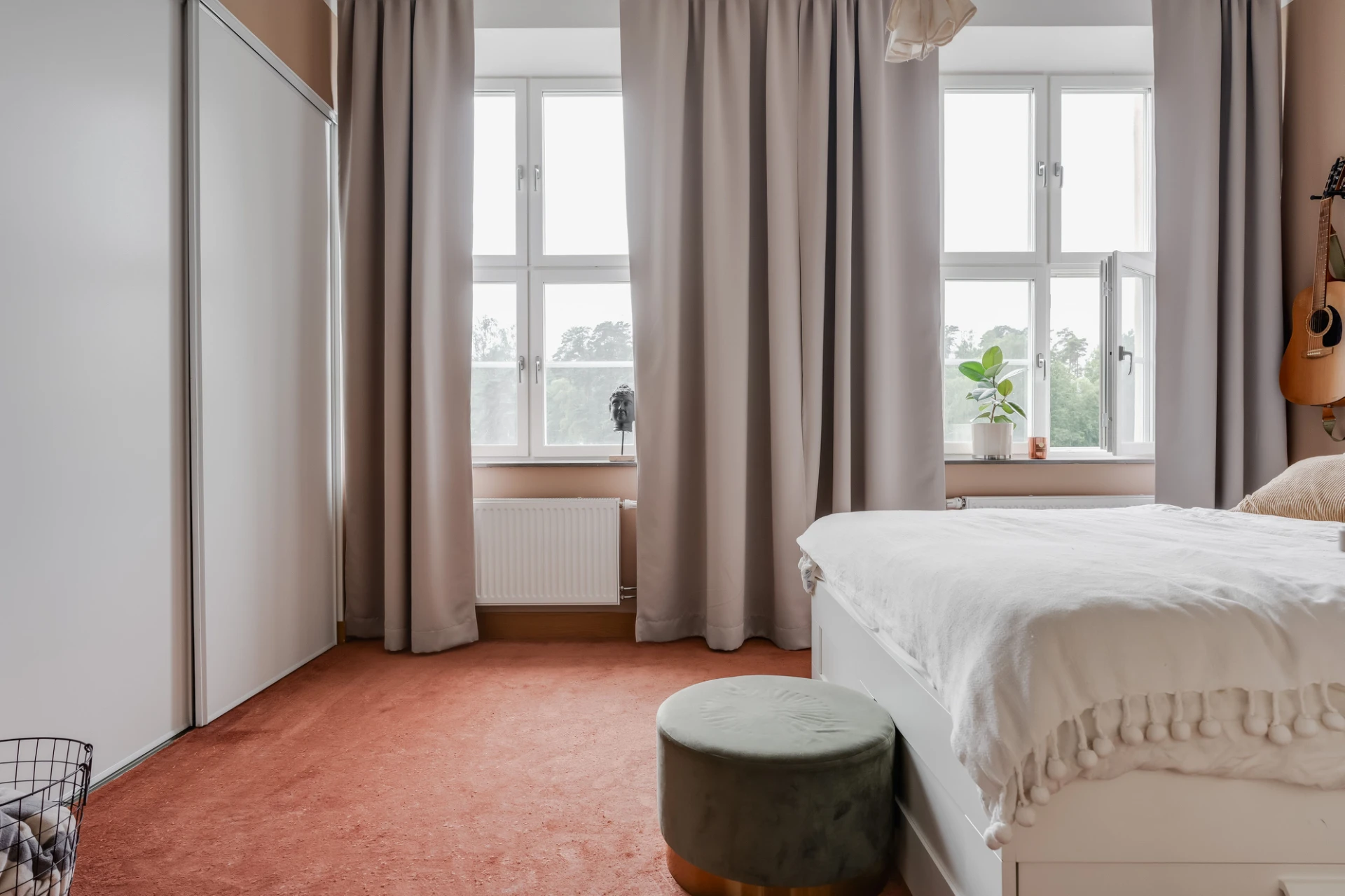 I bostadens master bedroom ryms dubbelsäng med tillhörande möblemang. Här finns garderober till förvaring. Härlig heltäckningsmatta som matchas ihop med de fina målade väggarna. En extra fin inredningsdetalj är det vackra kupolfönstret som ger en sekelskifteskänsla och som på ett fint sätt får dagsljuset att flöda in i rummet. Ingång till det stora badrummet.