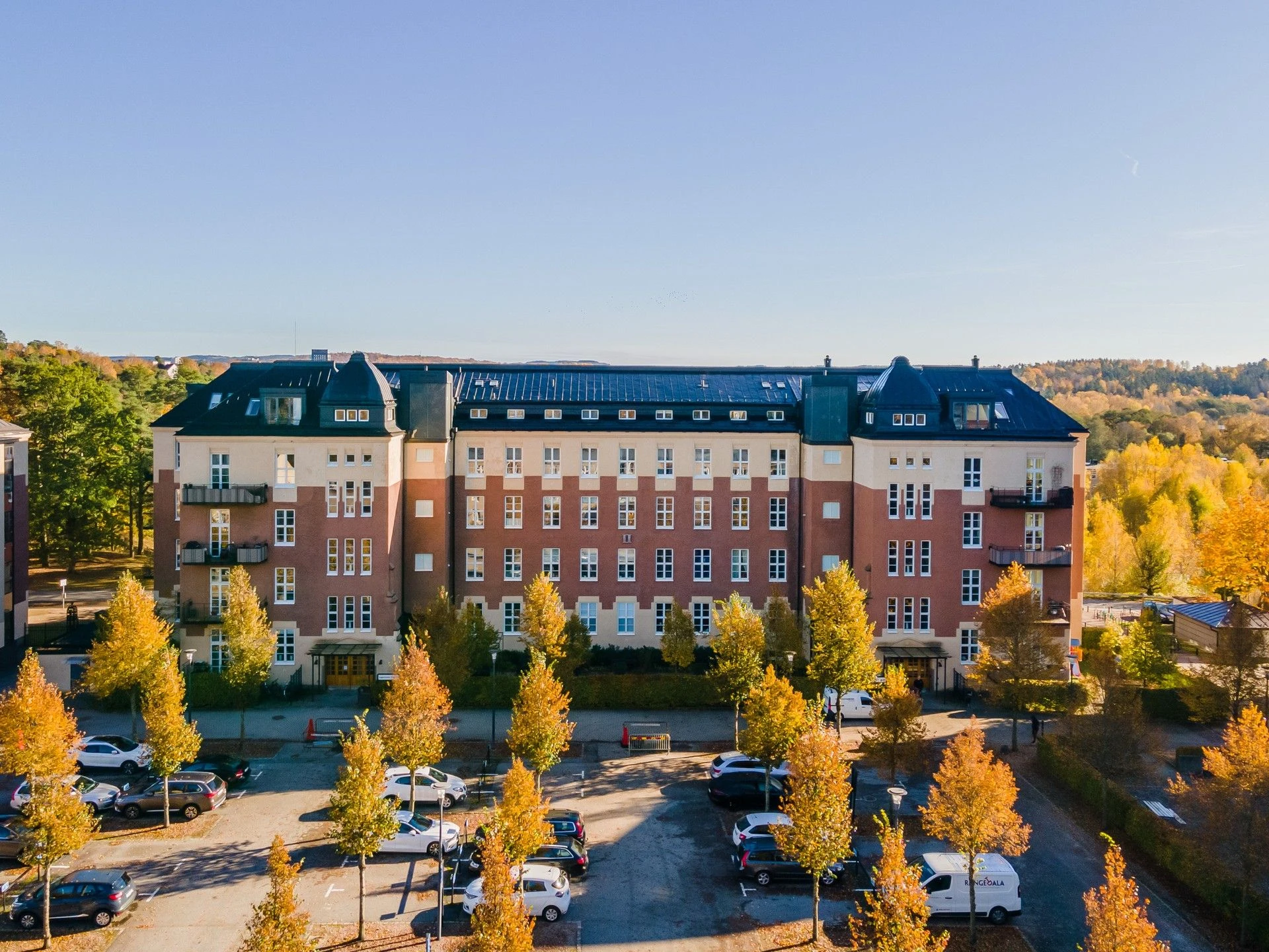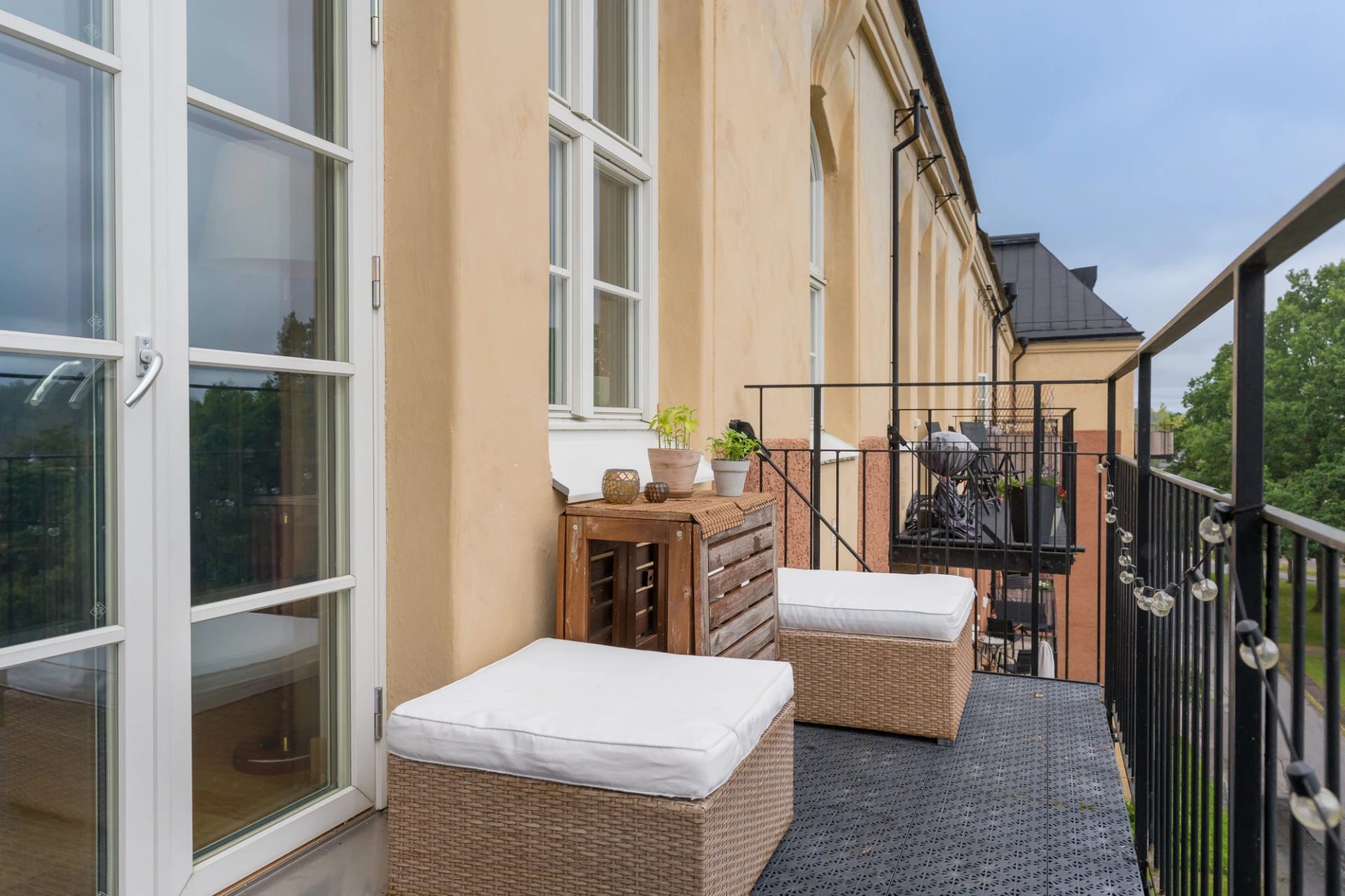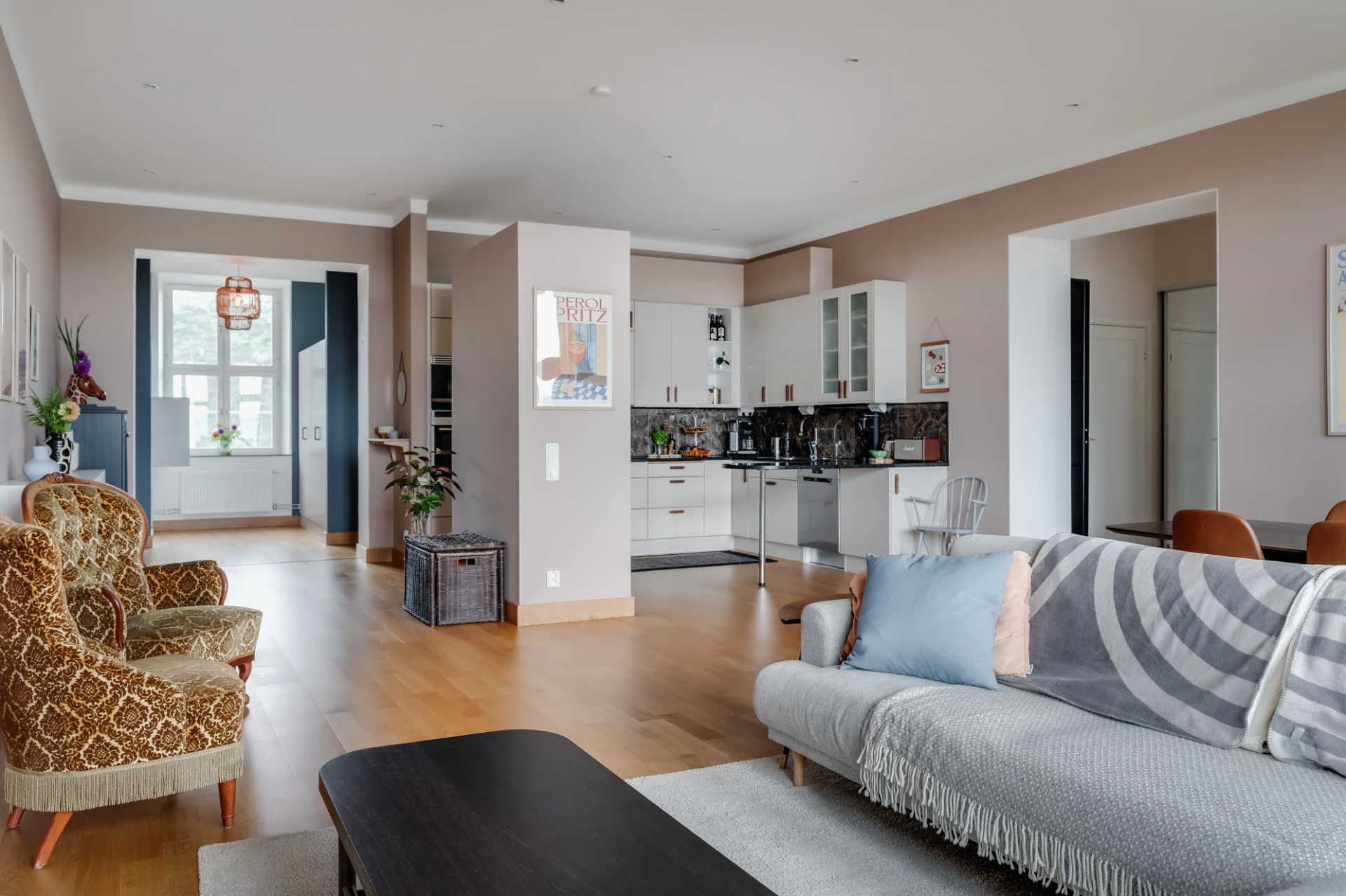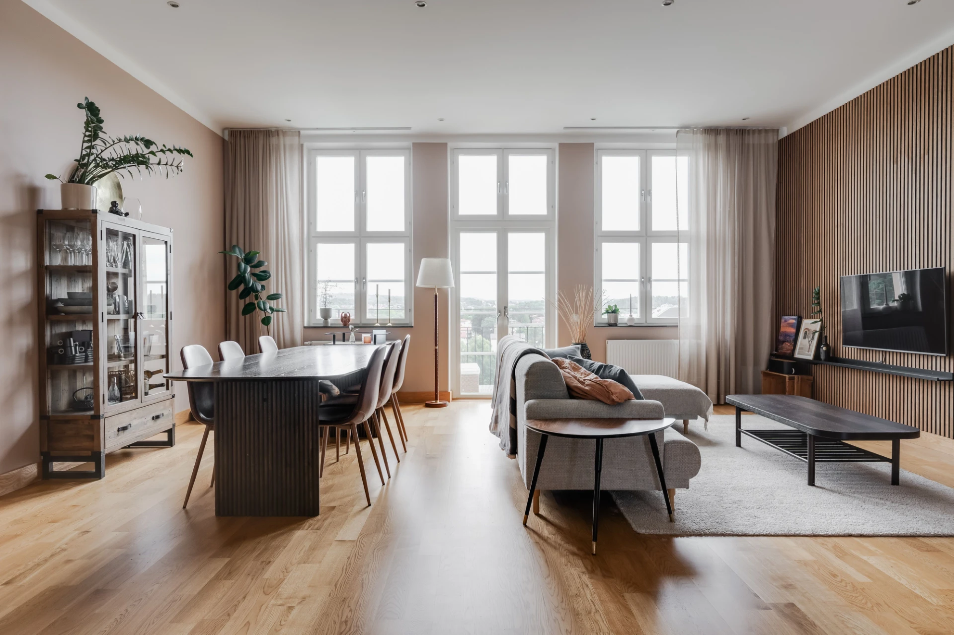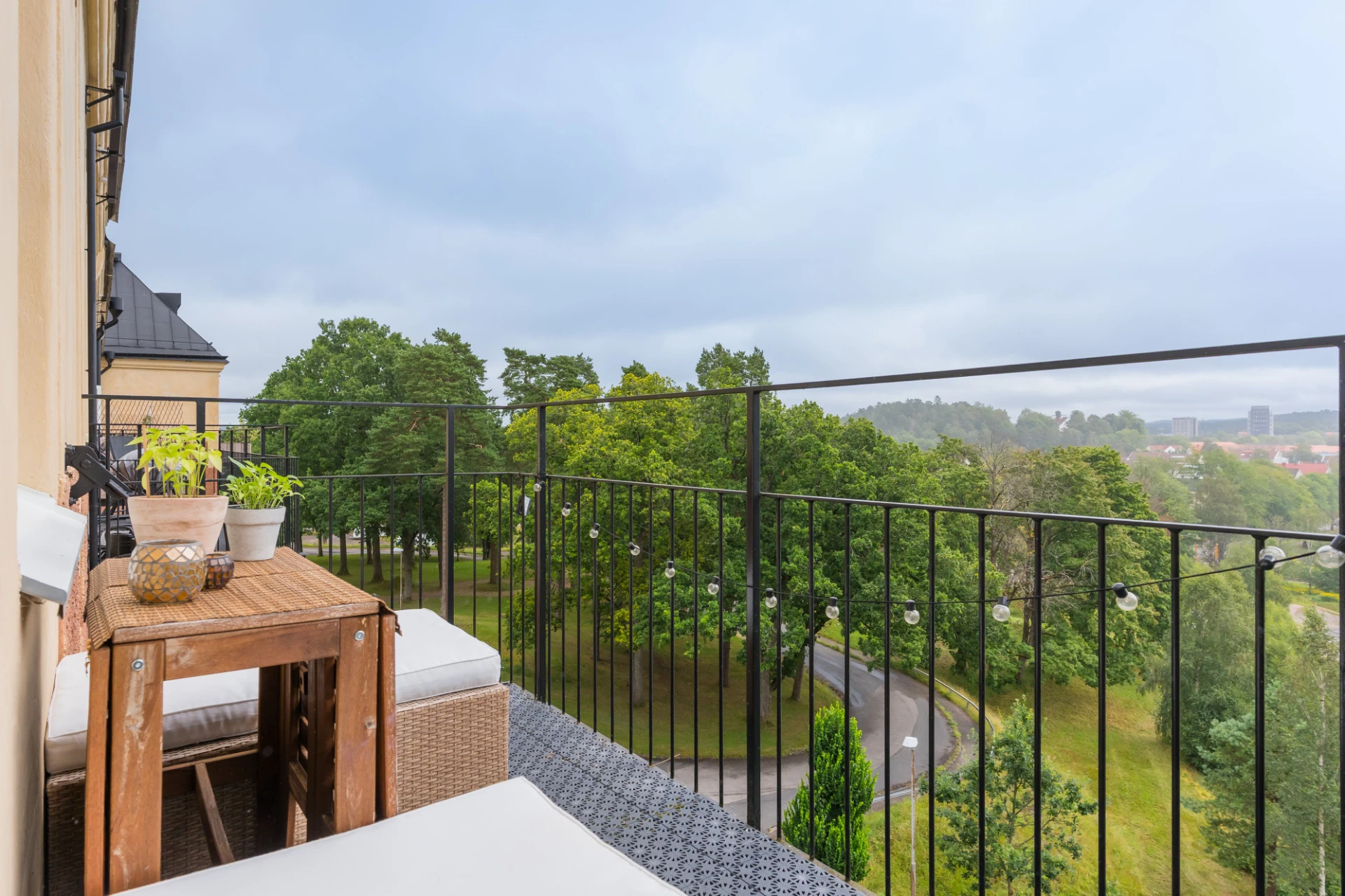 Vidare in i bostaden möts man av det stora, luftiga vardagsrummet på ca 70 kvm som är integrerat med köket.Här har du möjlighet att duka upp till långbord vid högtider och middagsbjudningar för nära och kära. Dessutom ryms en stor soffgrupp. Målade väggar med en snygg akustikpanel vid tv-delen. På golvet ligger det ett parkettgolv. I taket sitter det spotlights. Här når du bostadens balkong som är rymlig med plats för bord, stolar och grill. Tack vare de stora fönsterpartierna flödar dagsljuset fritt. Från vardagsrummet har man utgång till den mysiga balkongen med milsvid utsikt över trädtopparna och Göta. Ta med frukostbrickan ut och njut av morgon- och förmiddagssolen.