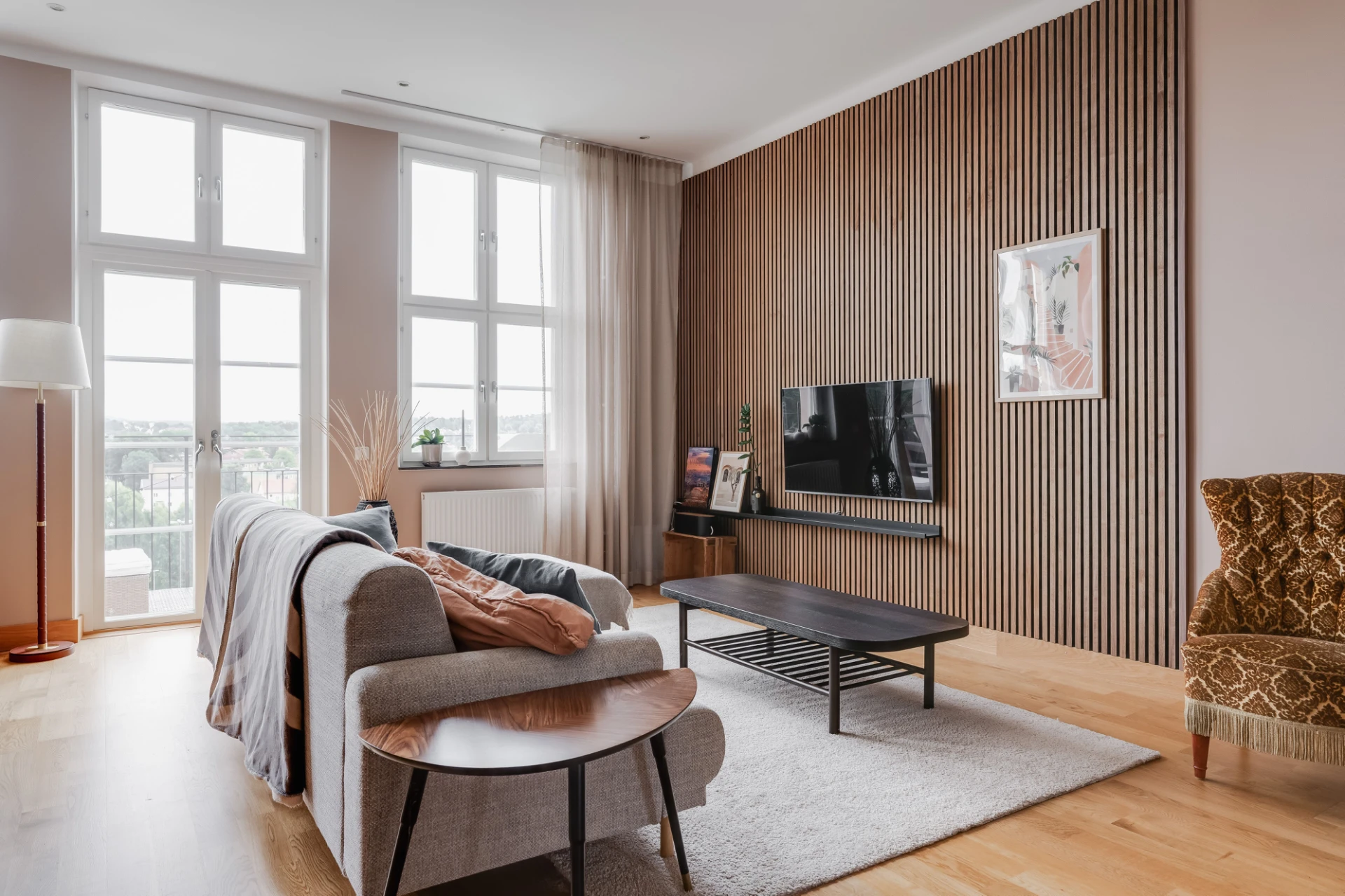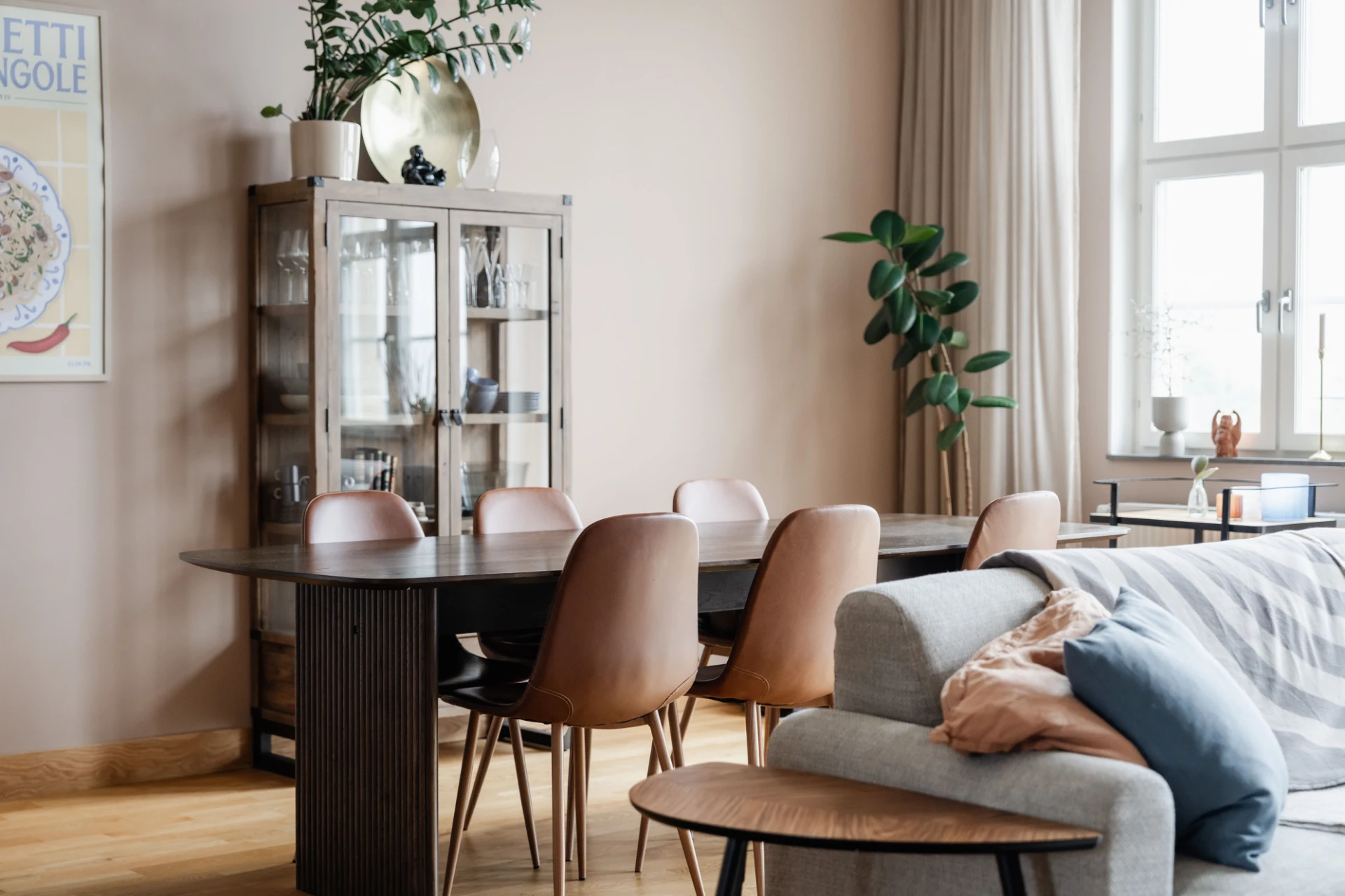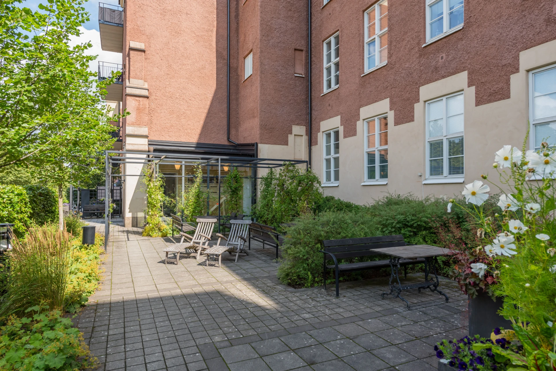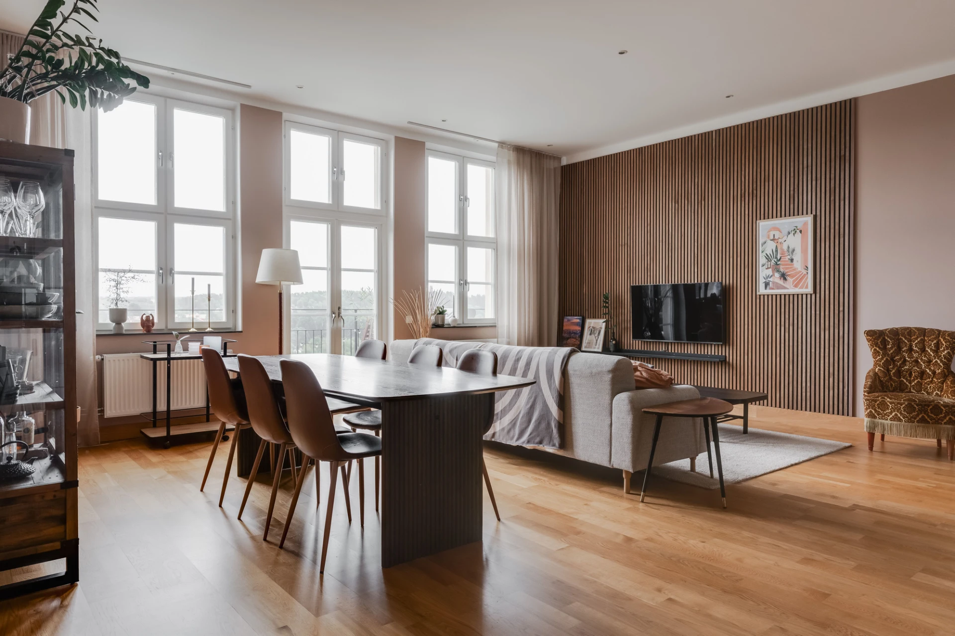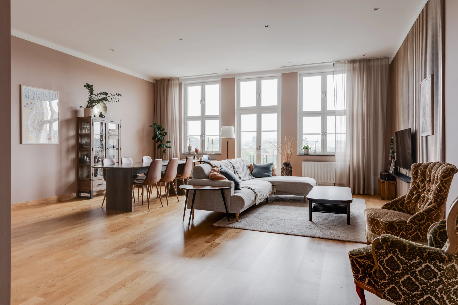 Vidare in i bostaden möts man av det stora, luftiga vardagsrummet på ca 70 kvm som är integrerat med köket.Här har du möjlighet att duka upp till långbord vid högtider och middagsbjudningar för nära och kära. Dessutom ryms en stor soffgrupp. Målade väggar med en snygg akustikpanel vid tv-delen. På golvet ligger det ett parkettgolv. I taket sitter det spotlights. Här når du bostadens balkong som är rymlig med plats för bord, stolar och grill. Tack vare de stora fönsterpartierna flödar dagsljuset fritt. Från vardagsrummet har man utgång till den mysiga balkongen med milsvid utsikt över trädtopparna och Göta. Ta med frukostbrickan ut och njut av morgon- och förmiddagssolen.