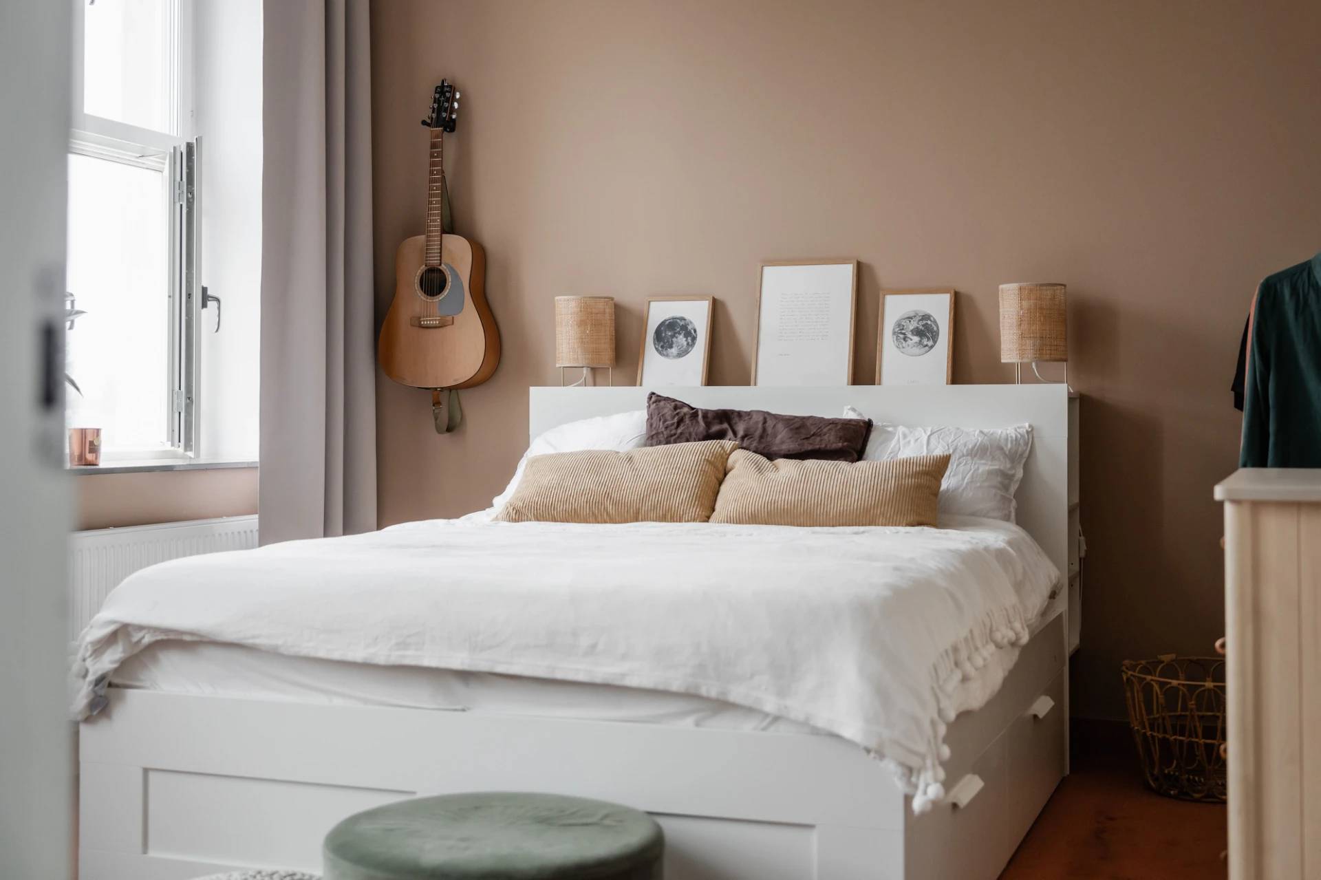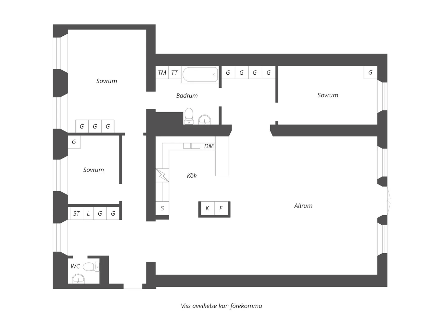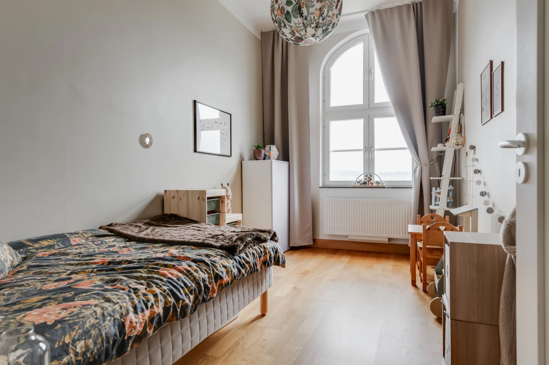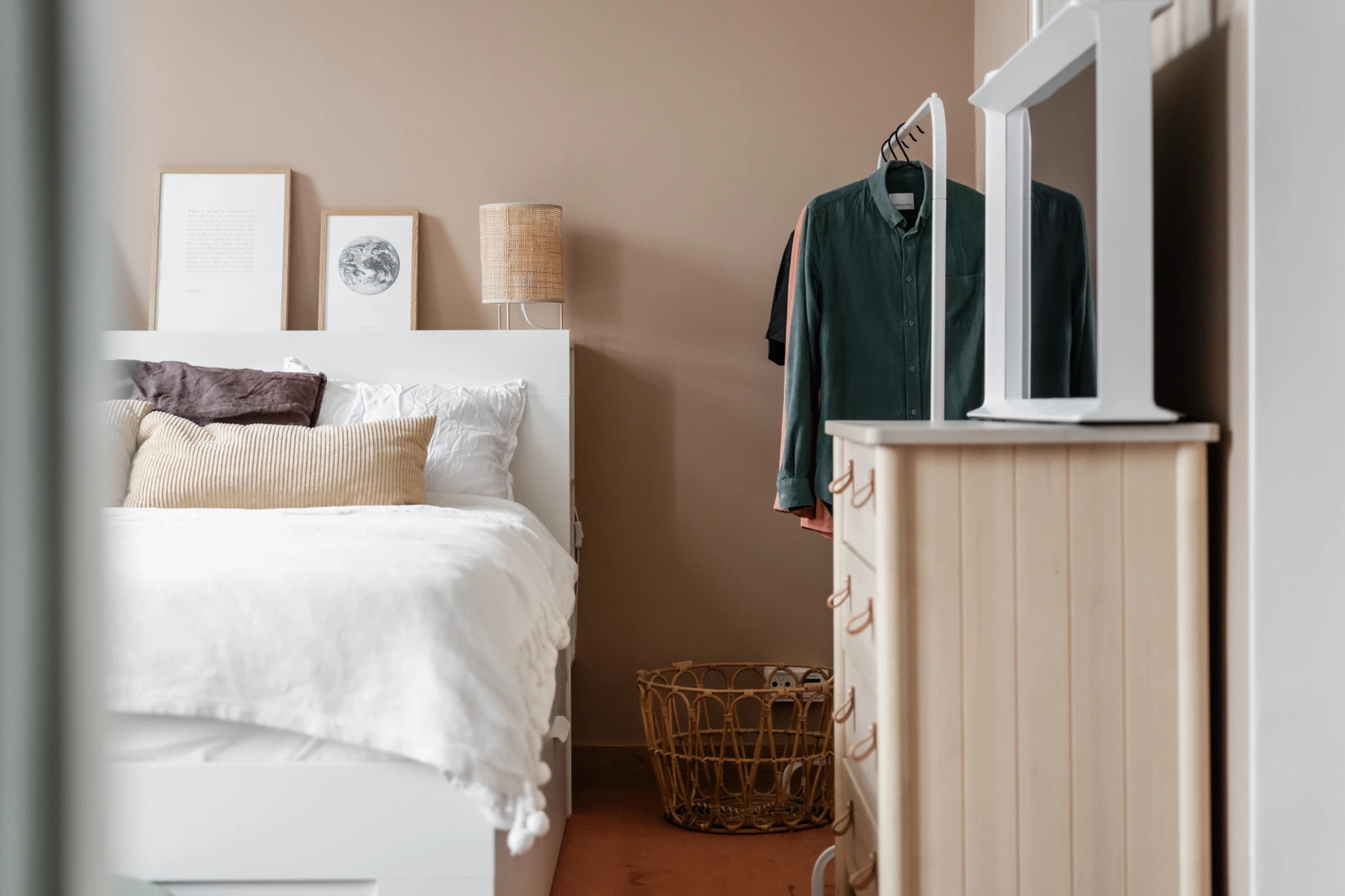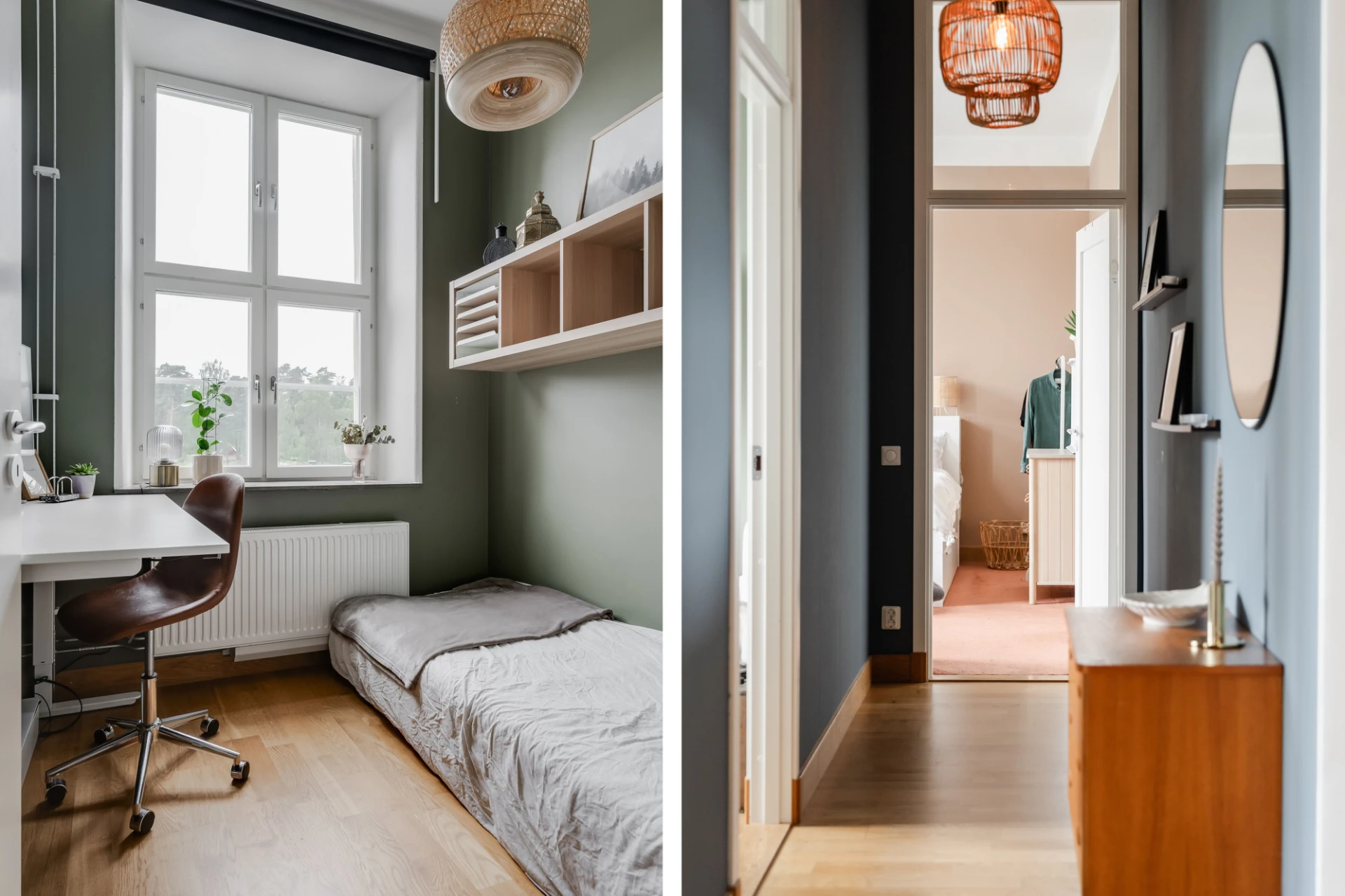 Bostadens första sovrum är idag inrett med enkelsäng och garderober till förvaring. Perfekt storlek för hemmakontor, barnrum eller gästrum. Inred efter eget behov och önskemål.