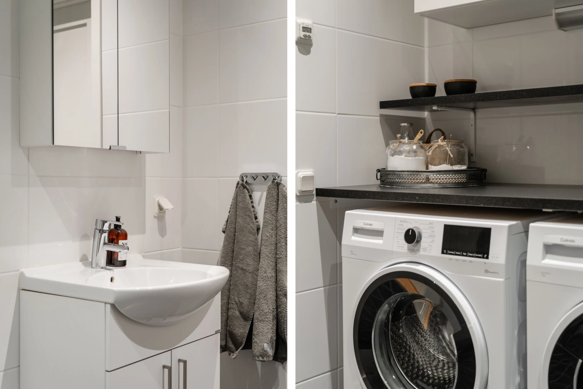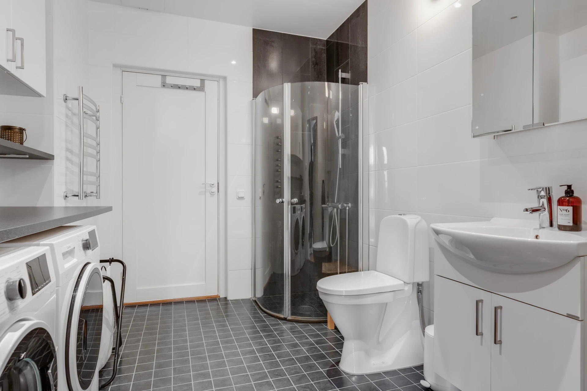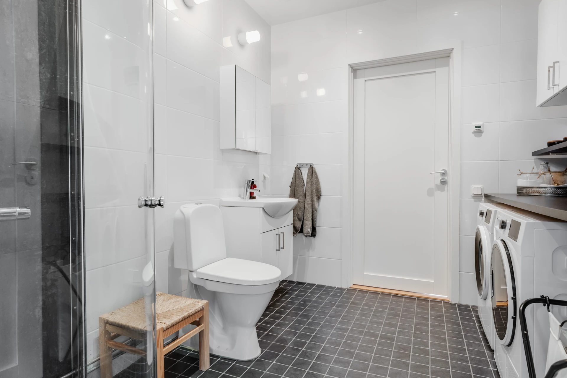 Helkaklat badrum med ett mörkare klinkergolv och golvvärme, vitt kakel på väggarna samt mörkare plattor i duschzonen. Badrumsinredningen består av kommod, WC samt dusch. I badrummet finns en praktisk tvättavdelning utrustad både med tvättmaskin och torktumlare, arbetsbänk och överskåp till förvaring.