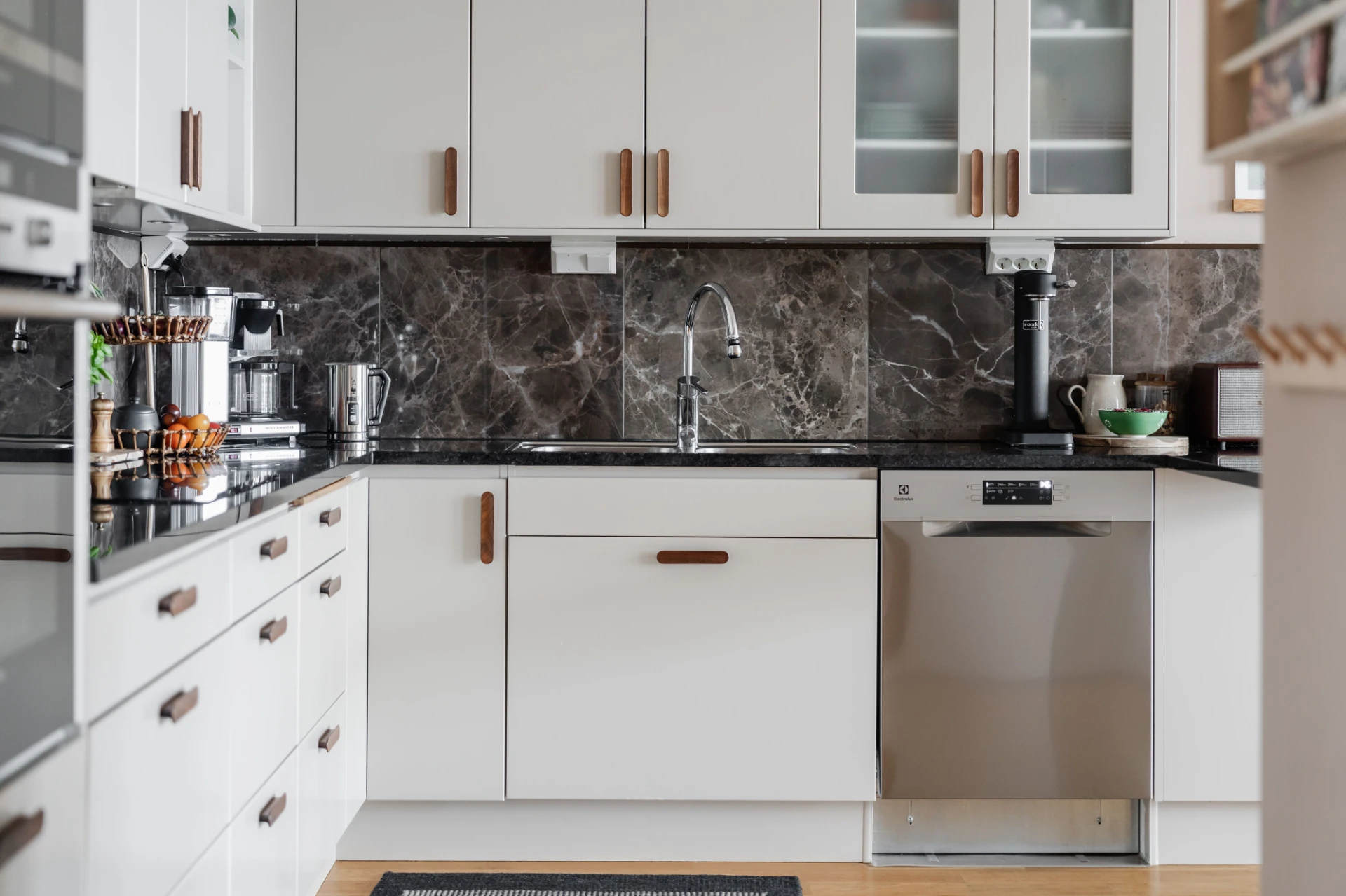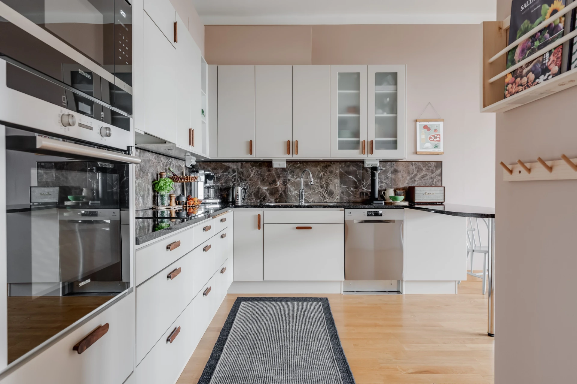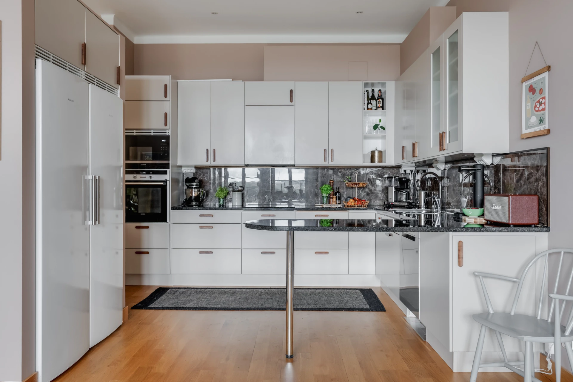 Välplanerat kök i vinkel från Vedum där inredningen består av ljusa luckor och bänkskiva i sten. Mellan bänkskiva och överskåp sitter det kakelplattor. Här finns det gott om förvaring- och arbetsyta där köksbänken förlängs och skapar en extra trevlig samlingspunkt tillsammans med vänner medans maten står och puttrar på spisen. Köket har full maskinell utrustning så som induktionshäll, fläkt, ugn och mikro i ergonomisk arbetshöjd, diskmaskin samt kyl och frys i fullhöjd. Köket är uppfräschat under 2022 med nylackade köksluckor och nytt kakel.