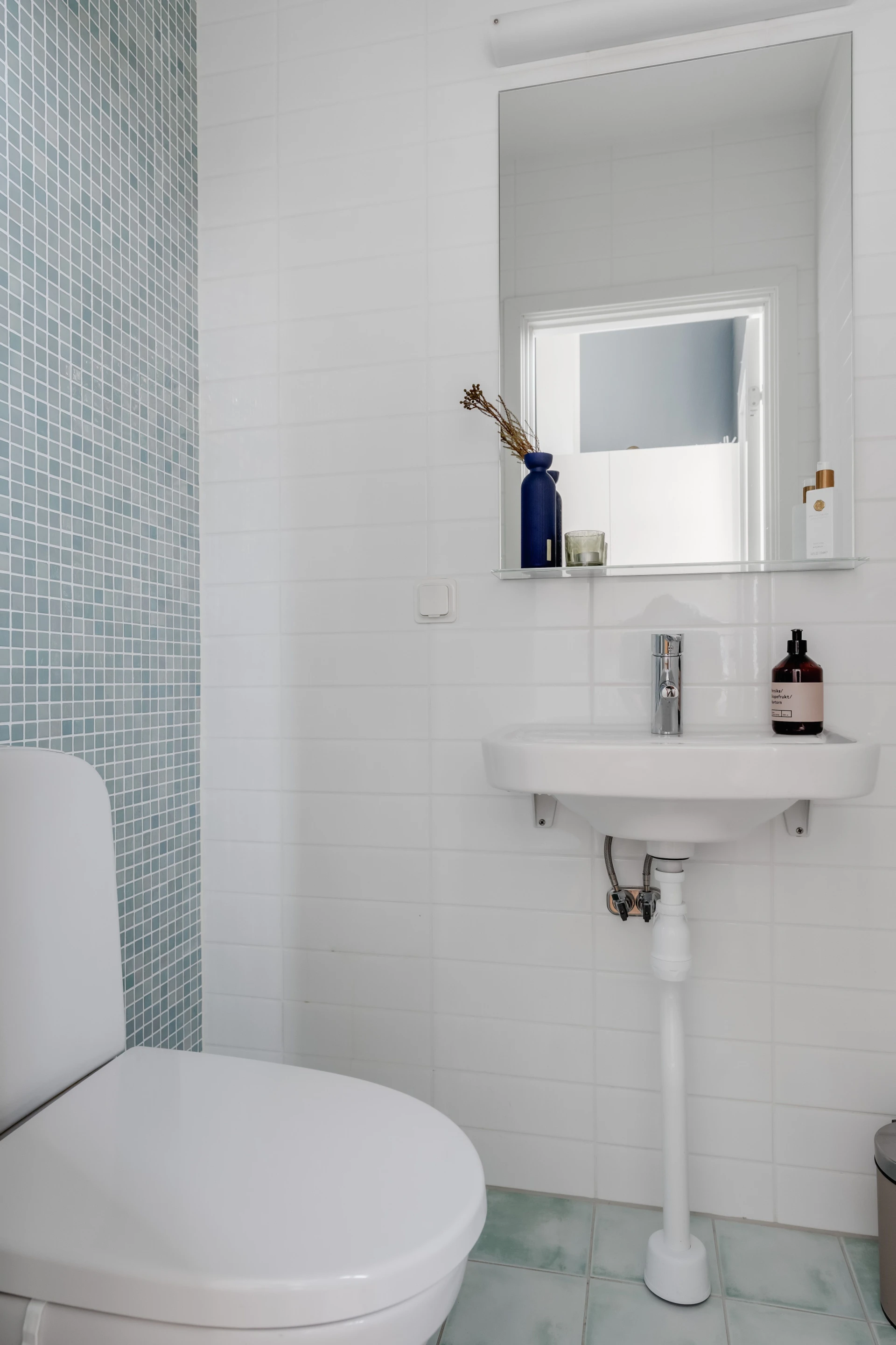 I anslutning till hallen finns en gäst-WC. Klinkergolv och vita kaklade väggar med mossaik grön vägg bakom wc-stolen.
